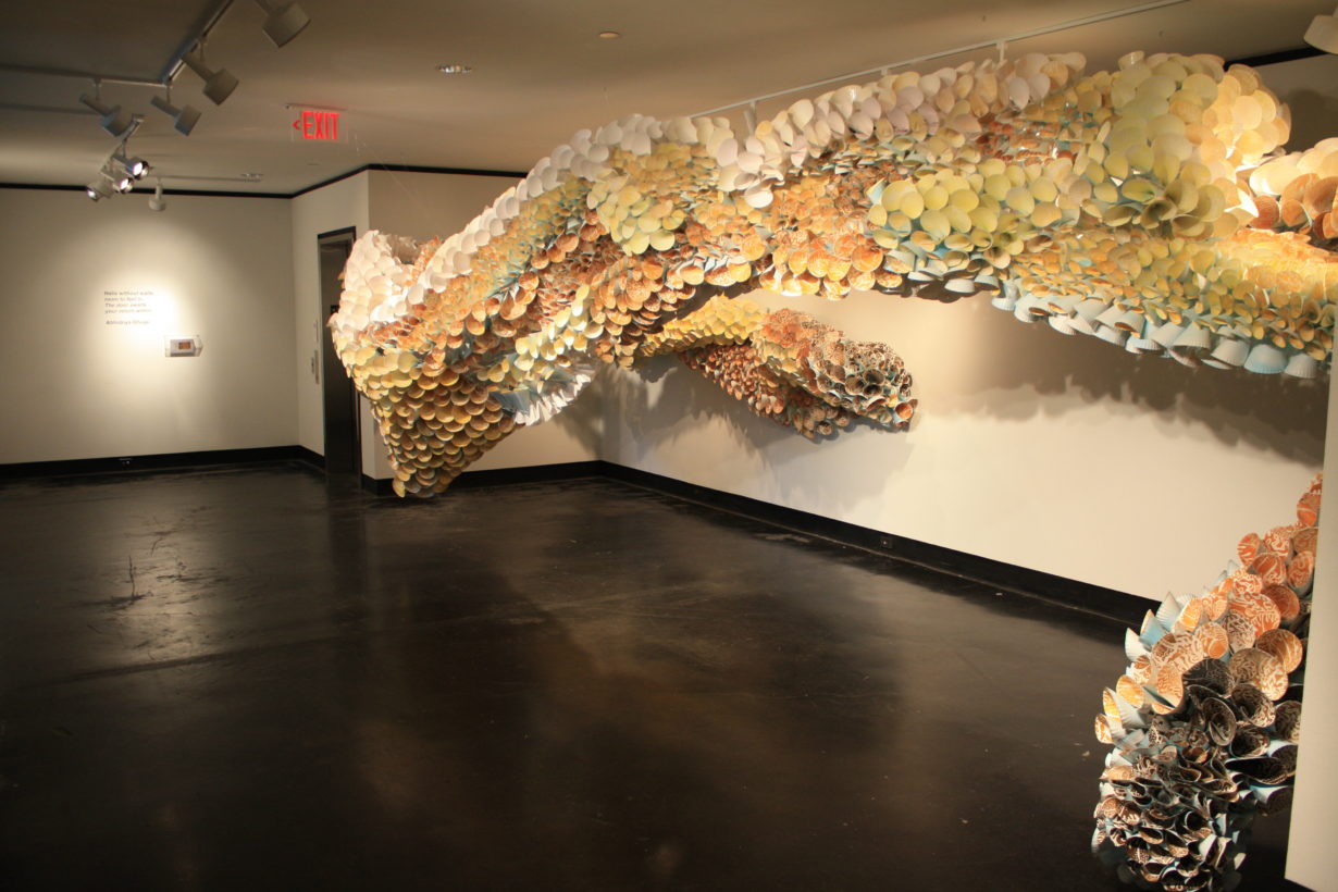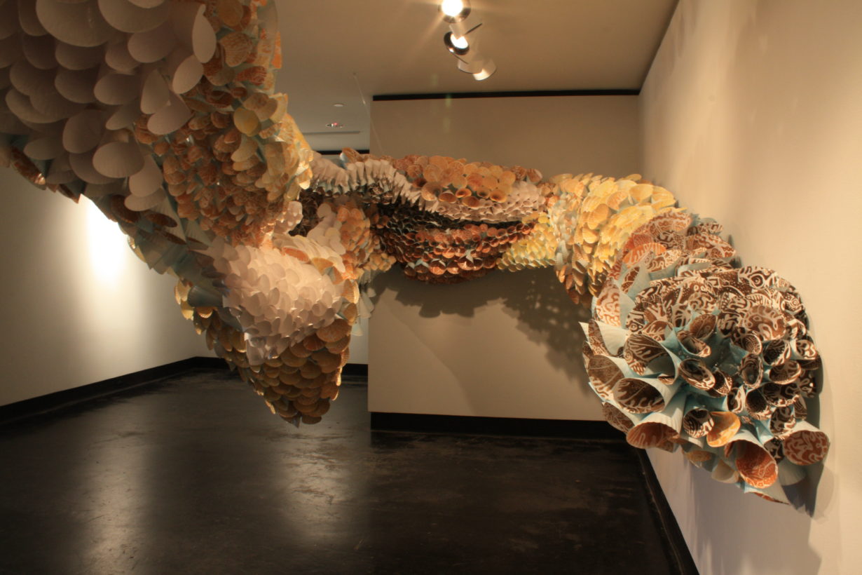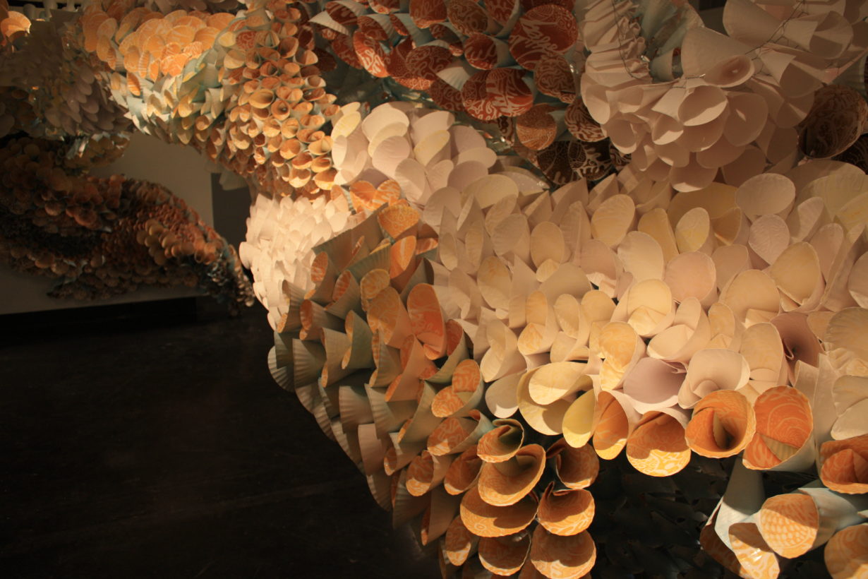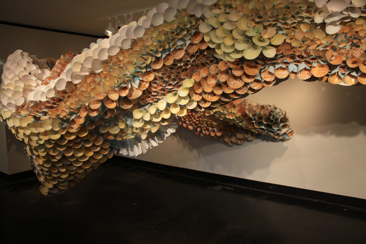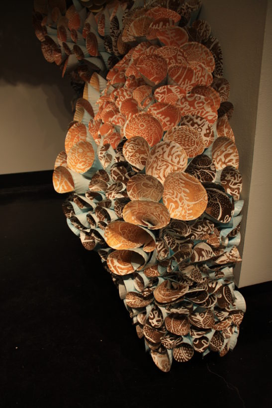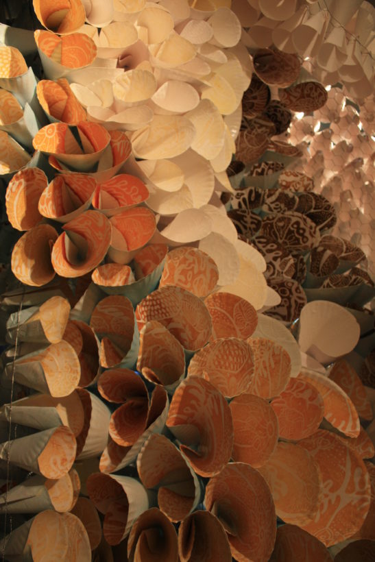 Abhidnya Ghuge’s installation begins with an original wood block carving that is printed on thousands of paper plates, which are transformed through simple folds to create a larger organic form. For Ghuge, the meditative process of carving the woodblock, printing, and transformation of the paper plates suggests the possibility of preciousness and indispensable beauty. The site-specificity of the installation allows the form to change, thus echoing the global and ever-changing nature of “home” in today’s fast pace, mobile culture.