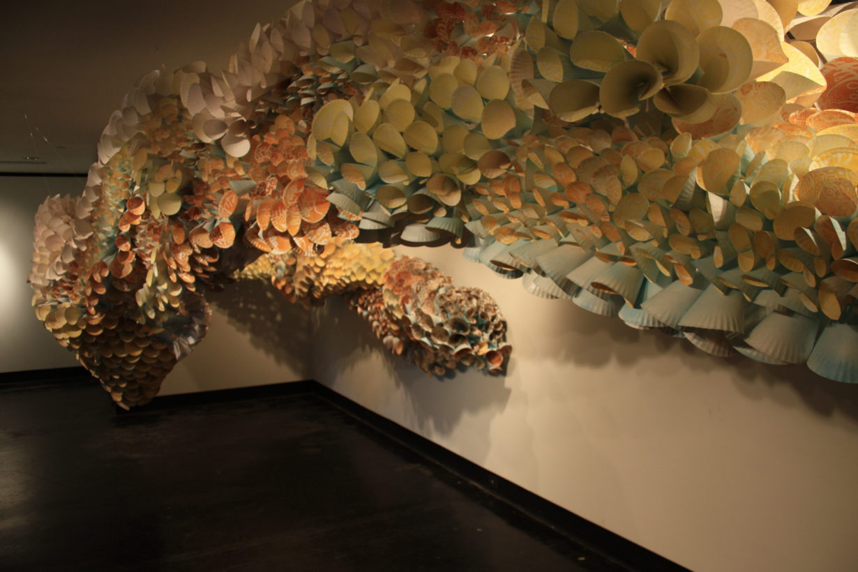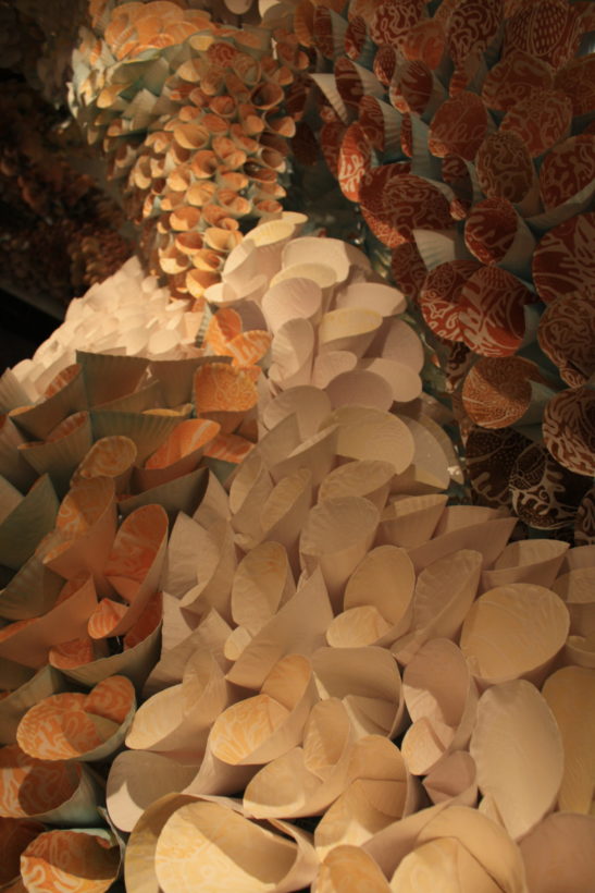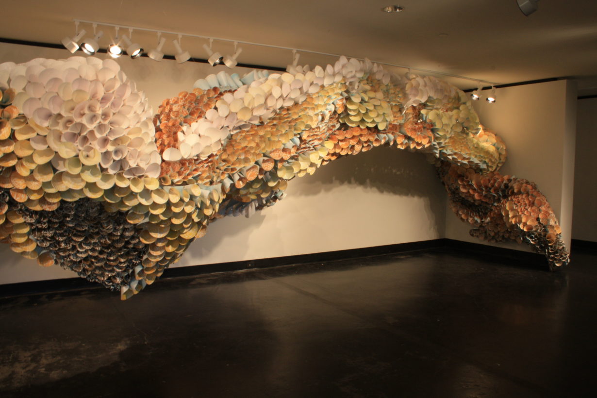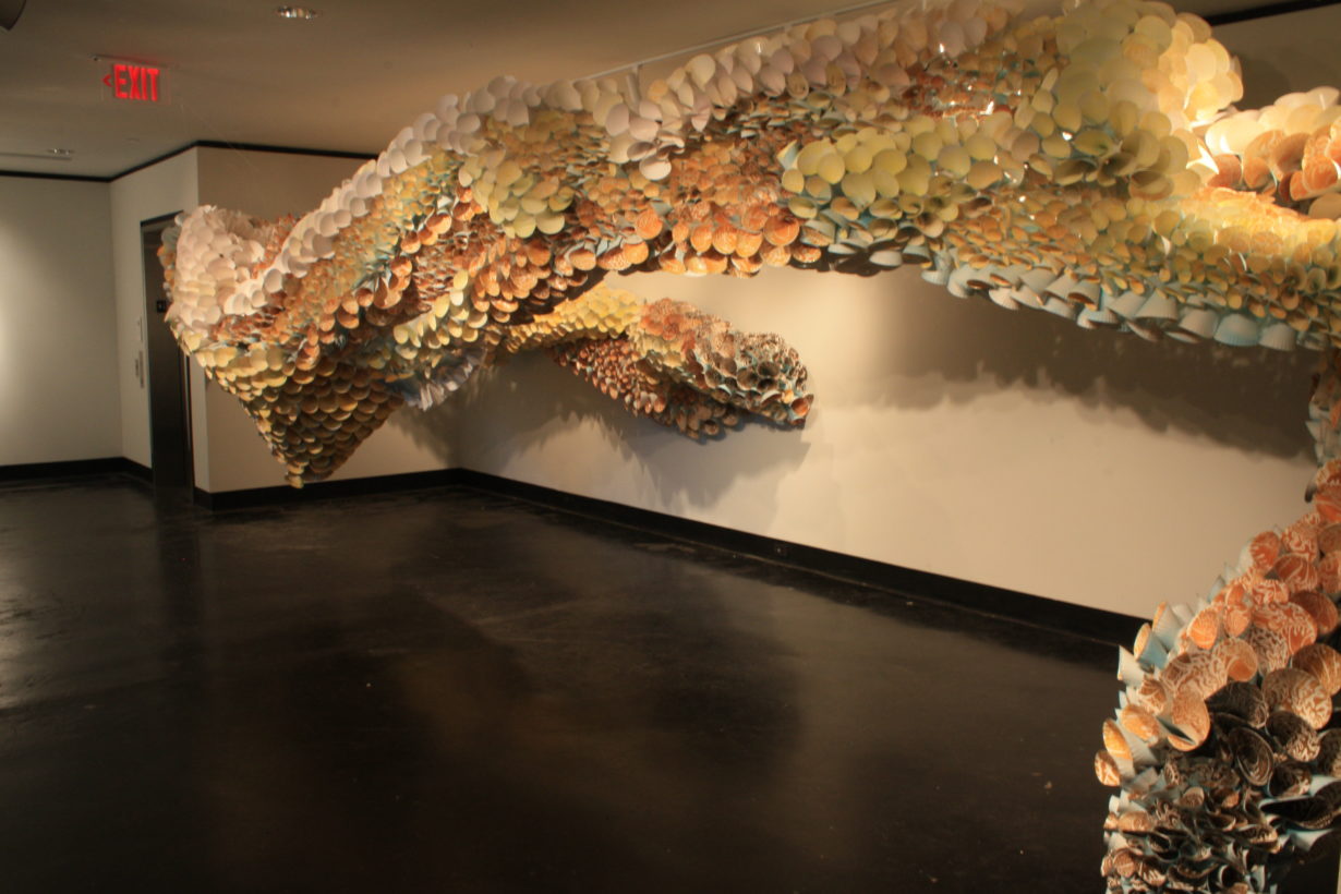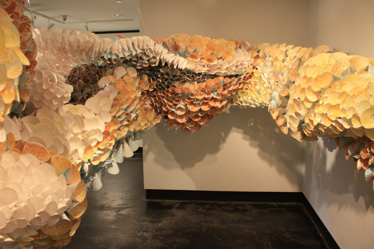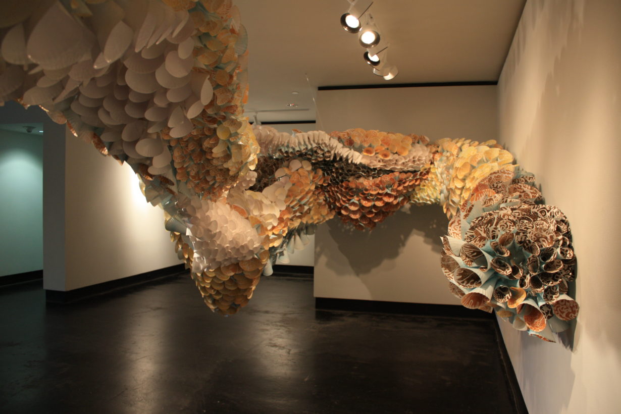 Abhidnya Ghuge’s installation begins with an original wood block carving that is printed on thousands of paper plates, which are transformed through simple folds to create a larger organic form. For Ghuge, the meditative process of carving the woodblock, printing, and transformation of the paper plates suggests the possibility of preciousness and indispensable beauty. The site-specificity of the installation allows the form to change, thus echoing the global and ever-changing nature of “home” in today’s fast pace, mobile culture.