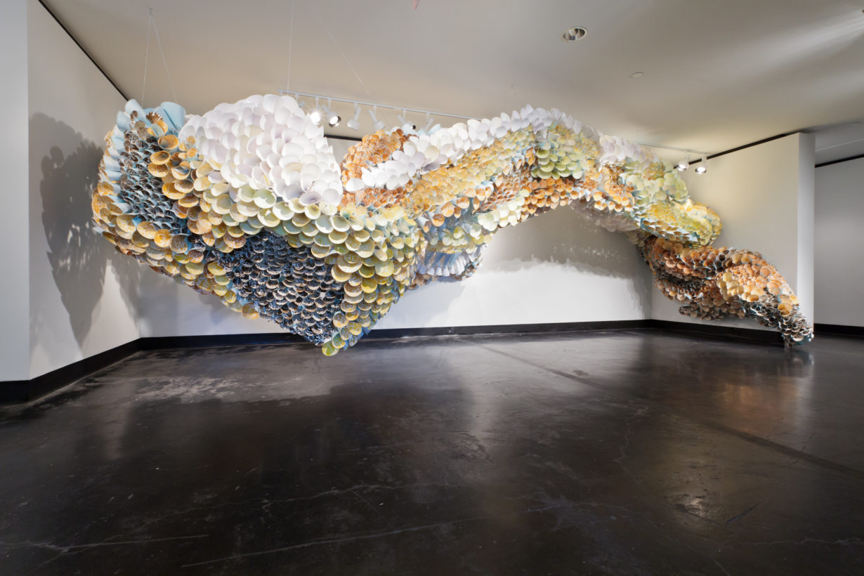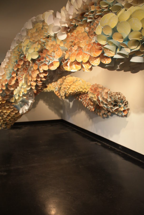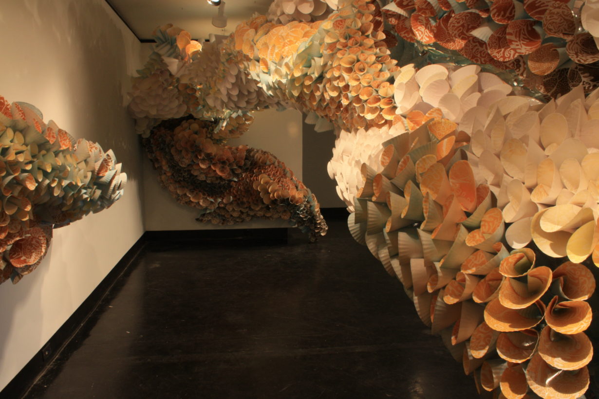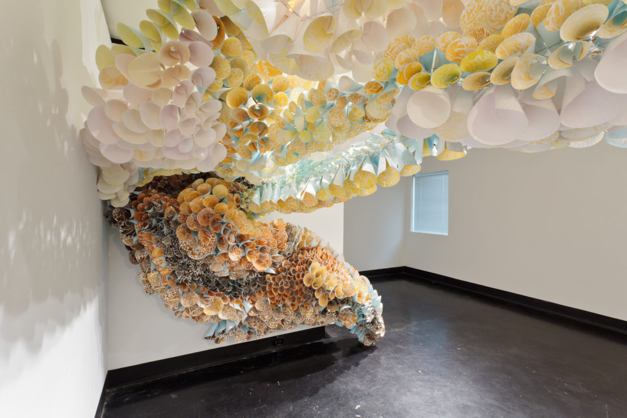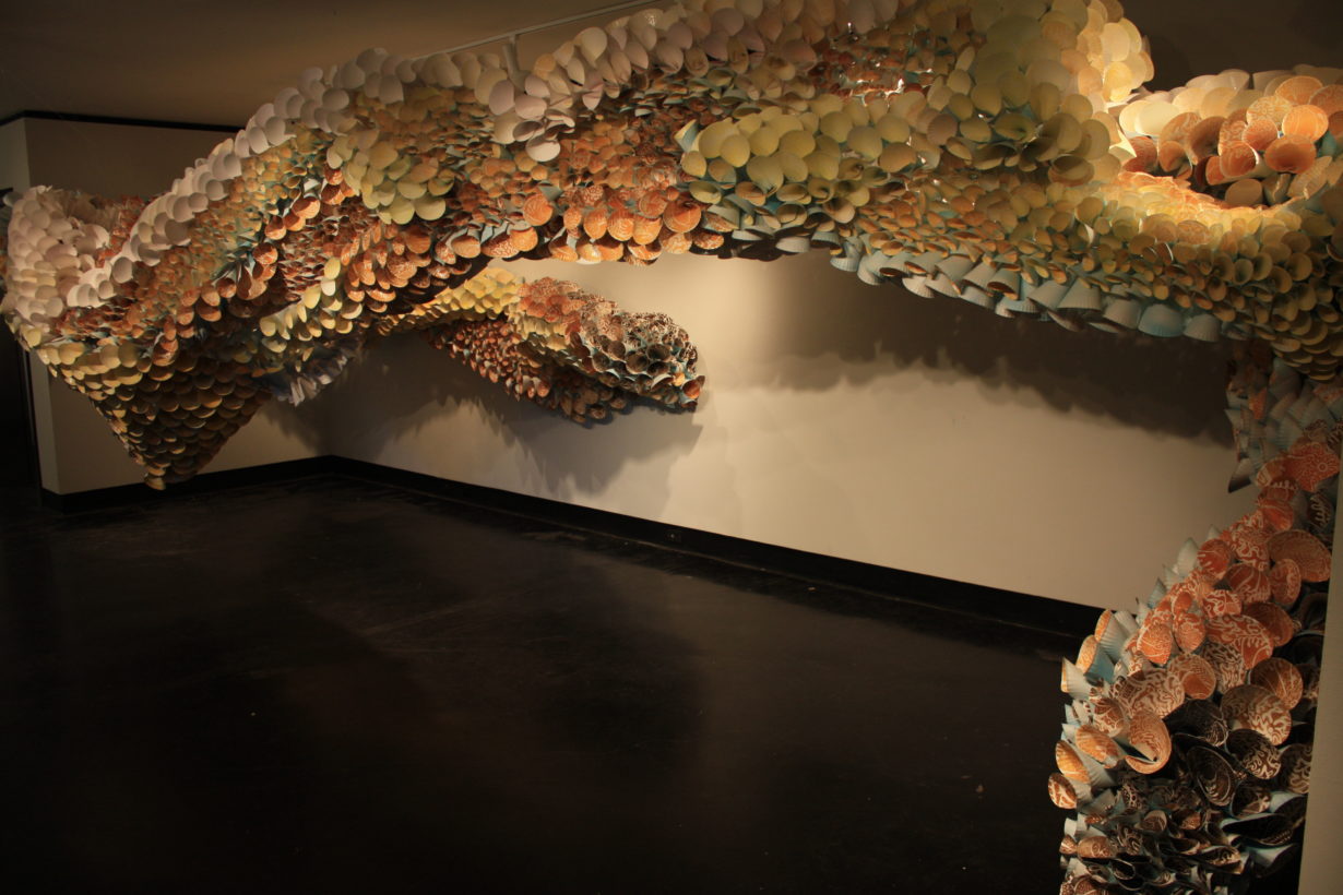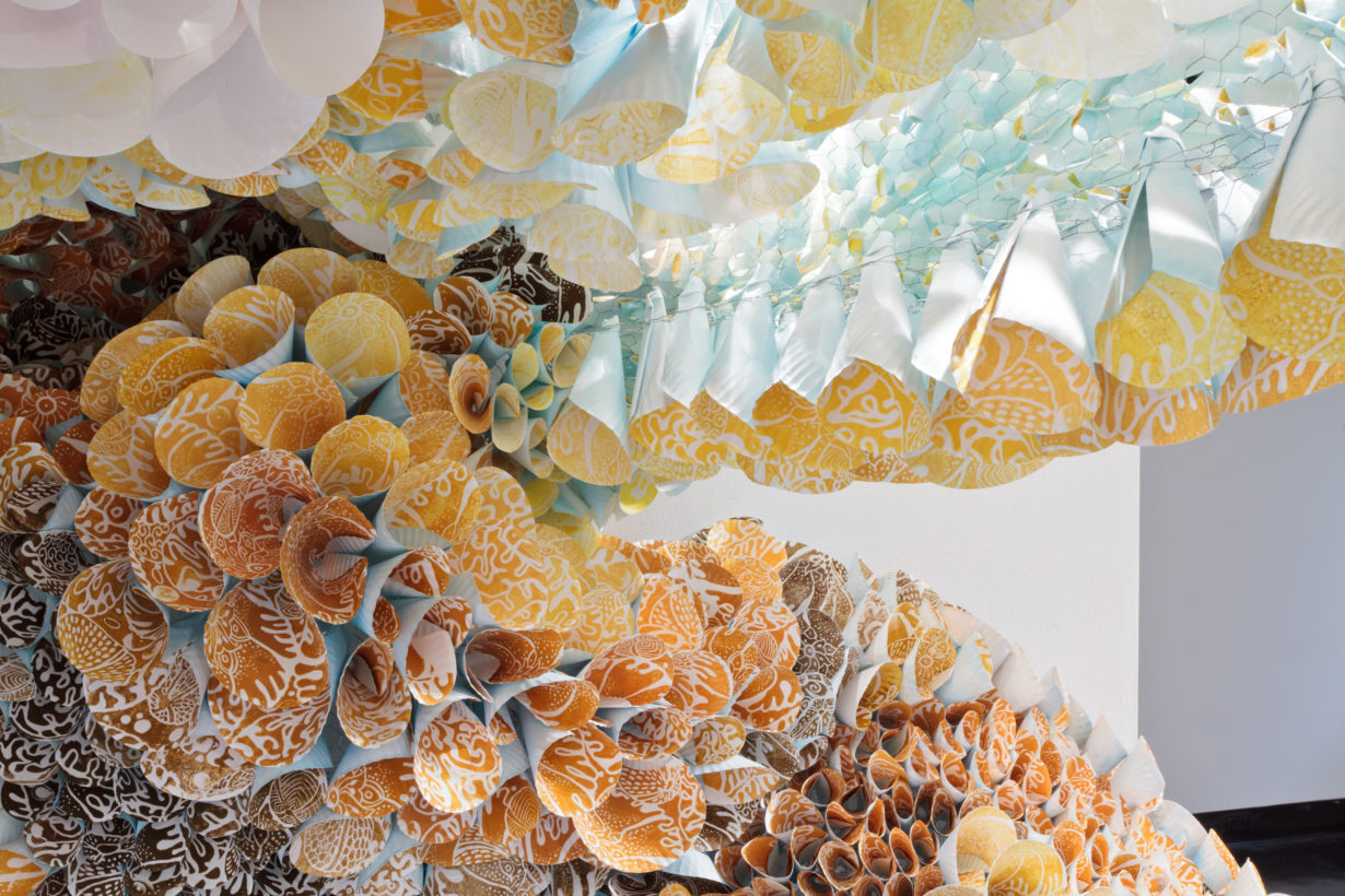 Abhidnya Ghuge’s installation begins with an original wood block carving that is printed on thousands of paper plates, which are transformed through simple folds to create a larger organic form. For Ghuge, the meditative process of carving the woodblock, printing, and transformation of the paper plates suggests the possibility of preciousness and indispensable beauty. The site-specificity of the installation allows the form to change, thus echoing the global and ever-changing nature of “home” in today’s fast pace, mobile culture.