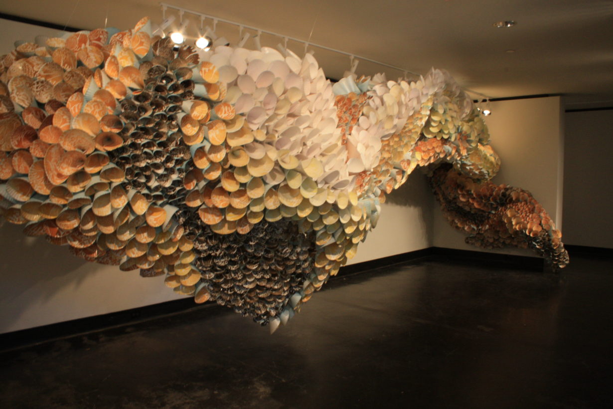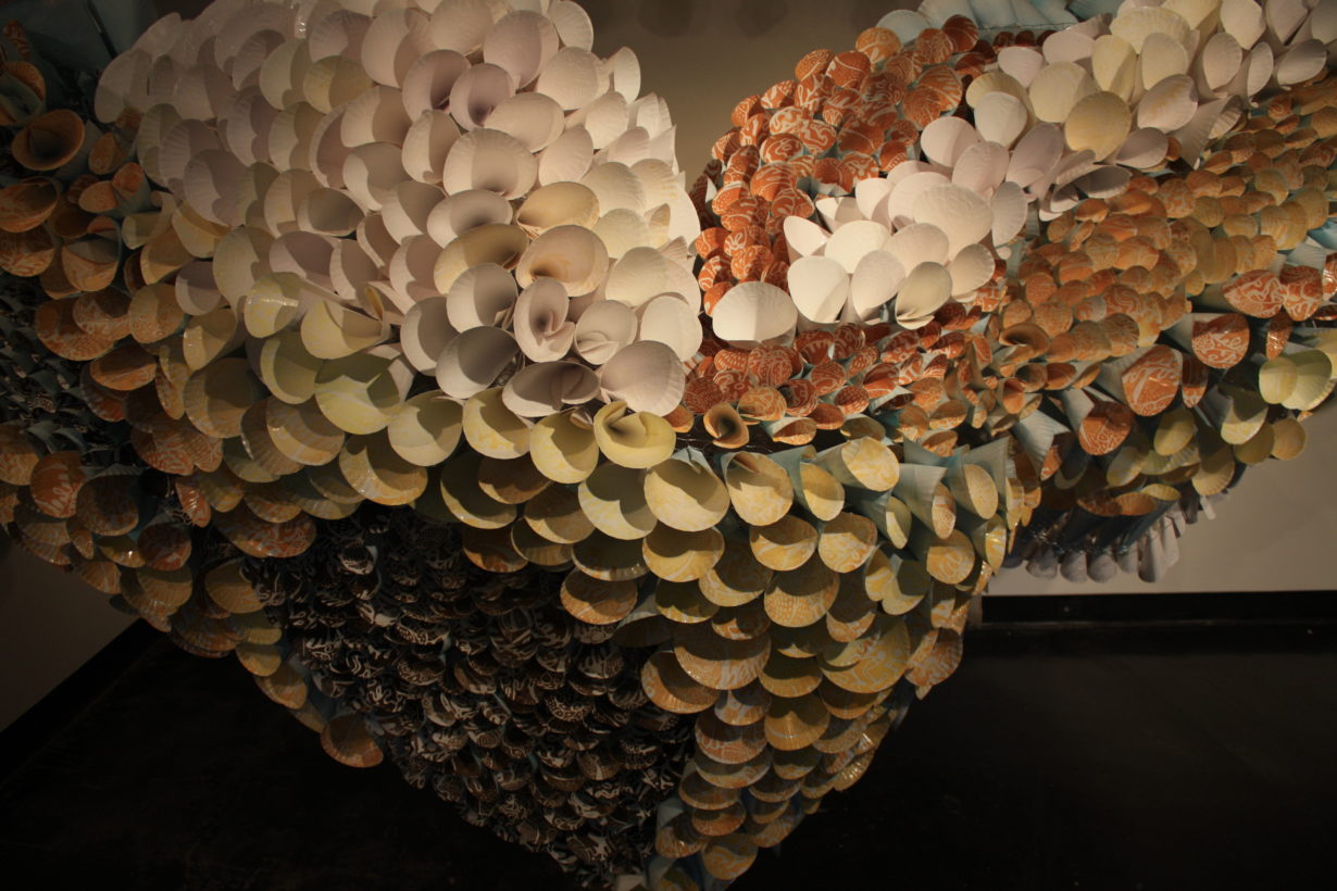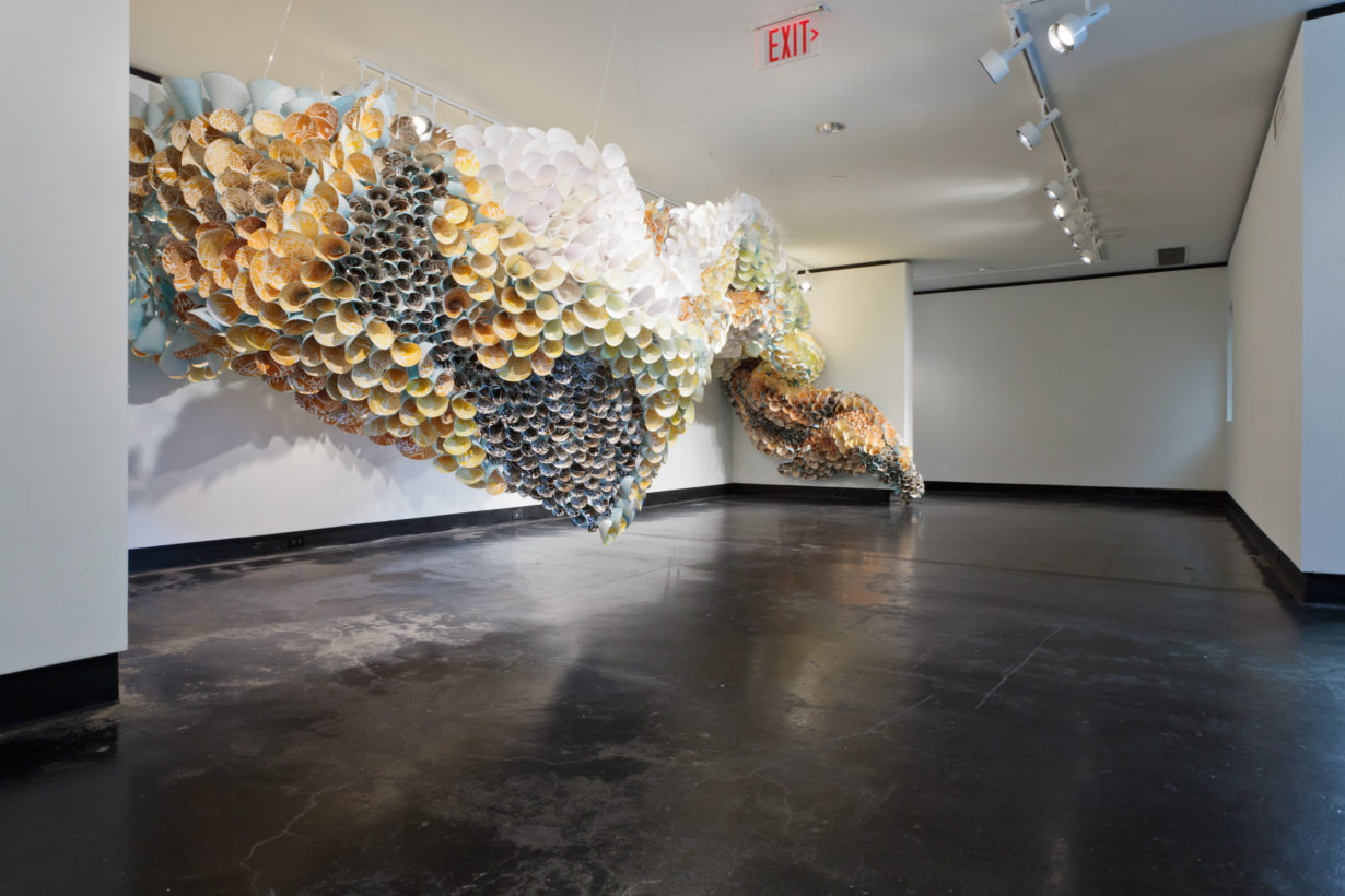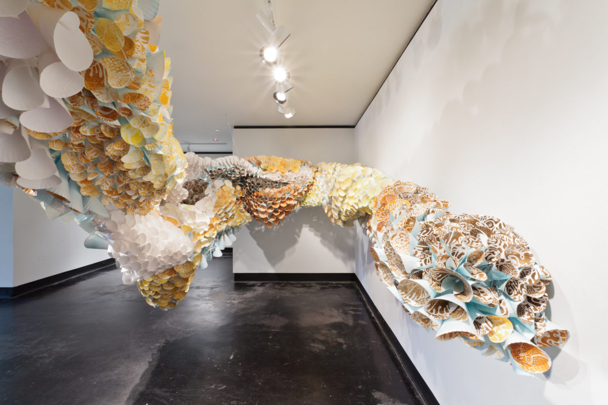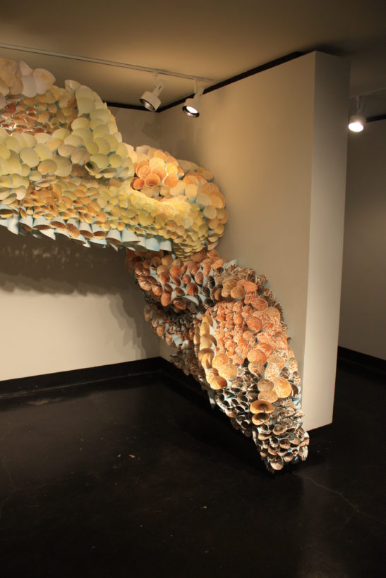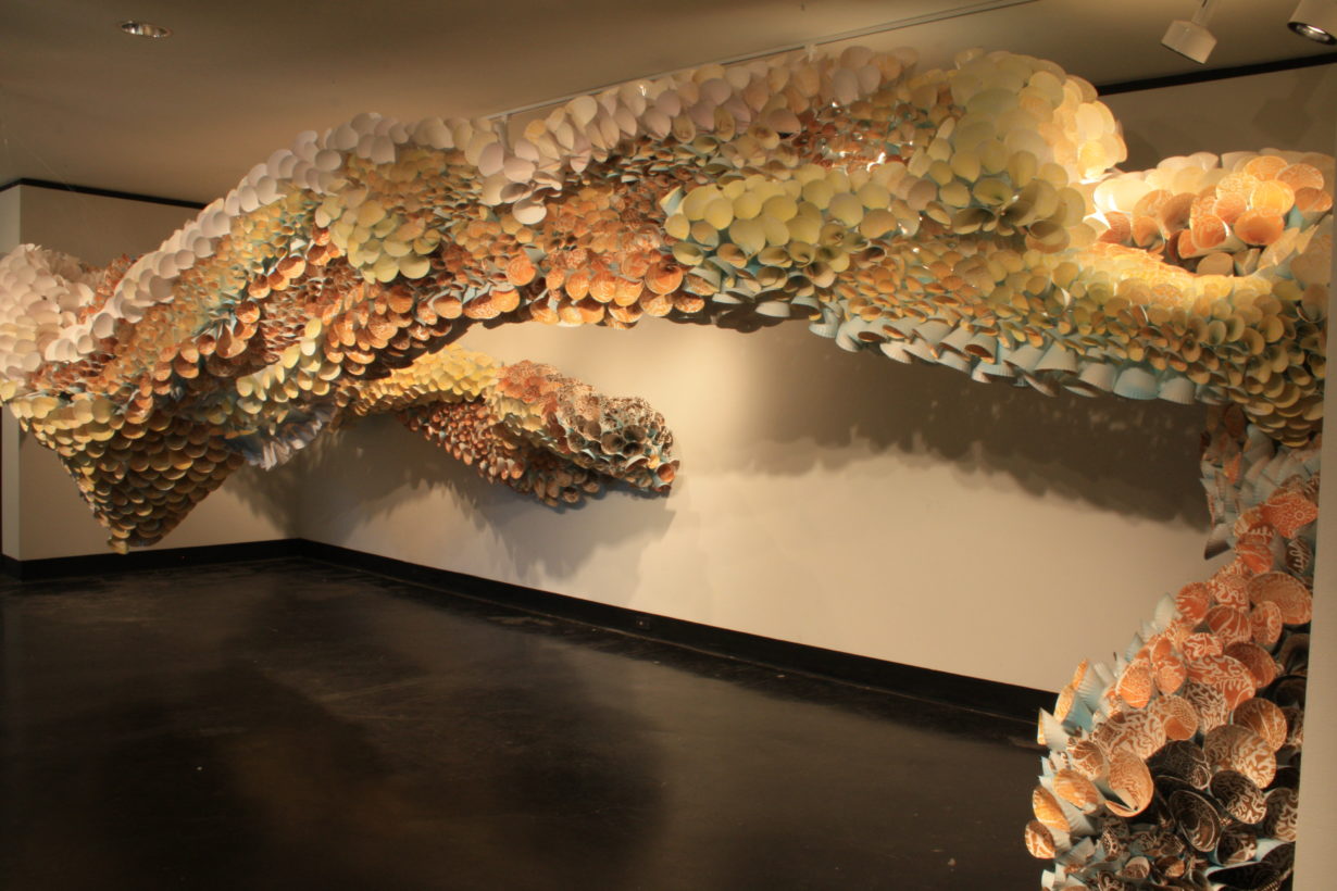 Abhidnya Ghuge’s installation begins with an original wood block carving that is printed on thousands of paper plates, which are transformed through simple folds to create a larger organic form. For Ghuge, the meditative process of carving the woodblock, printing, and transformation of the paper plates suggests the possibility of preciousness and indispensable beauty. The site-specificity of the installation allows the form to change, thus echoing the global and ever-changing nature of “home” in today’s fast pace, mobile culture.