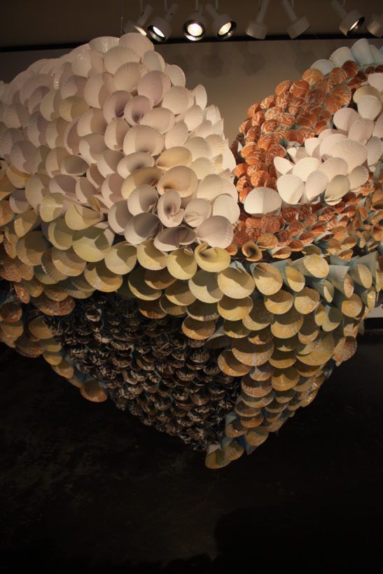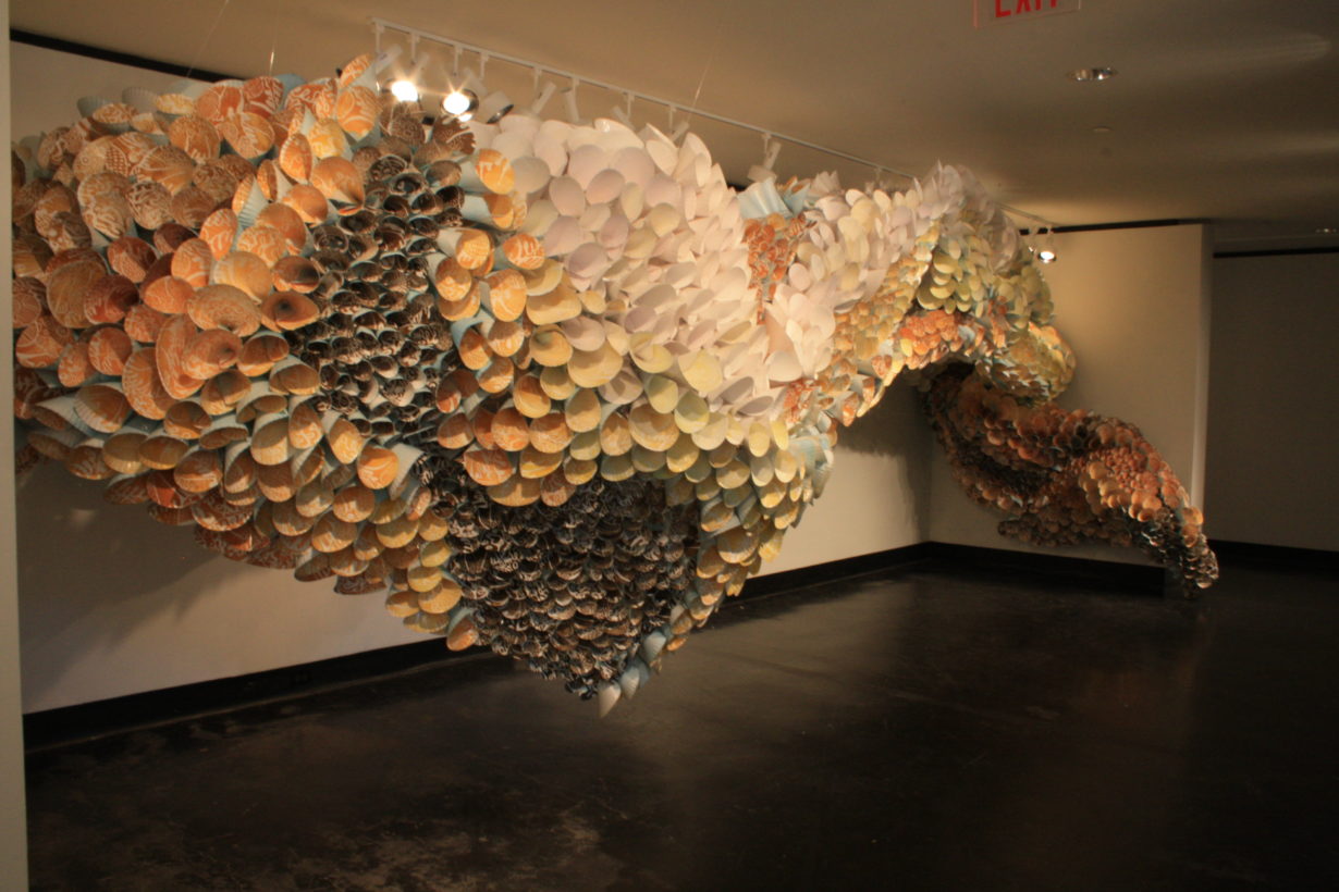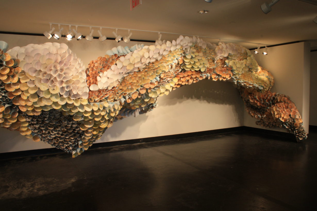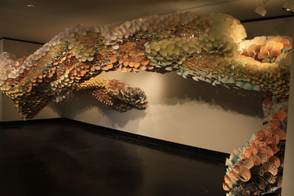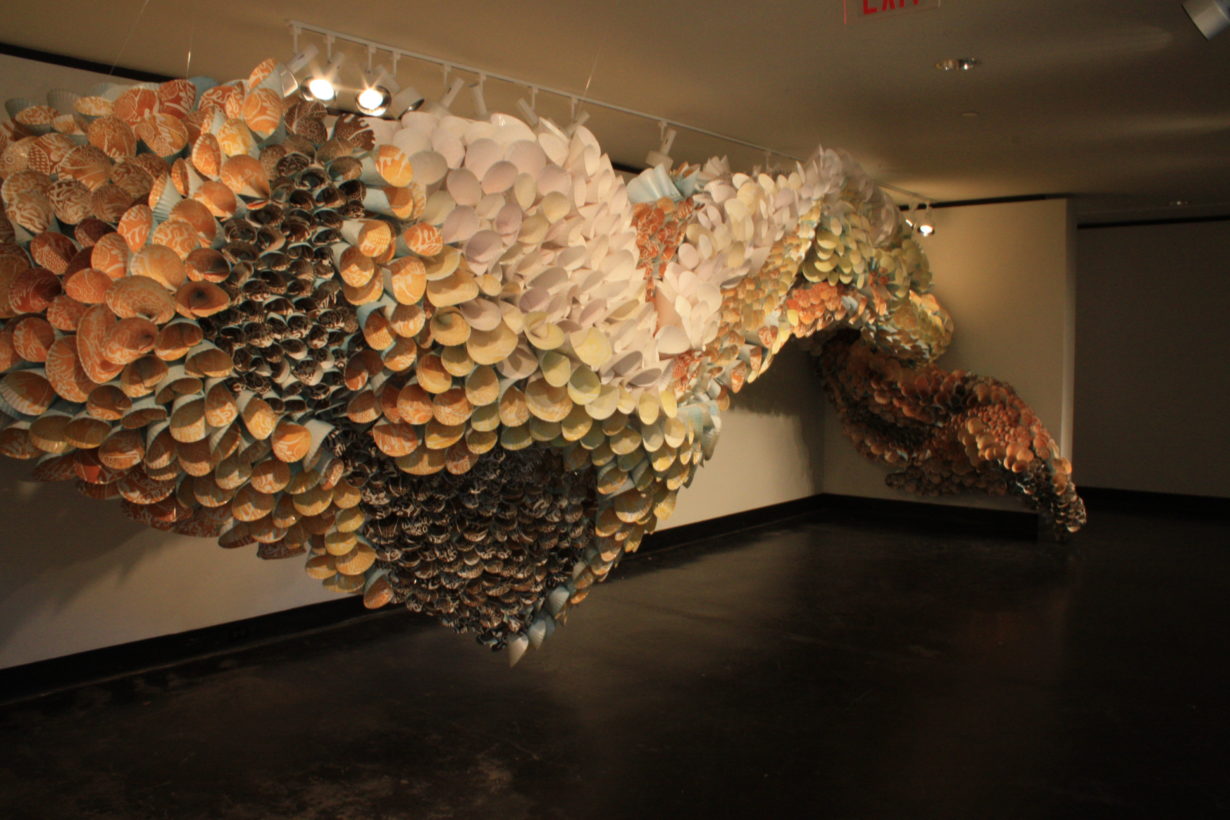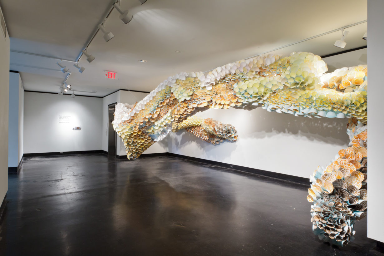 Abhidnya Ghuge’s installation begins with an original wood block carving that is printed on thousands of paper plates, which are transformed through simple folds to create a larger organic form. For Ghuge, the meditative process of carving the woodblock, printing, and transformation of the paper plates suggests the possibility of preciousness and indispensable beauty. The site-specificity of the installation allows the form to change, thus echoing the global and ever-changing nature of “home” in today’s fast pace, mobile culture.