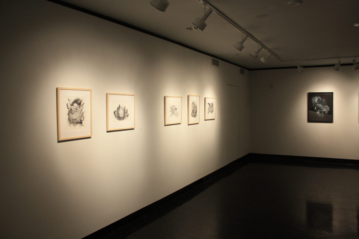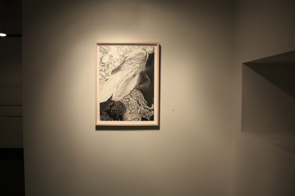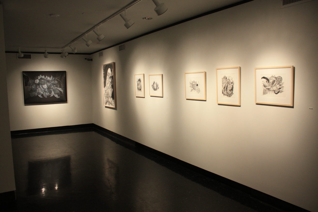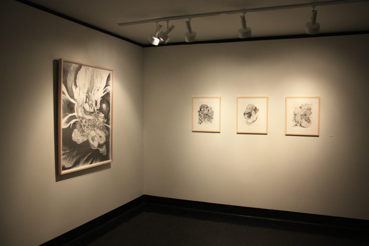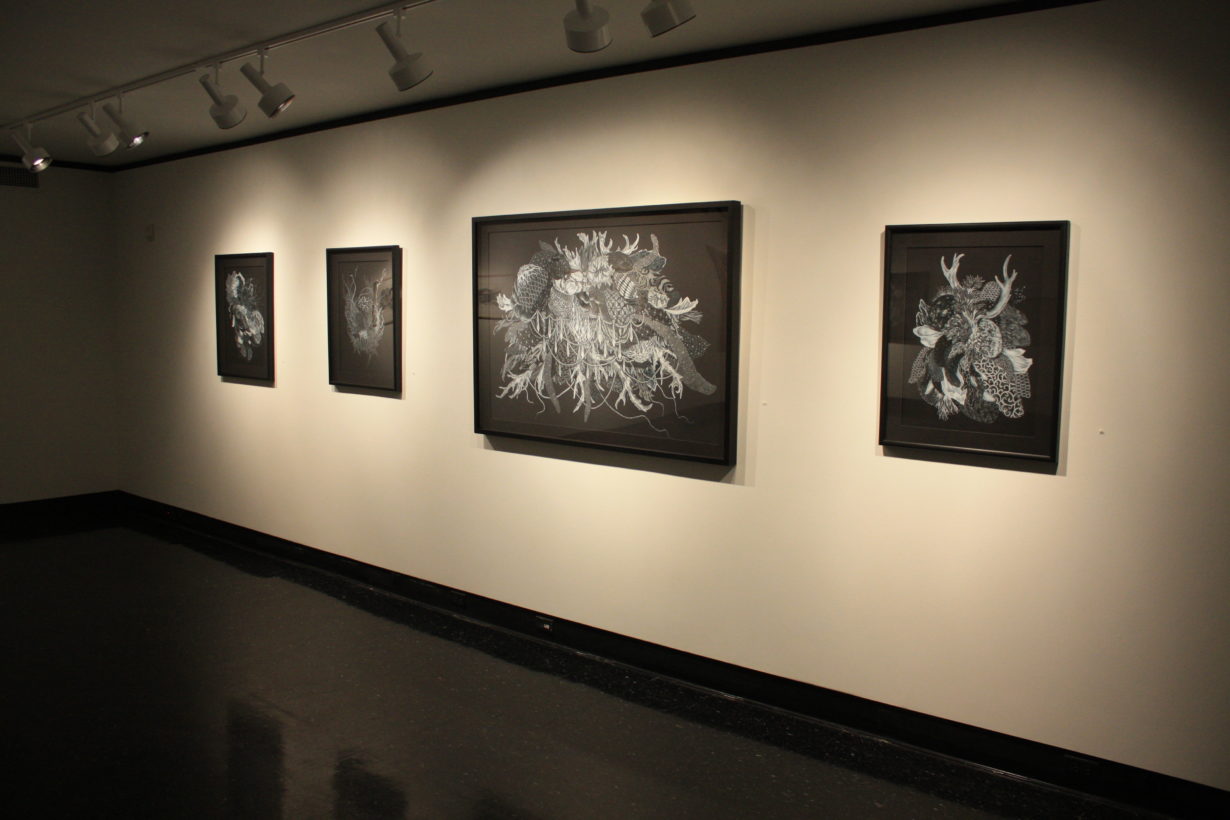 Lonely Hunters is a series of drawings that feature the accumulations, creatures, and hybrids of flora and fauna, in the dark environments that Angela Piehl incorporates into her work. Piehl’s accumulation drawings reference luxury and opulent decay, recombining elaborately decorative elements with organic material like flesh, hair, tentacles, eggs, fat, bone, muscle, crystalline structures, and wood. The title, Lonely Hunters, references the Southern Gothic literary genre, and like characters within the genre, Piehl’s creatures are solitary– at once seductive and repellant, grotesque and beautiful. Piehl’s pieces include large-scale framed graphite drawings, mid-sized and large-scale white and grey pencil on black paper drawings, and small-scale graphite drawings.