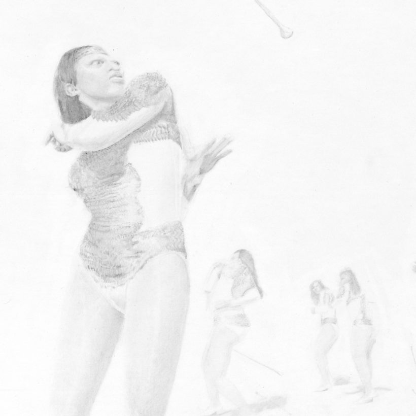 “During this Studio Residency Program, I immersed myself into the subject of street band and marching band culture through creating drawings, modifying uniforms, doing research, engaging with networks of bands, and participating with an unconventional street band with ad hocorganization. Dreamlike, yet well defined; the drawings are quiet, subtly tonal, graphite images of asymmetrical marching bands enveloped by the negative space of the paper. While meticulously rendered, the figures seem to drift away into the void of the paper with the gentleness of the gradation. The prototype for utopian centrifuge 1A is comprised of five green modified marching band uniforms with 9 feet detachable joiners, pink face mask/ascots, and accompanying tool set. The suits are a whimsical means of promoting collective task execution. The prototype should be tested by visitors to Lawndale by taking the uniforms off the hangers, while intended to be worn by two or more persons connected by the joiners using the machetes and drumsticks.The video prototype for utopian centrifuge 1Bis a documentation of participants testing the prototype for utopian centrifuge 1A uniform while walking in loops, playing percussive instruments, and chopping shrubs with machetes.The marching bands exist between the regiment of military-like choreography and collective unraveling. Folly, idiosyncrasy, rebellion, and failure emerge as tender documentation of individuation. Ubiquitous with school rallies, military pomp and order, libertine carnival, rebellion, and protest; blending social contradictions, essentially the marching band embodies collective spirit and morale.”
