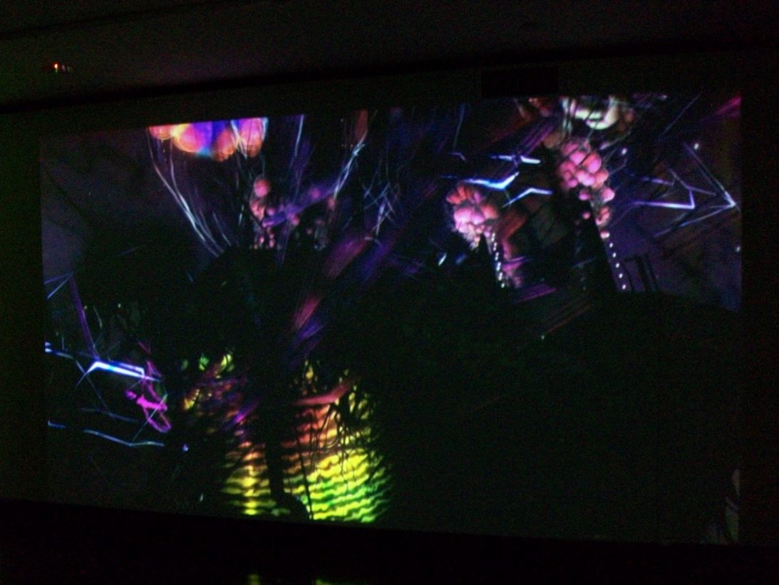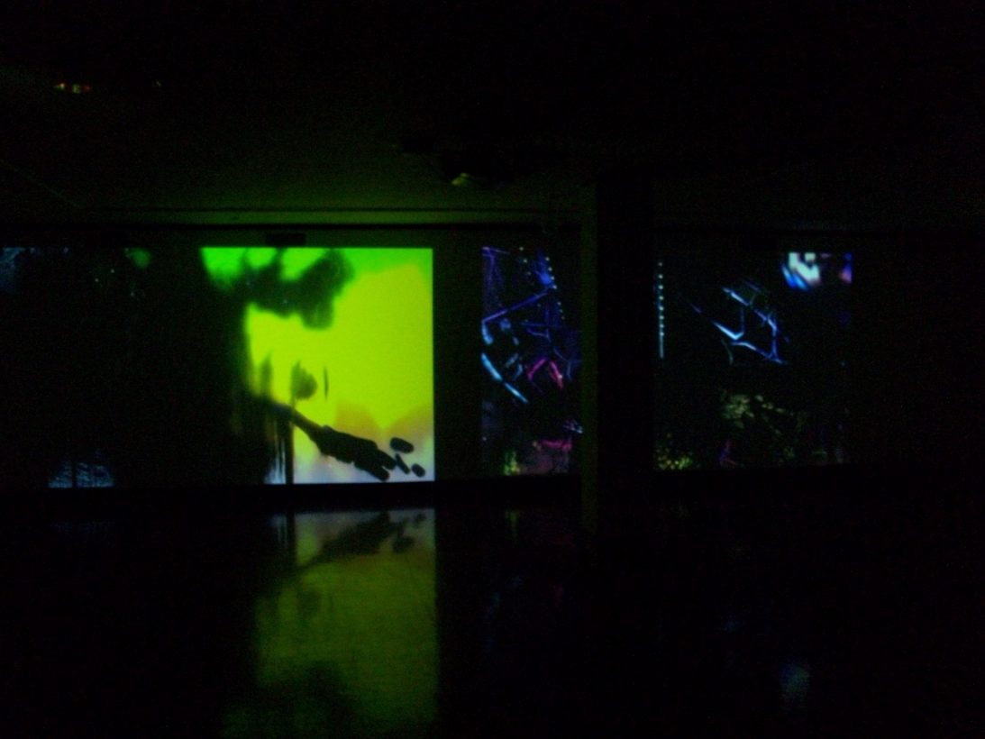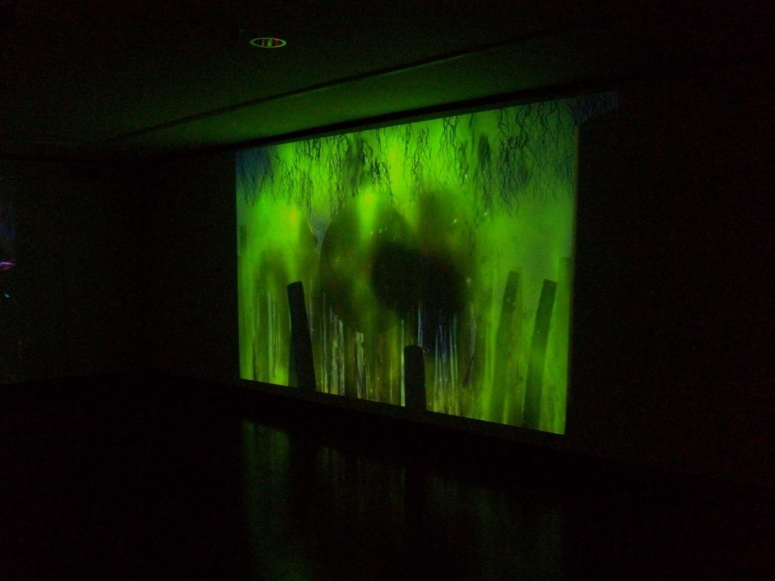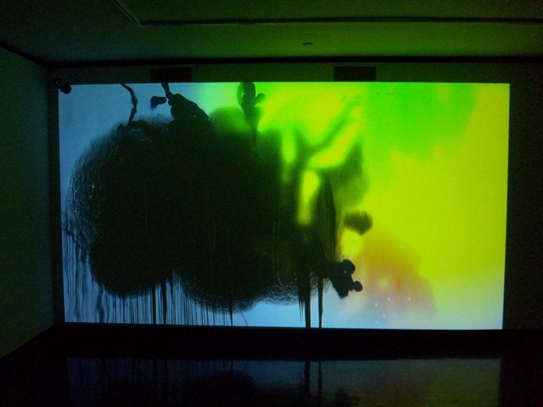 Fugitive Emissions is an installation of large-scale animated paintings with sound that poetically probes the hidden life of petrochemical production. In these animations, abstract gestural brushstrokes collide with the realism of 3d computer graphics. These moving paintings are virtual worlds that blur the distinction between technology and biology. The dependence of our ways of life, especially along the gulf coast, on petrochemical processing and the effects of this production on living systems are the inspiration for this work.