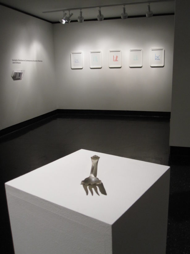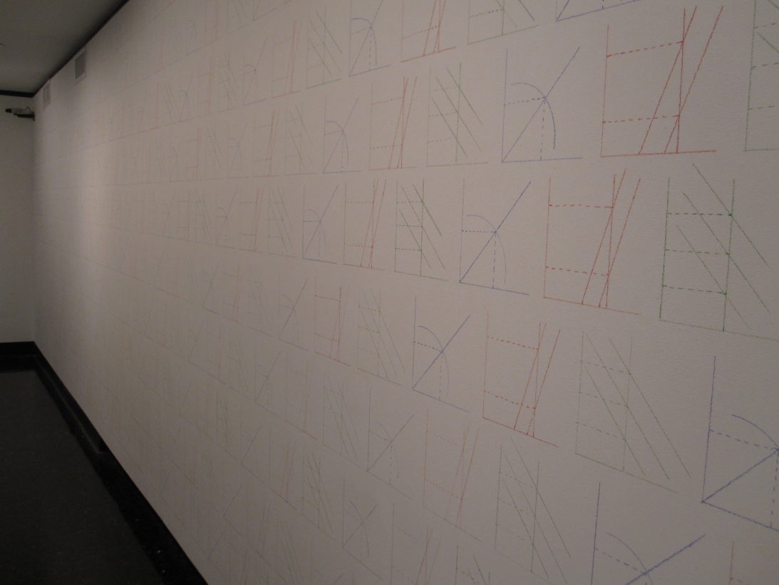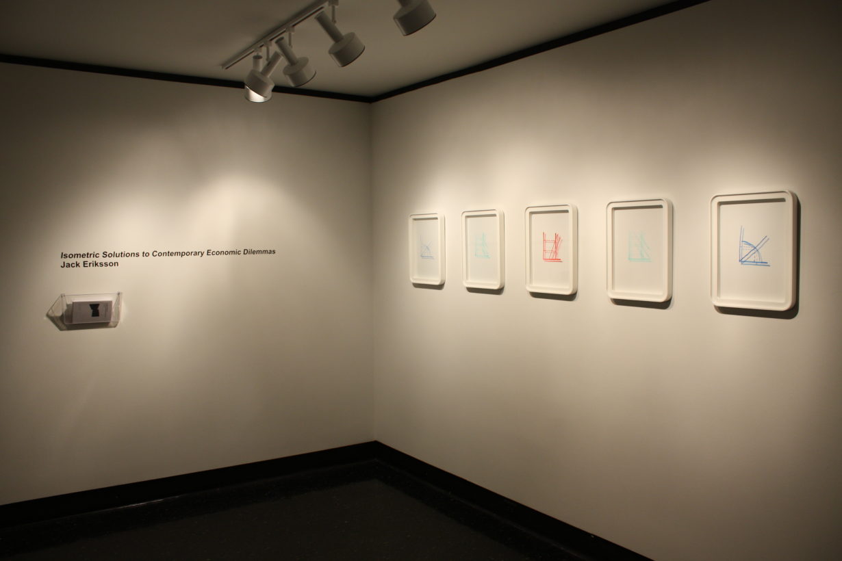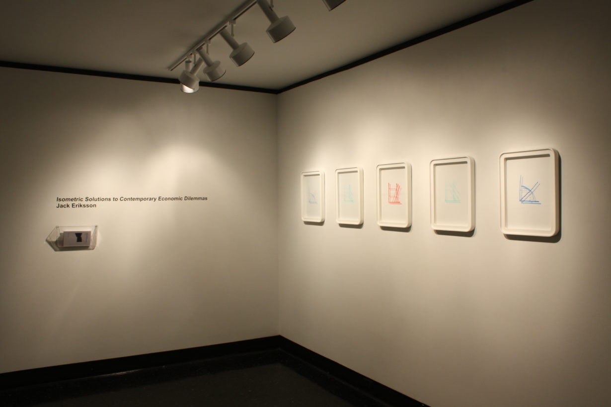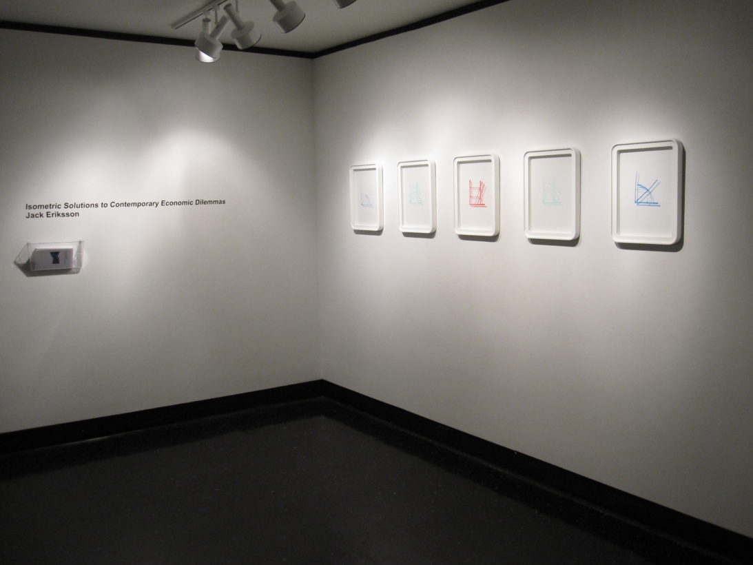 Isometric Solutions to Contemporary Economic Dilemmas will be a full scale installation populated with 2D and 3D representations of economic data. It will show how vulnerable graphics are to unwelcome interpretation based on misguided geometry, Masonic lore and common sense. The work will identify problems and propose solutions by blending the emotional understanding of the public market with the reality of economic depression. The work will be composed primarily of found objects, office furniture, domestic items and a subscription to the Financial Times.