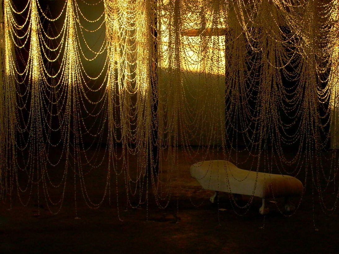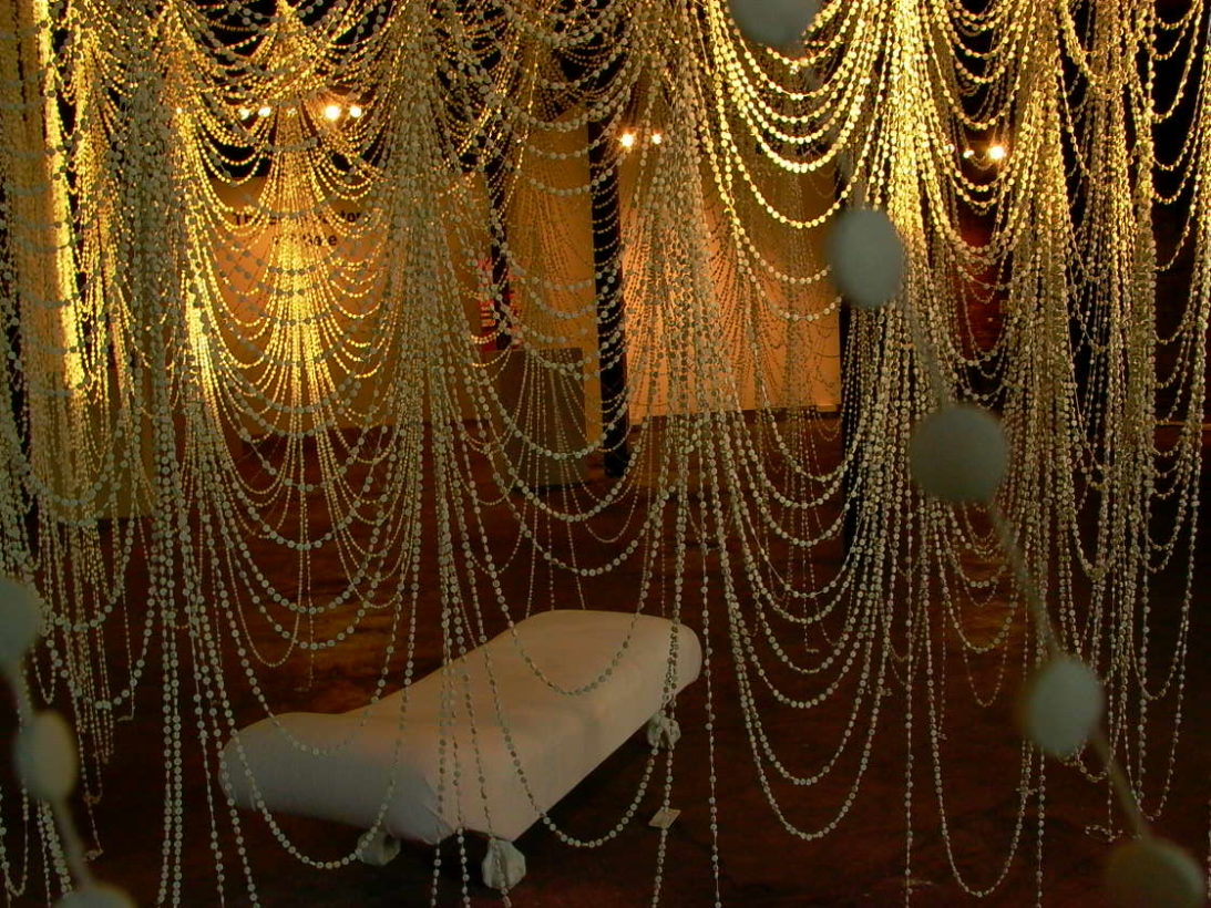 Jennifer Burkley’s Tylenol room (Entitlement / The Past Is Never Dead and Buried) is a large installation consisting of a canopied room hung with multiple garlands of strung white pills. Over 550,000 aspirin went into the creation of this piece, individually drilled and strung like a traditional pearl necklace.