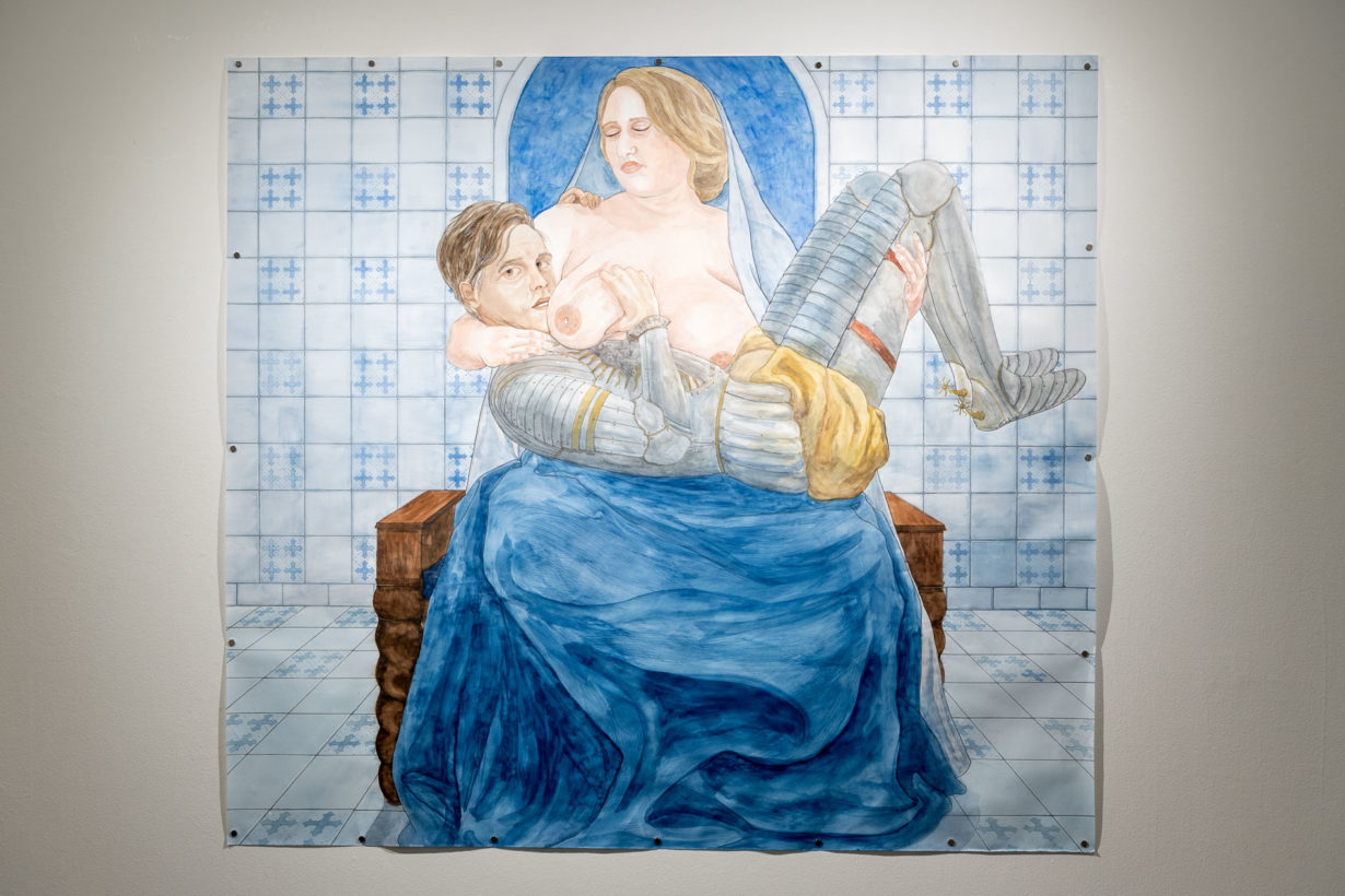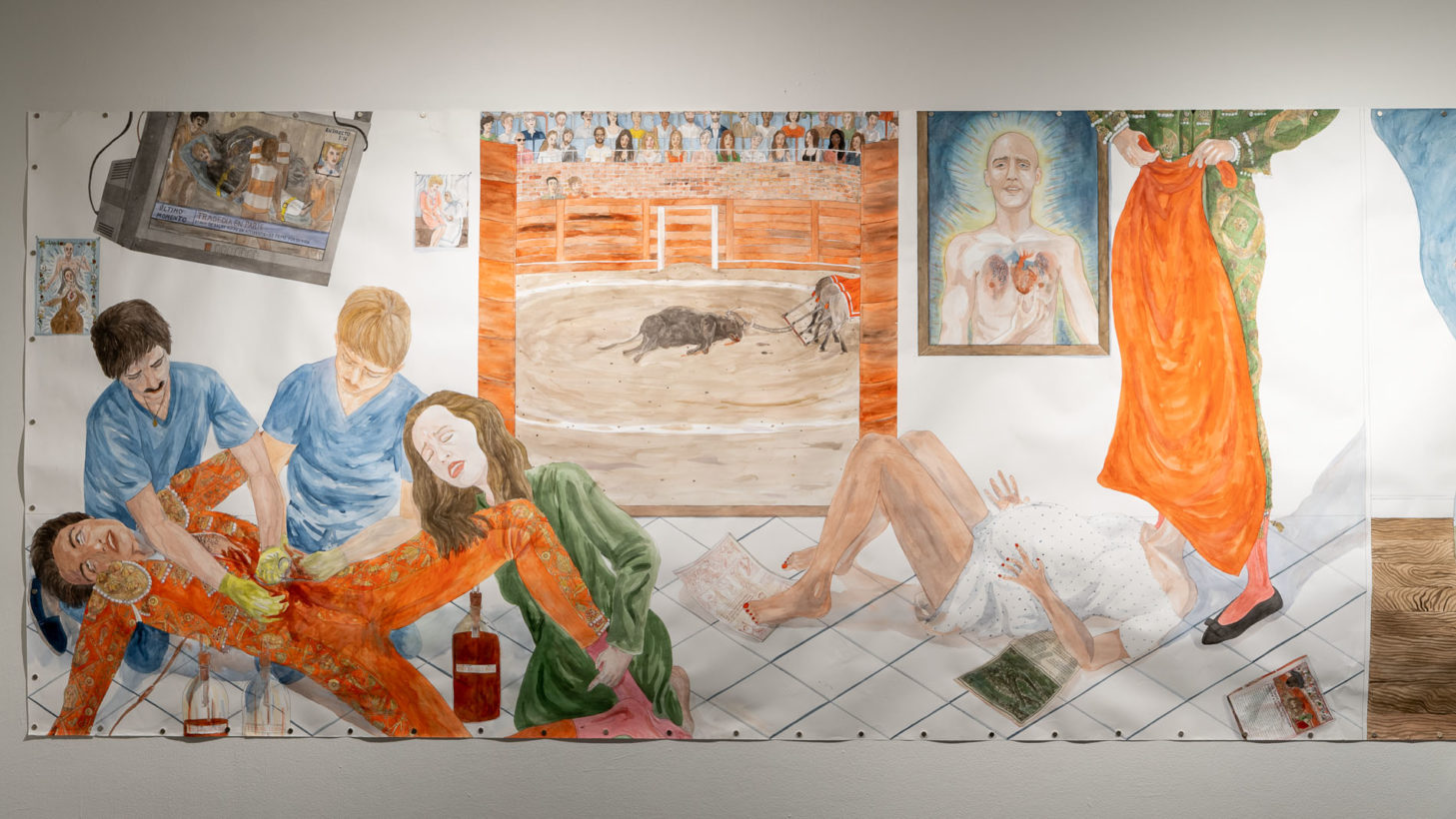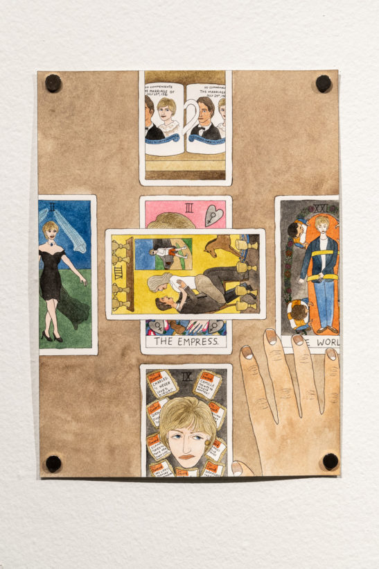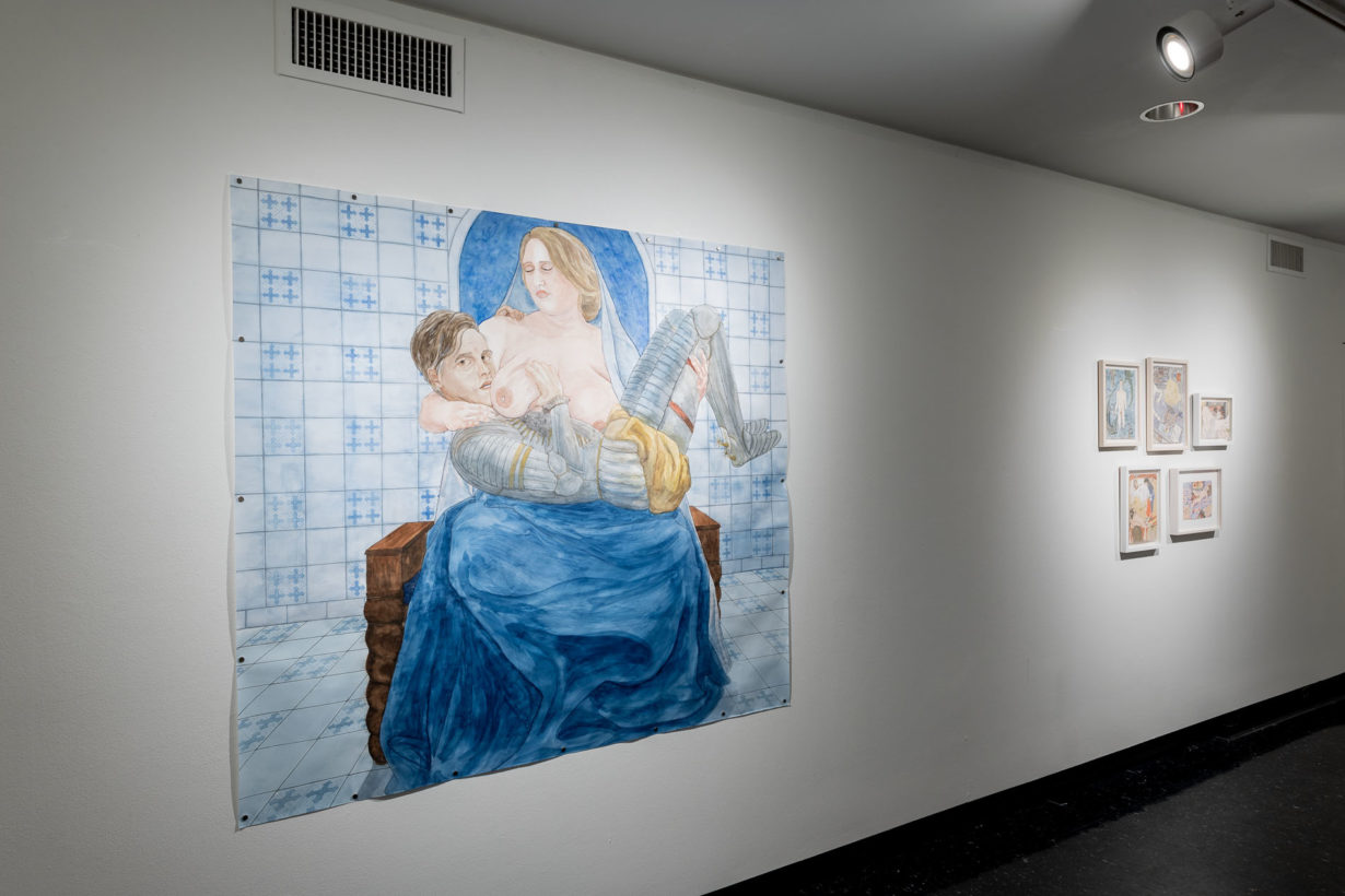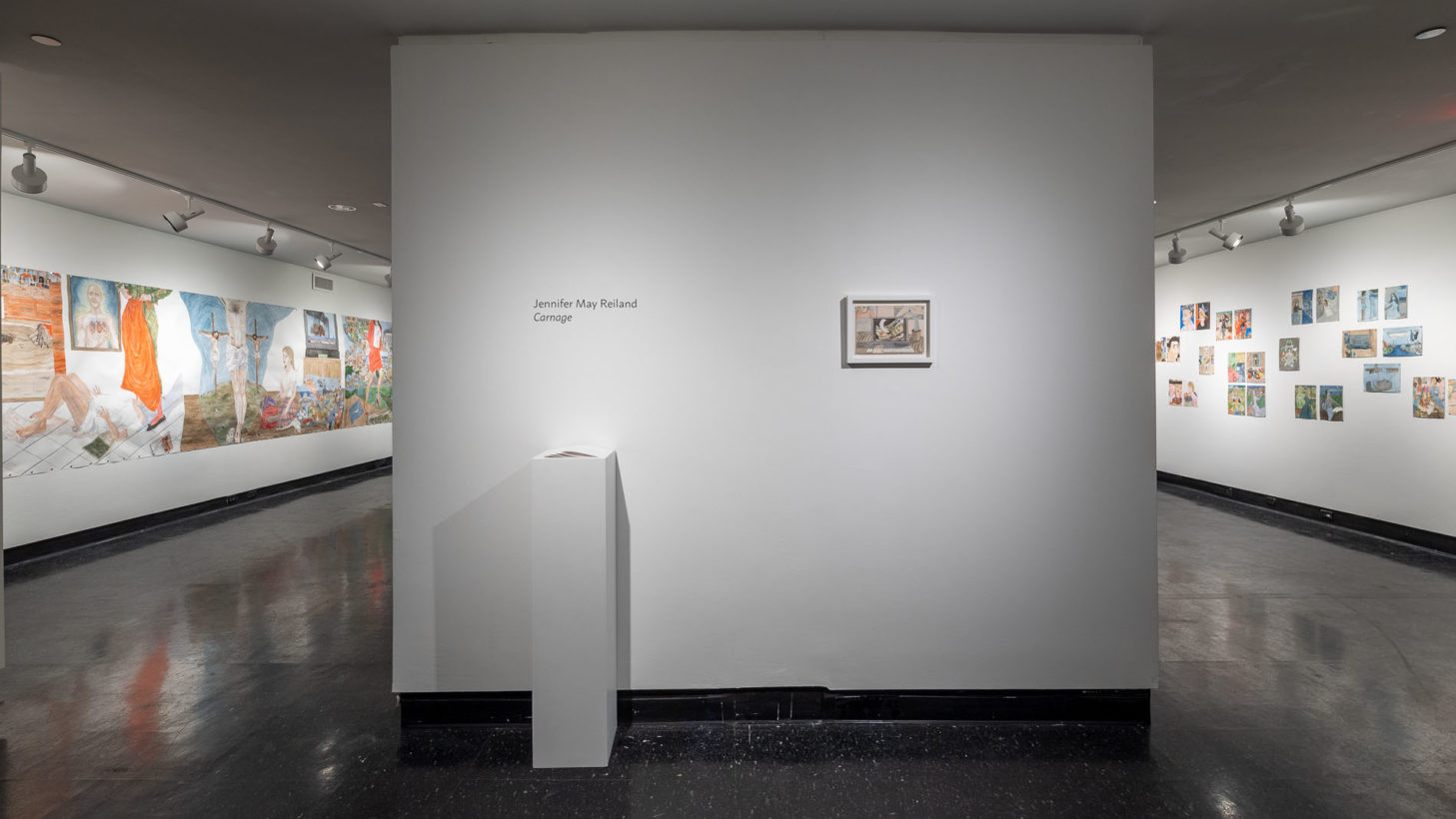 In Carnage, Jennifer May Reiland creates a personal pantheon of secular and religious saints and martyrs, ranging from Princess Diana to bullfighter Juan Belmonte to Maria of Agreda, a Spanish nun whose body was said to be seen floating over Texas in the early days of the Spanish conquest. In works on paper and wood, Reiland draws from medieval European imagery and the tradition of Mexican devotional painting to examine female guilt, martyrdom, and violence against women. These works weave together the stories of many women, historical and imagined. From medieval saints like Saint Catherine and Saint Agatha to historical martyrs like Marie Antoinette and Juana la Loca to modern celebrity martyrs like Marilyn Monroe and Princess Diana, these women’s bodies are sexualized, idolized, then ritually picked apart by the mob. Reiland combines the known facts of their lives with dreams, associations, and fantasies about them, attempting to fill in the holes where the truth is unknowable.