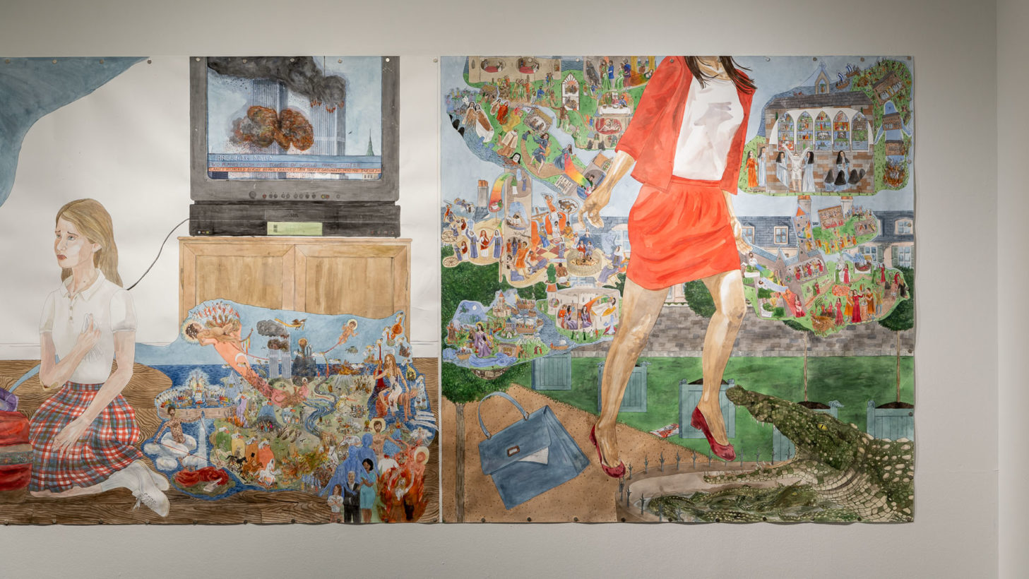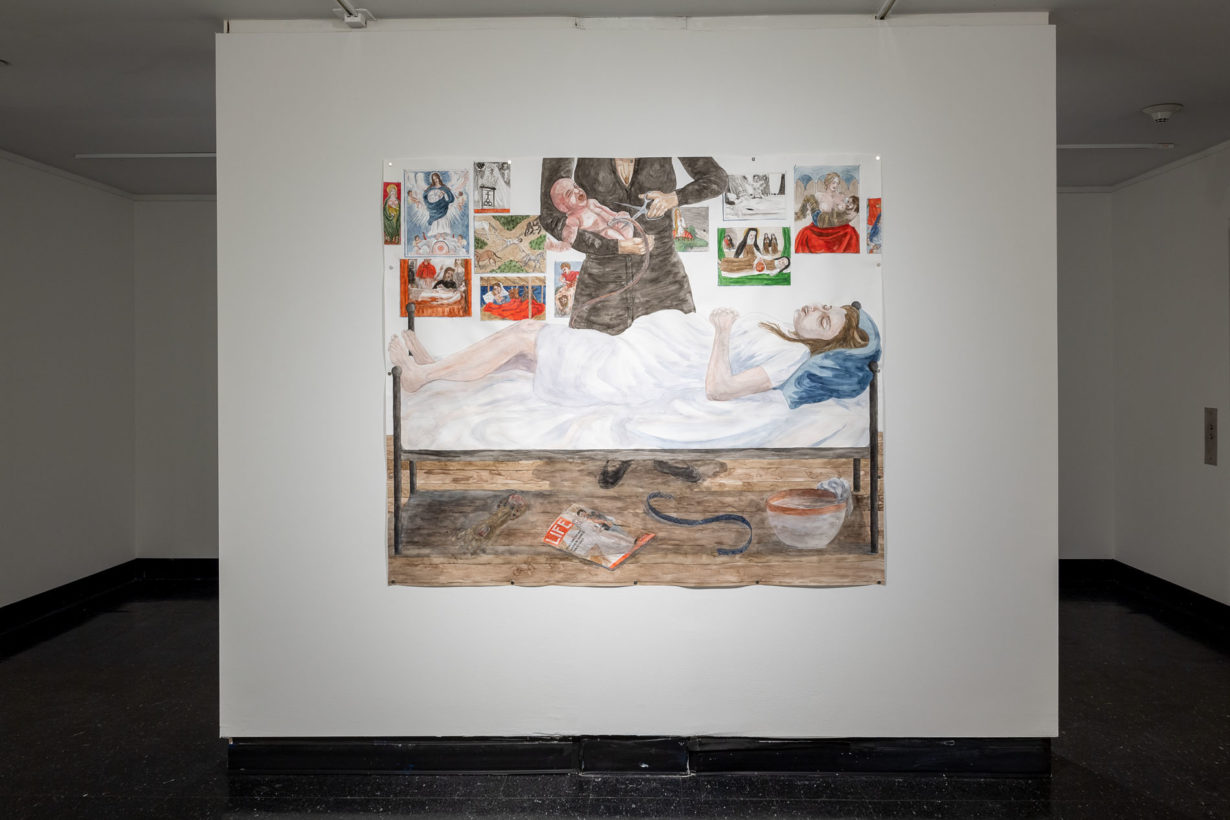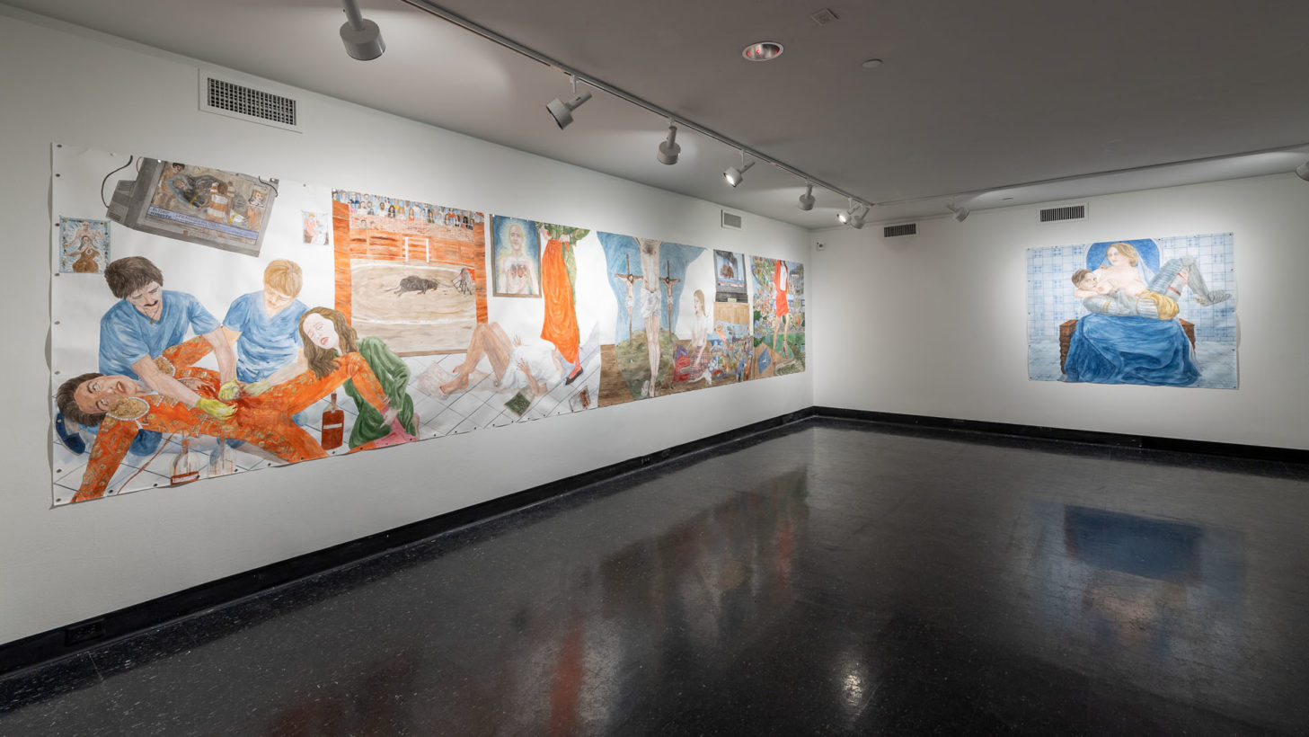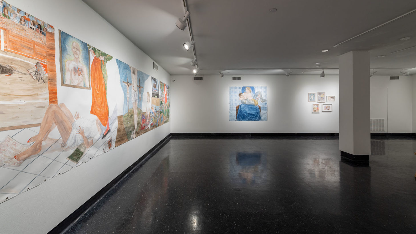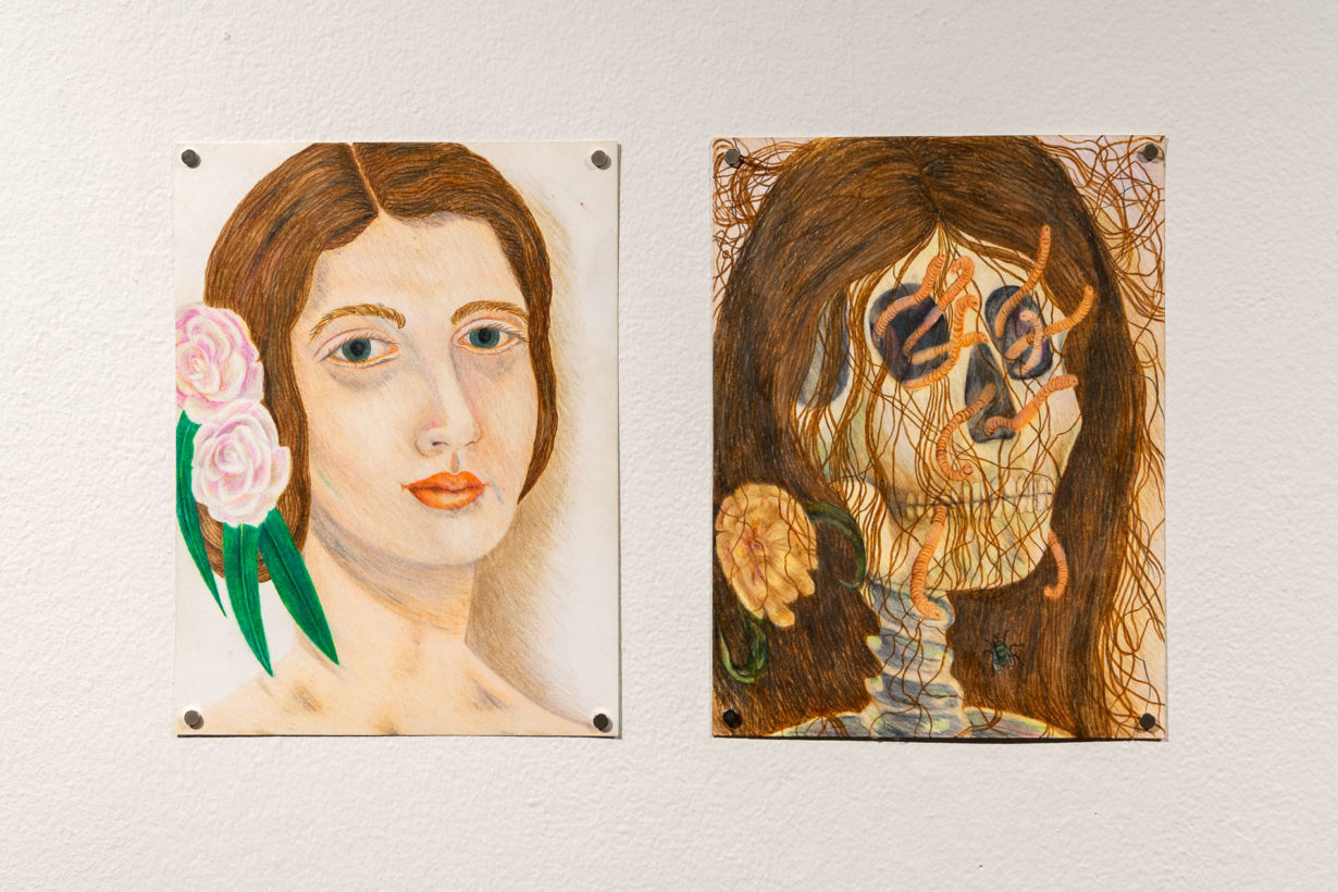 In Carnage, Jennifer May Reiland creates a personal pantheon of secular and religious saints and martyrs, ranging from Princess Diana to bullfighter Juan Belmonte to Maria of Agreda, a Spanish nun whose body was said to be seen floating over Texas in the early days of the Spanish conquest. In works on paper and wood, Reiland draws from medieval European imagery and the tradition of Mexican devotional painting to examine female guilt, martyrdom, and violence against women. These works weave together the stories of many women, historical and imagined. From medieval saints like Saint Catherine and Saint Agatha to historical martyrs like Marie Antoinette and Juana la Loca to modern celebrity martyrs like Marilyn Monroe and Princess Diana, these women’s bodies are sexualized, idolized, then ritually picked apart by the mob. Reiland combines the known facts of their lives with dreams, associations, and fantasies about them, attempting to fill in the holes where the truth is unknowable.