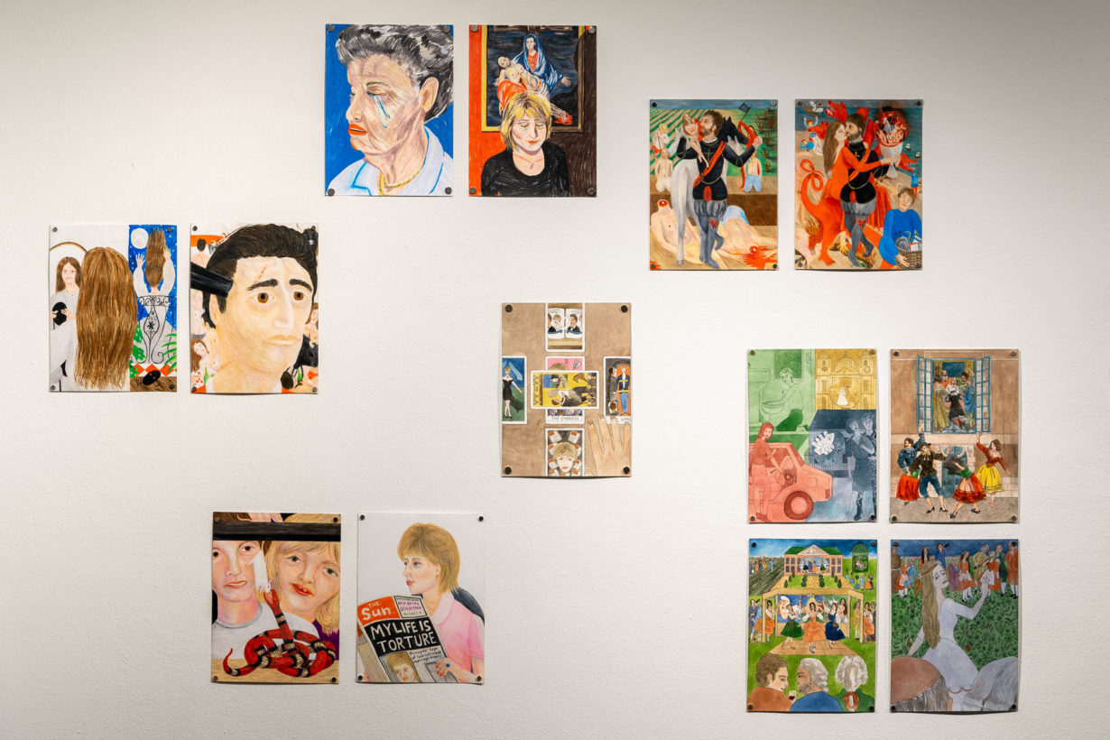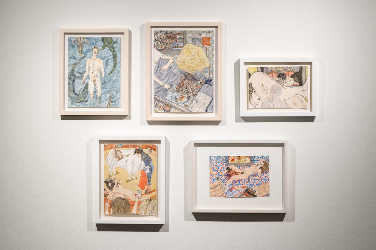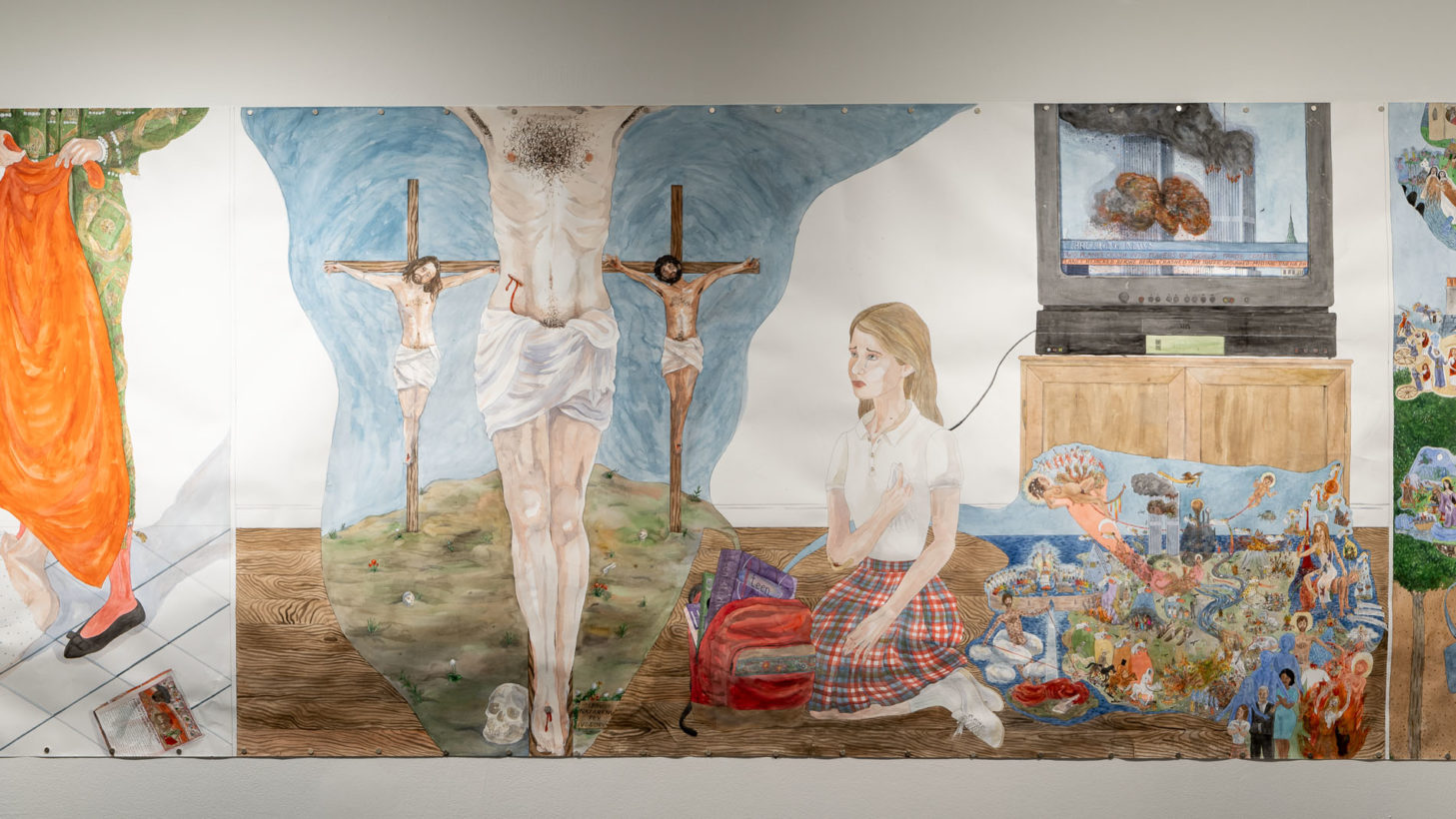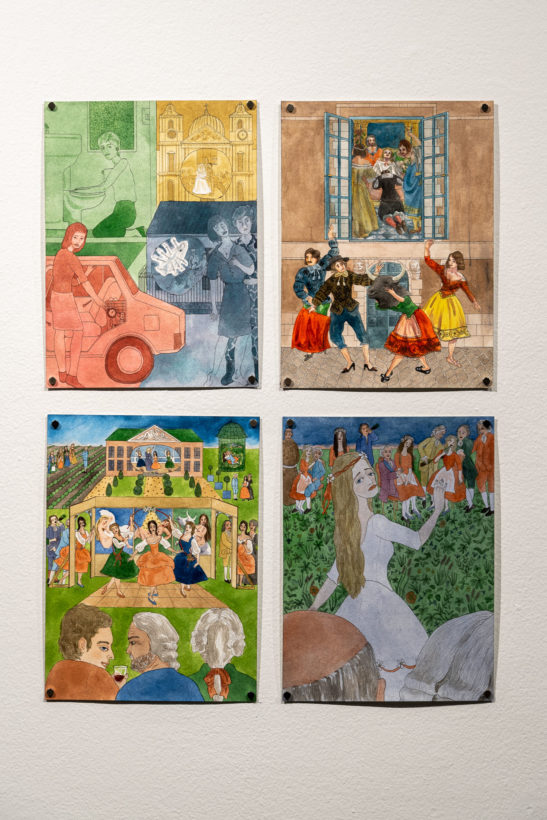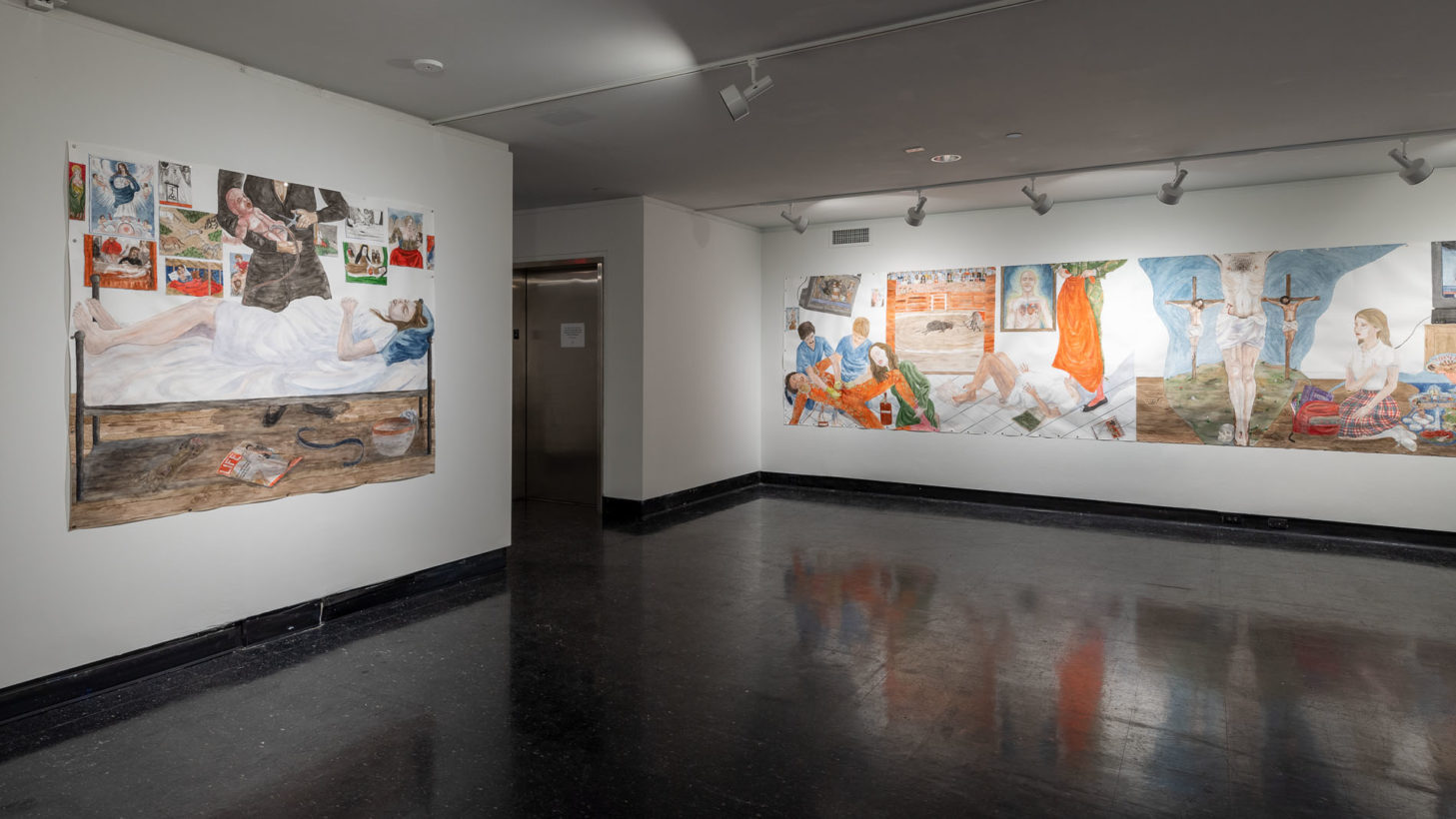 In Carnage, Jennifer May Reiland creates a personal pantheon of secular and religious saints and martyrs, ranging from Princess Diana to bullfighter Juan Belmonte to Maria of Agreda, a Spanish nun whose body was said to be seen floating over Texas in the early days of the Spanish conquest. In works on paper and wood, Reiland draws from medieval European imagery and the tradition of Mexican devotional painting to examine female guilt, martyrdom, and violence against women. These works weave together the stories of many women, historical and imagined. From medieval saints like Saint Catherine and Saint Agatha to historical martyrs like Marie Antoinette and Juana la Loca to modern celebrity martyrs like Marilyn Monroe and Princess Diana, these women’s bodies are sexualized, idolized, then ritually picked apart by the mob. Reiland combines the known facts of their lives with dreams, associations, and fantasies about them, attempting to fill in the holes where the truth is unknowable.