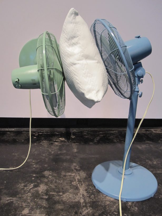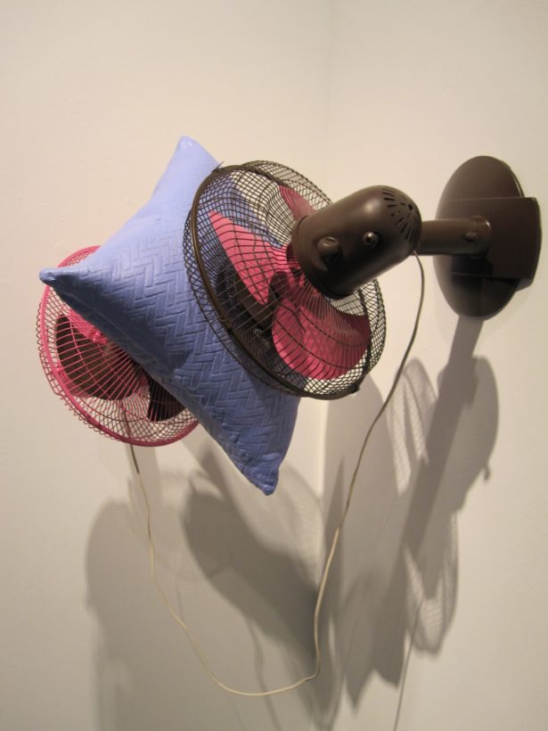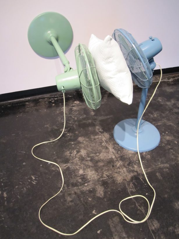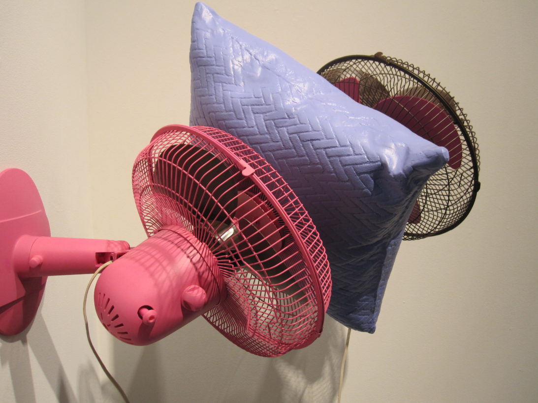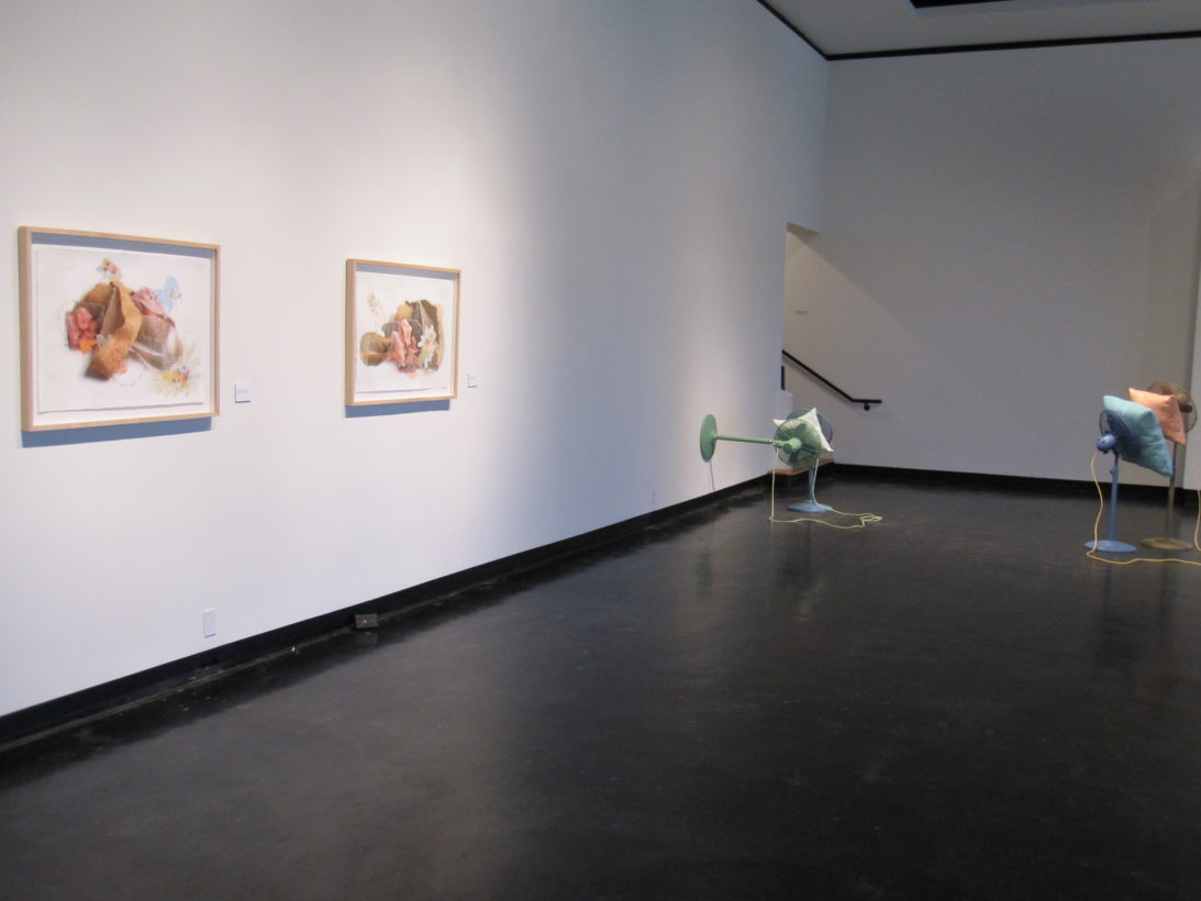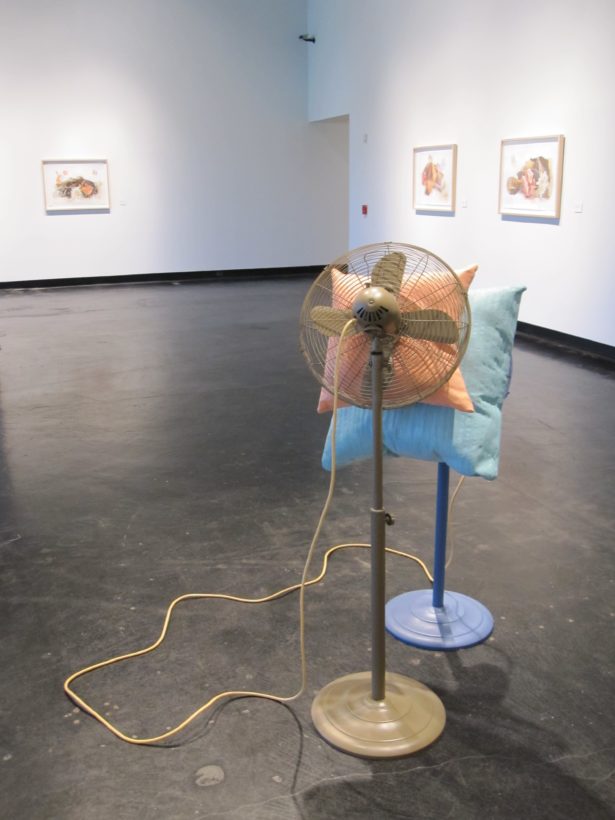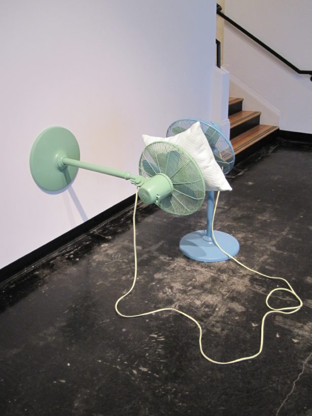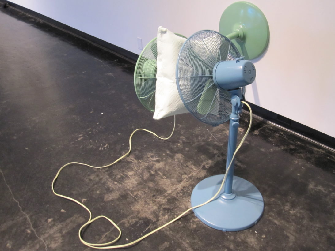 Josephine Durkin’s research and studio practice has involved the creation of drawings, videos, sculptures, and large-scale, interactive and kinetic installations that personify recognizable or manipulated objects and materials. These are then used to suggest, mimic, invite or isolate human gestures, activities, and relationships. She works with a variety of methods to investigate how materials and objects can be manipulated and positioned to function as human surrogates. In this solo exhibition at Lawndale Art Center, works include painted fans and cast, plastic pillows, manipulated school desks that “speak” to each other by way of a sensored, electromechanical sound system, and drawings that combine digital photographs of fabric and rubber with acrylic and colored pencil.