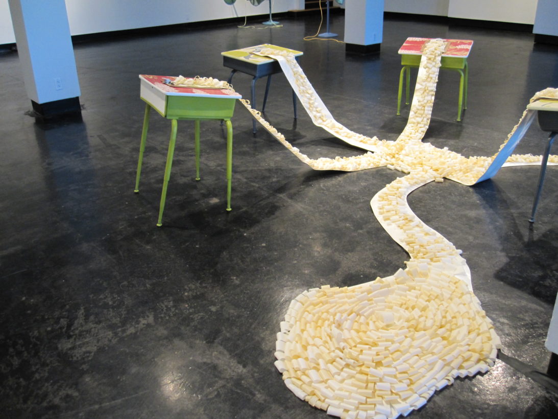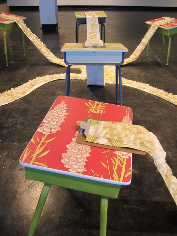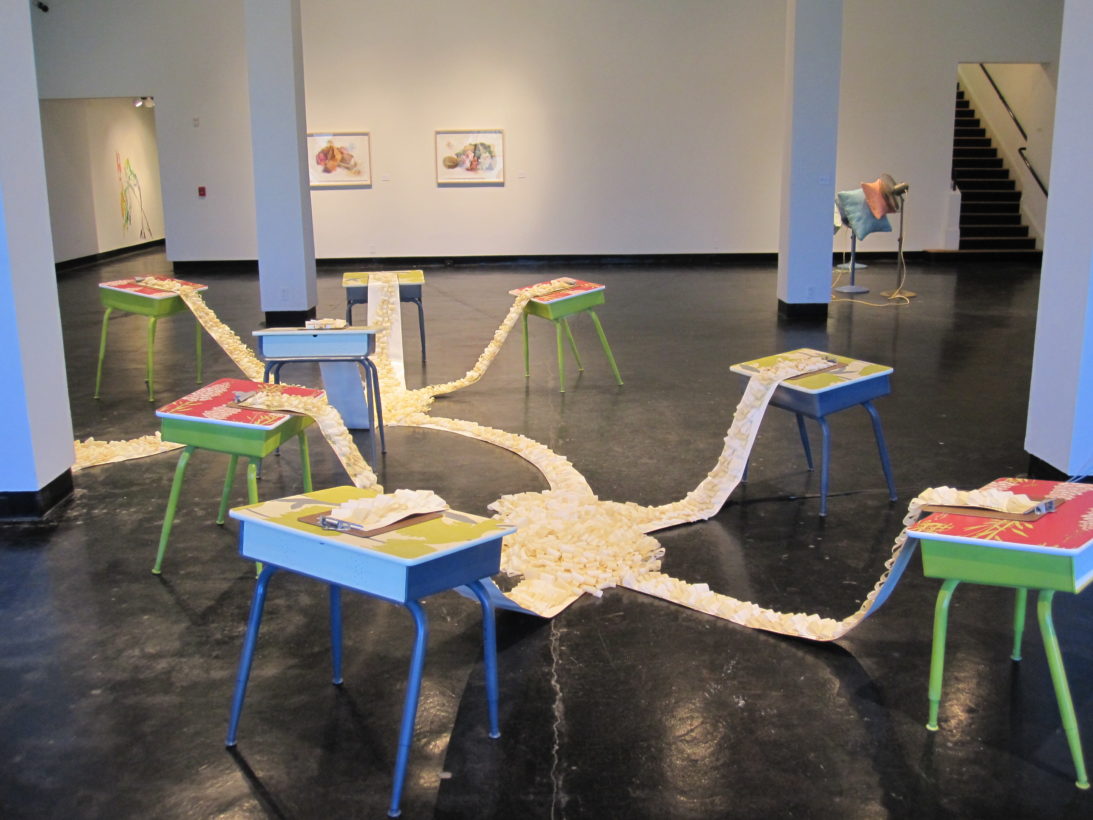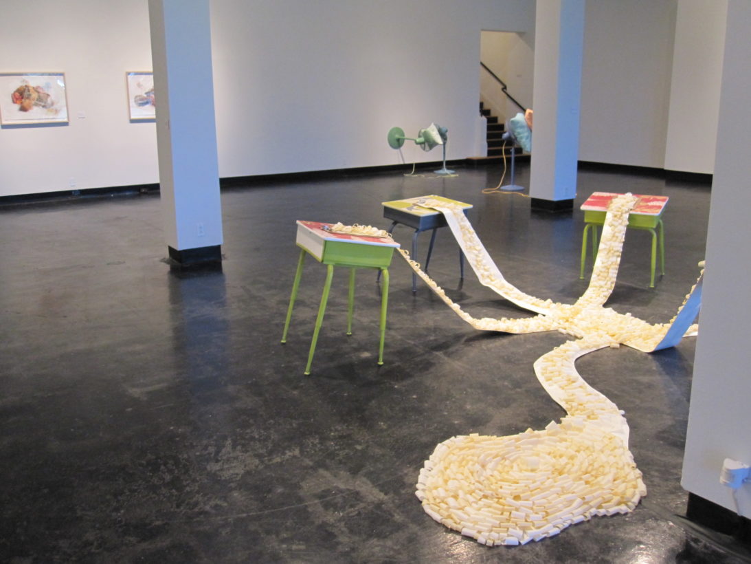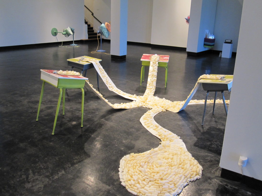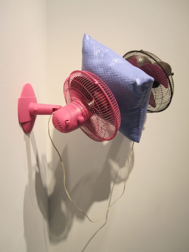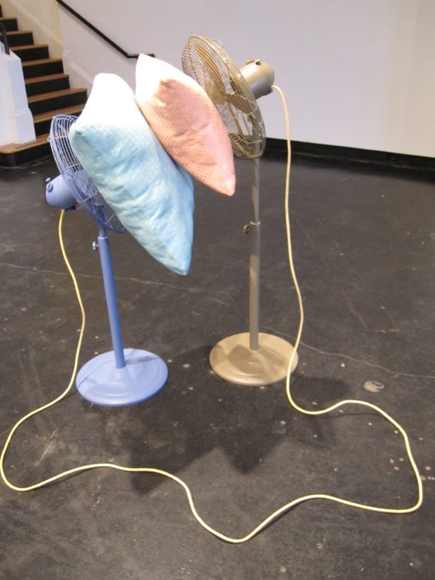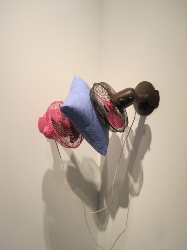 Josephine Durkin’s research and studio practice has involved the creation of drawings, videos, sculptures, and large-scale, interactive and kinetic installations that personify recognizable or manipulated objects and materials. These are then used to suggest, mimic, invite or isolate human gestures, activities, and relationships. She works with a variety of methods to investigate how materials and objects can be manipulated and positioned to function as human surrogates. In this solo exhibition at Lawndale Art Center, works include painted fans and cast, plastic pillows, manipulated school desks that “speak” to each other by way of a sensored, electromechanical sound system, and drawings that combine digital photographs of fabric and rubber with acrylic and colored pencil.