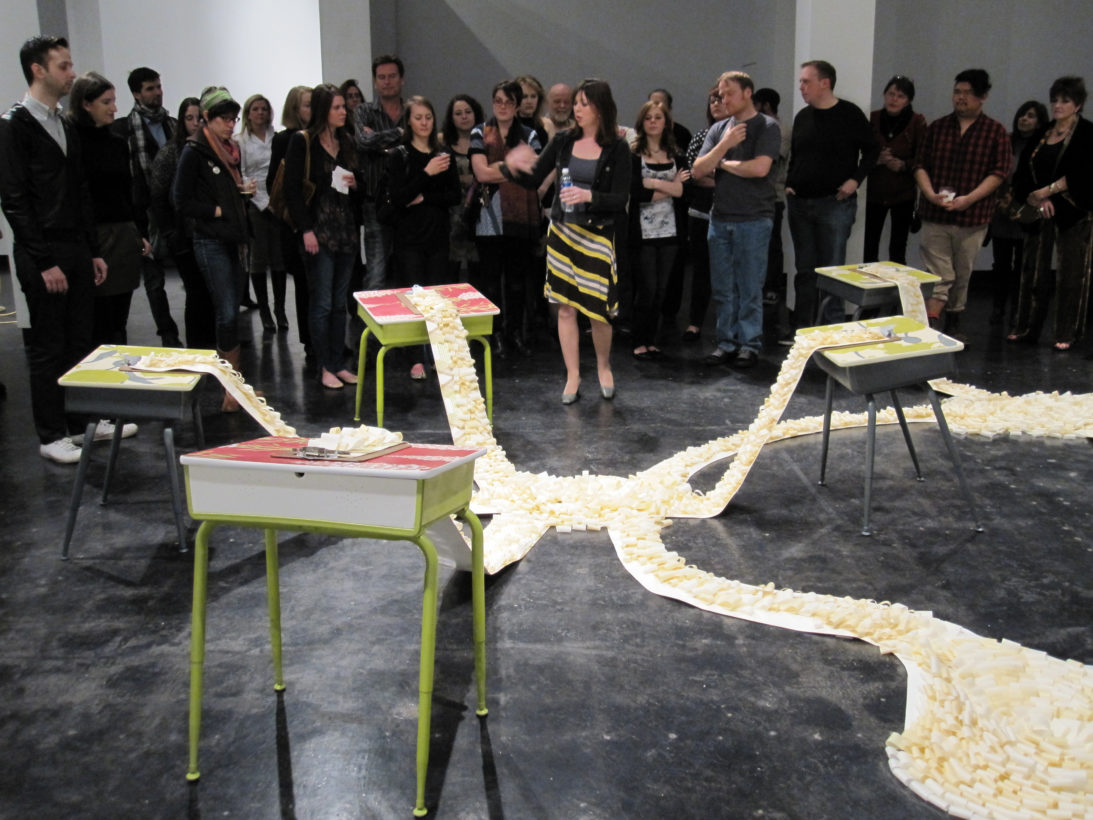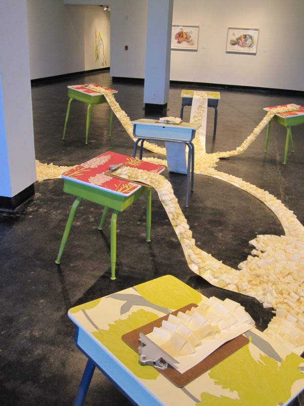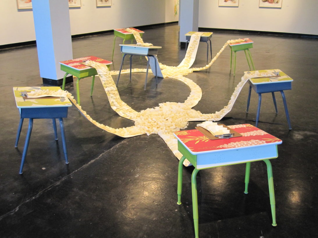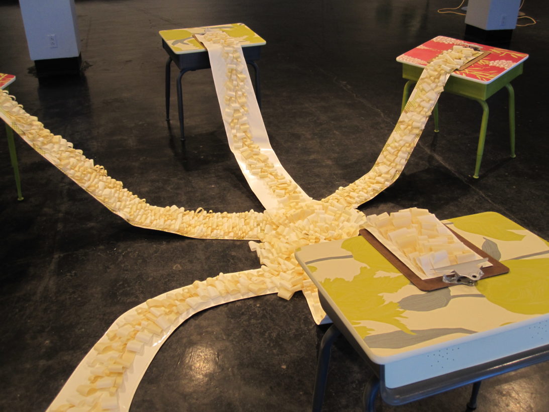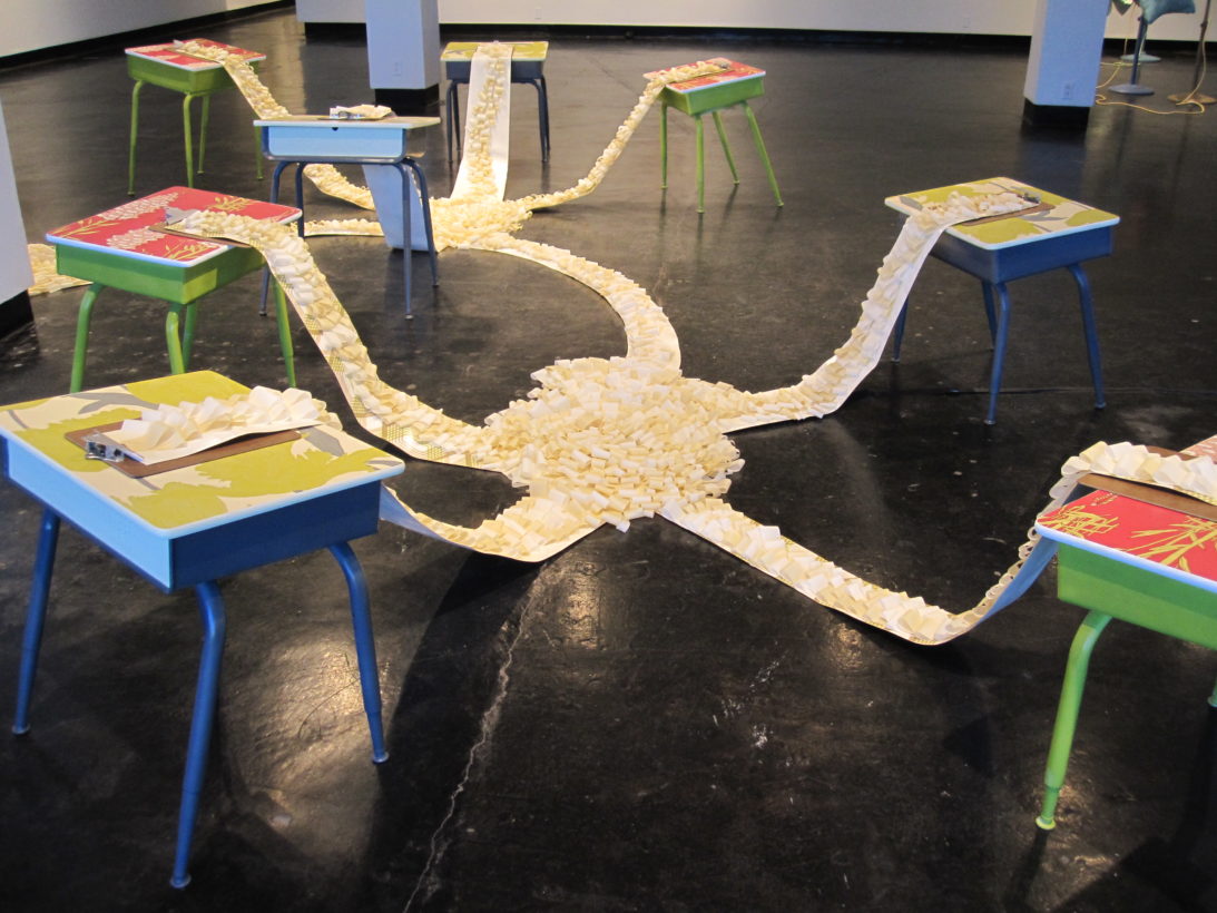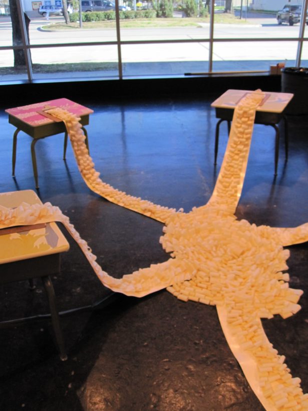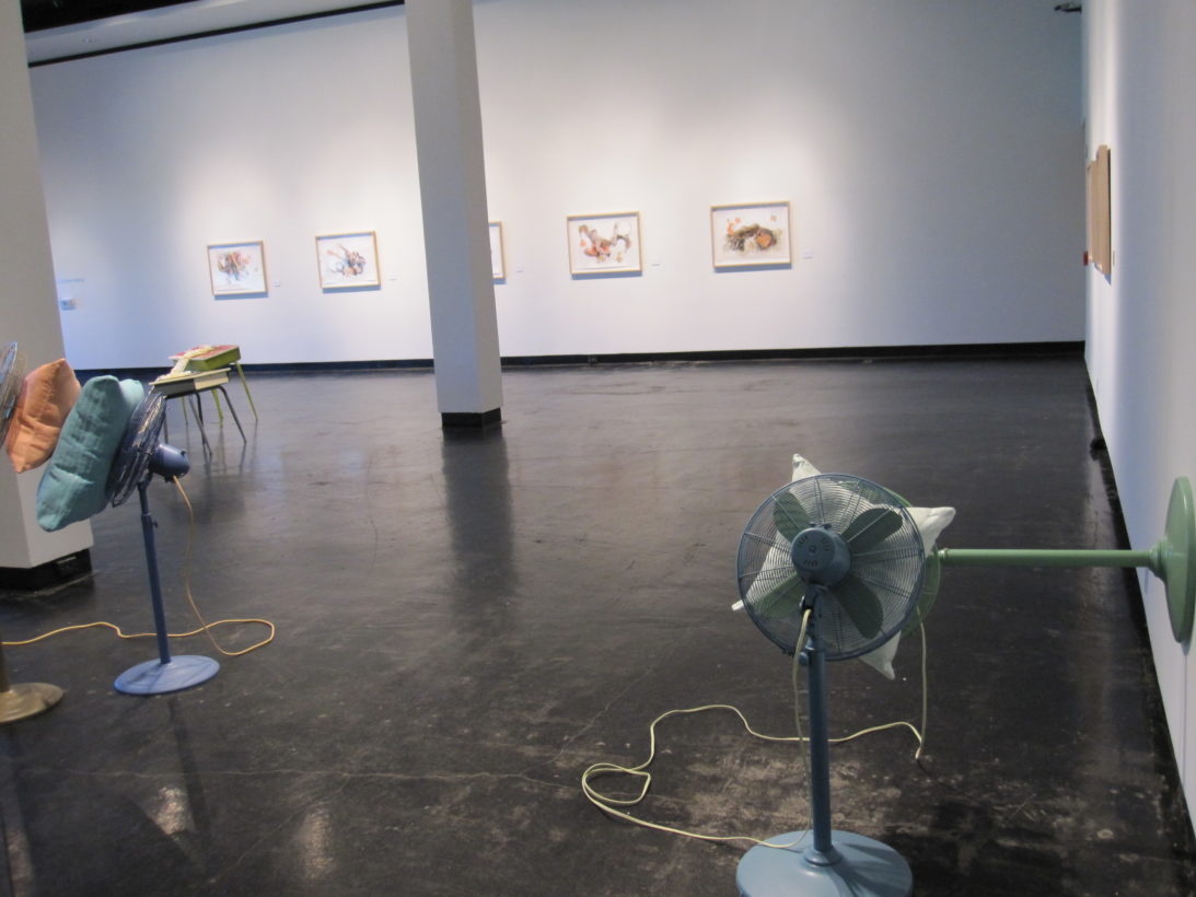 Josephine Durkin’s research and studio practice has involved the creation of drawings, videos, sculptures, and large-scale, interactive and kinetic installations that personify recognizable or manipulated objects and materials. These are then used to suggest, mimic, invite or isolate human gestures, activities, and relationships. She works with a variety of methods to investigate how materials and objects can be manipulated and positioned to function as human surrogates. In this solo exhibition at Lawndale Art Center, works include painted fans and cast, plastic pillows, manipulated school desks that “speak” to each other by way of a sensored, electromechanical sound system, and drawings that combine digital photographs of fabric and rubber with acrylic and colored pencil.