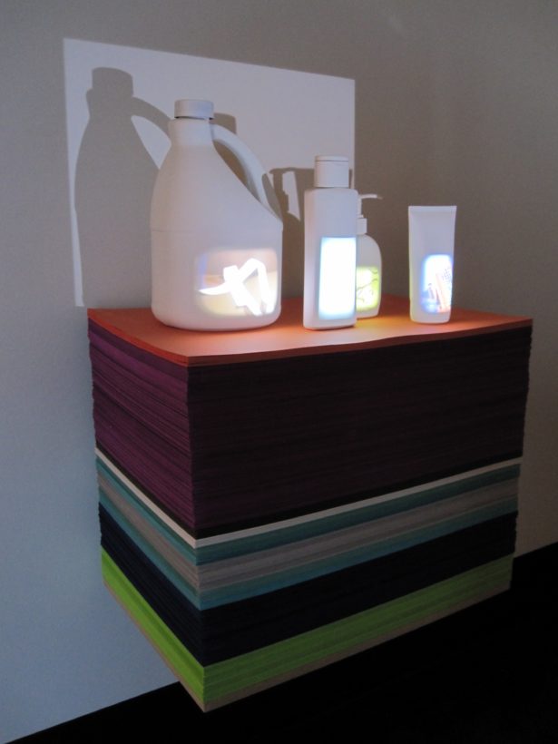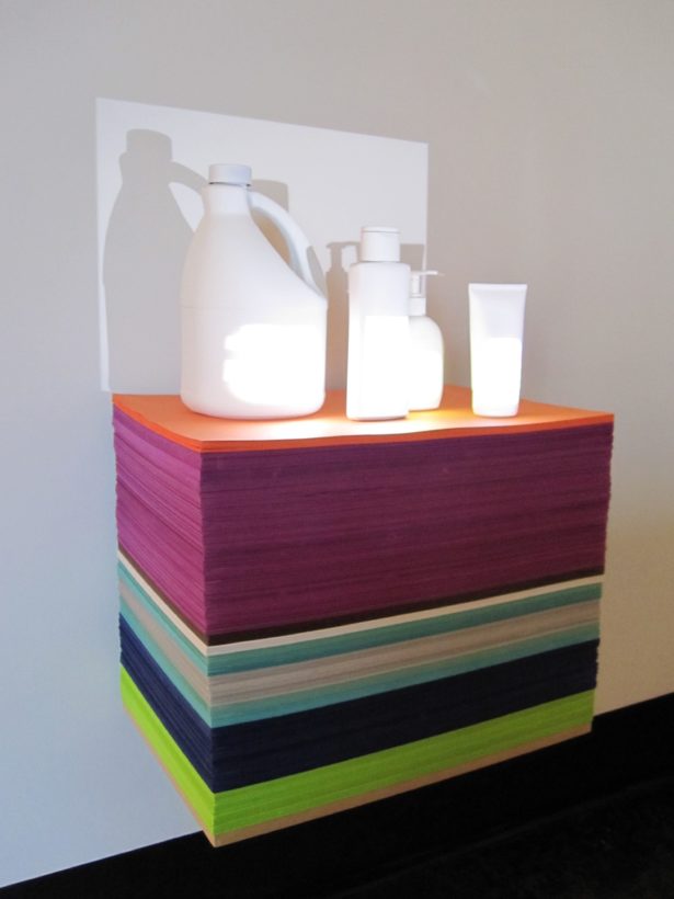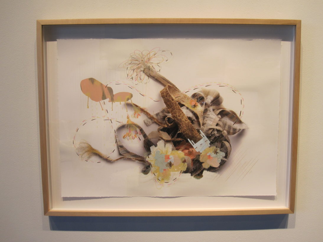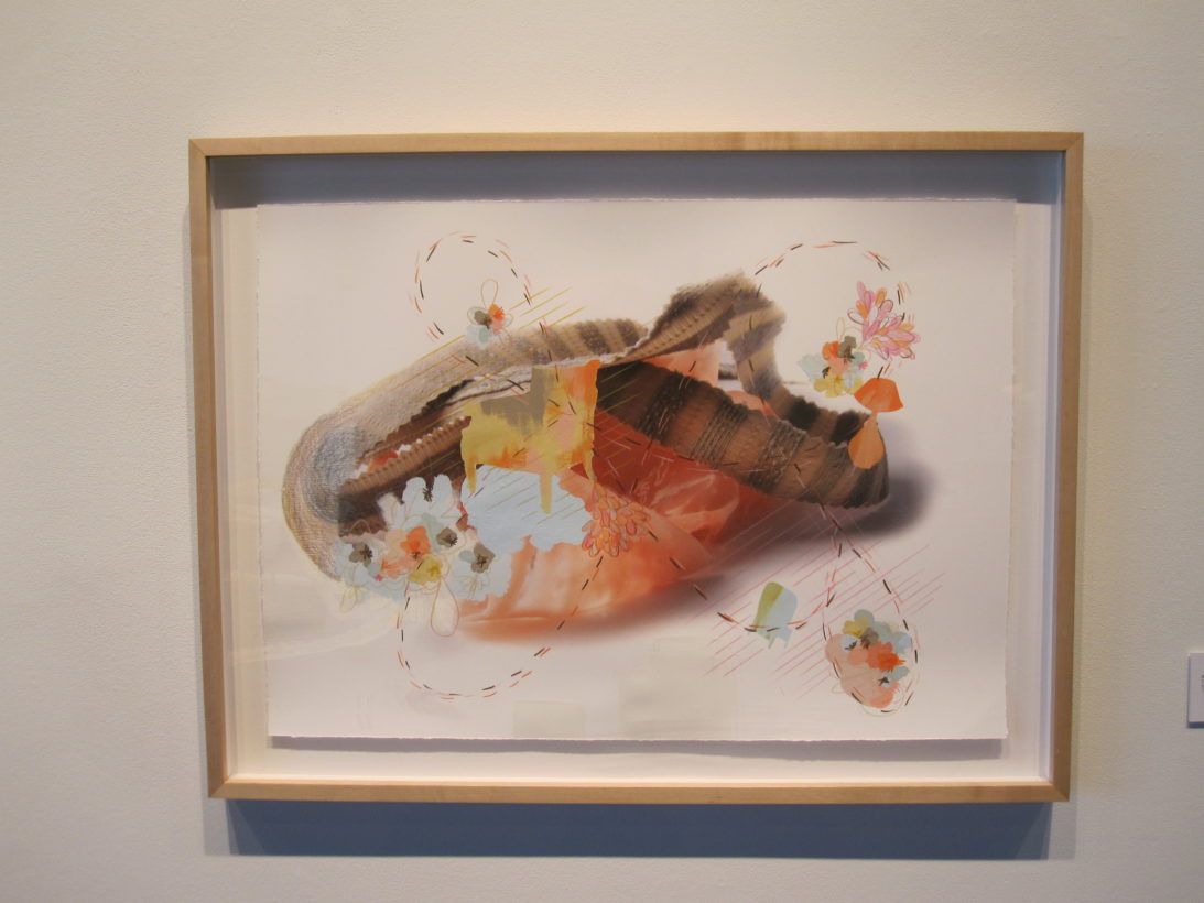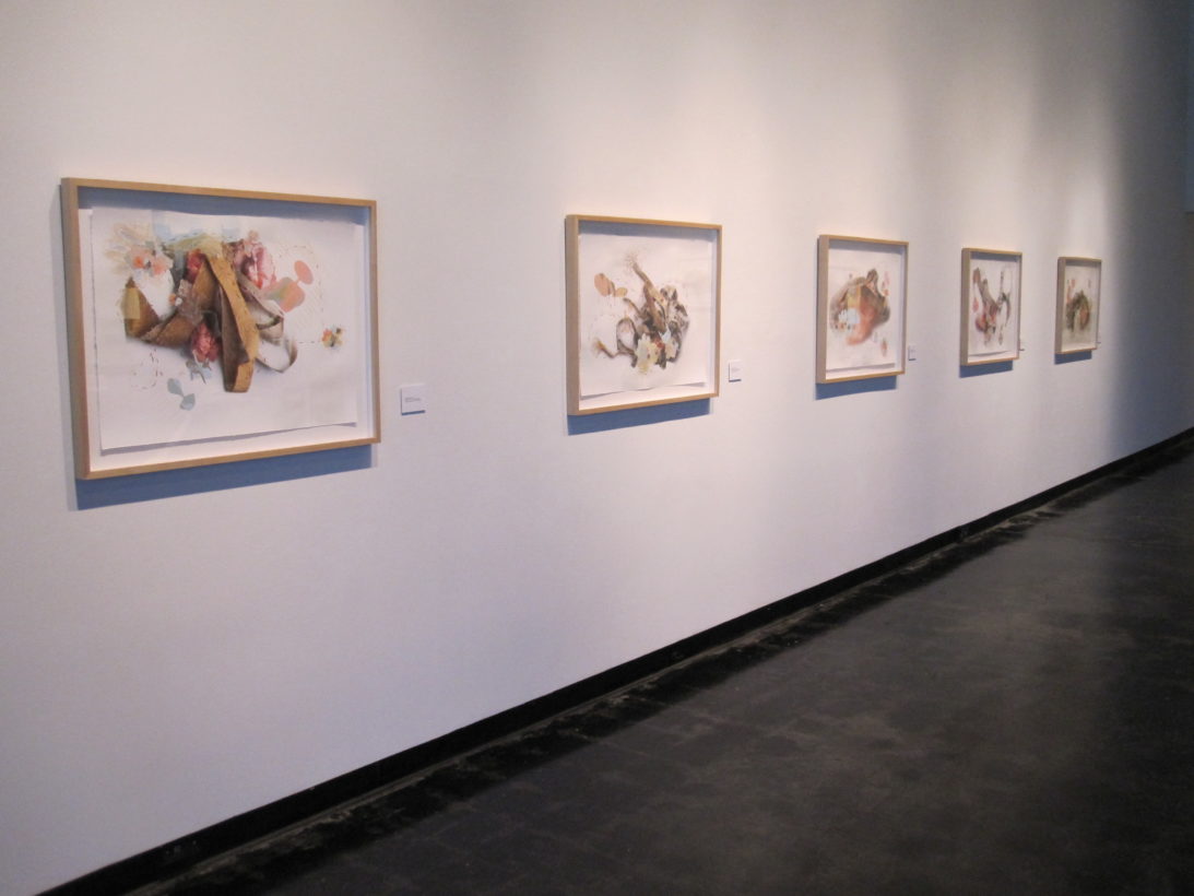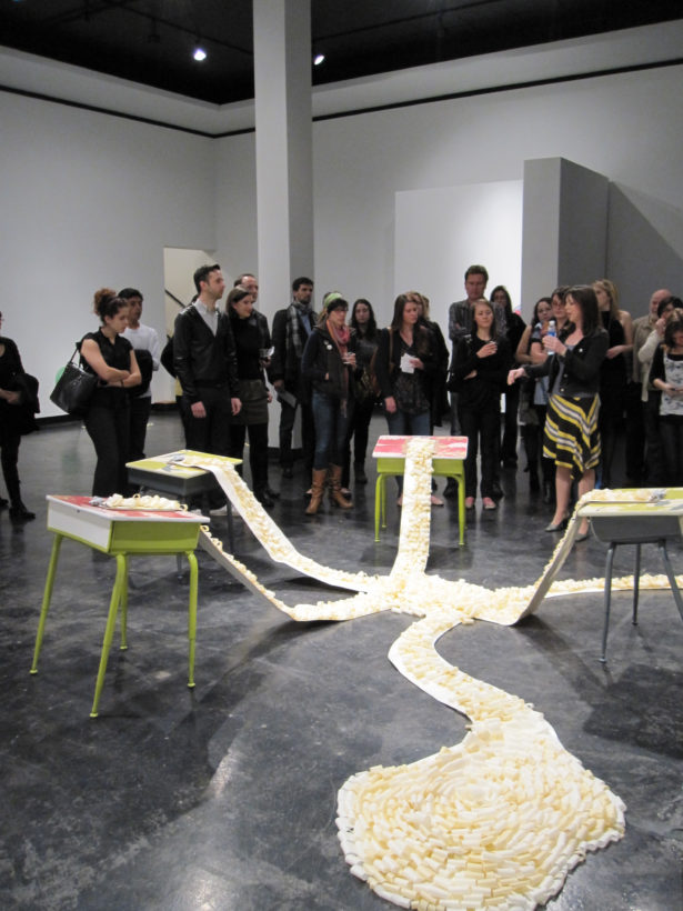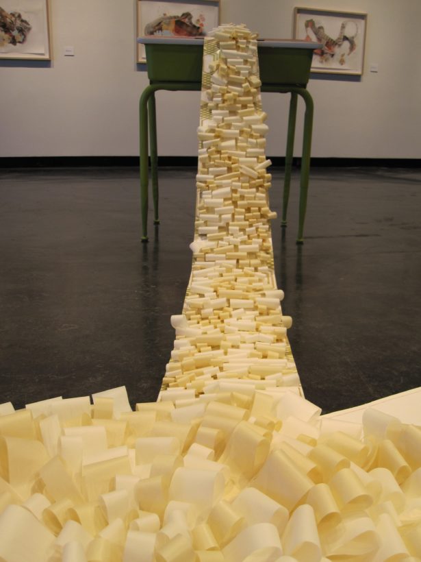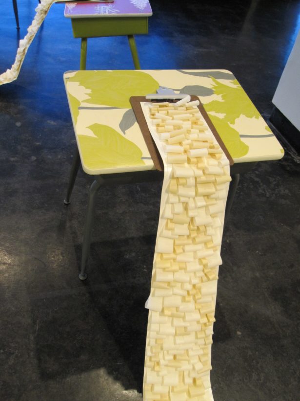 Josephine Durkin’s research and studio practice has involved the creation of drawings, videos, sculptures, and large-scale, interactive and kinetic installations that personify recognizable or manipulated objects and materials. These are then used to suggest, mimic, invite or isolate human gestures, activities, and relationships. She works with a variety of methods to investigate how materials and objects can be manipulated and positioned to function as human surrogates. In this solo exhibition at Lawndale Art Center, works include painted fans and cast, plastic pillows, manipulated school desks that “speak” to each other by way of a sensored, electromechanical sound system, and drawings that combine digital photographs of fabric and rubber with acrylic and colored pencil.