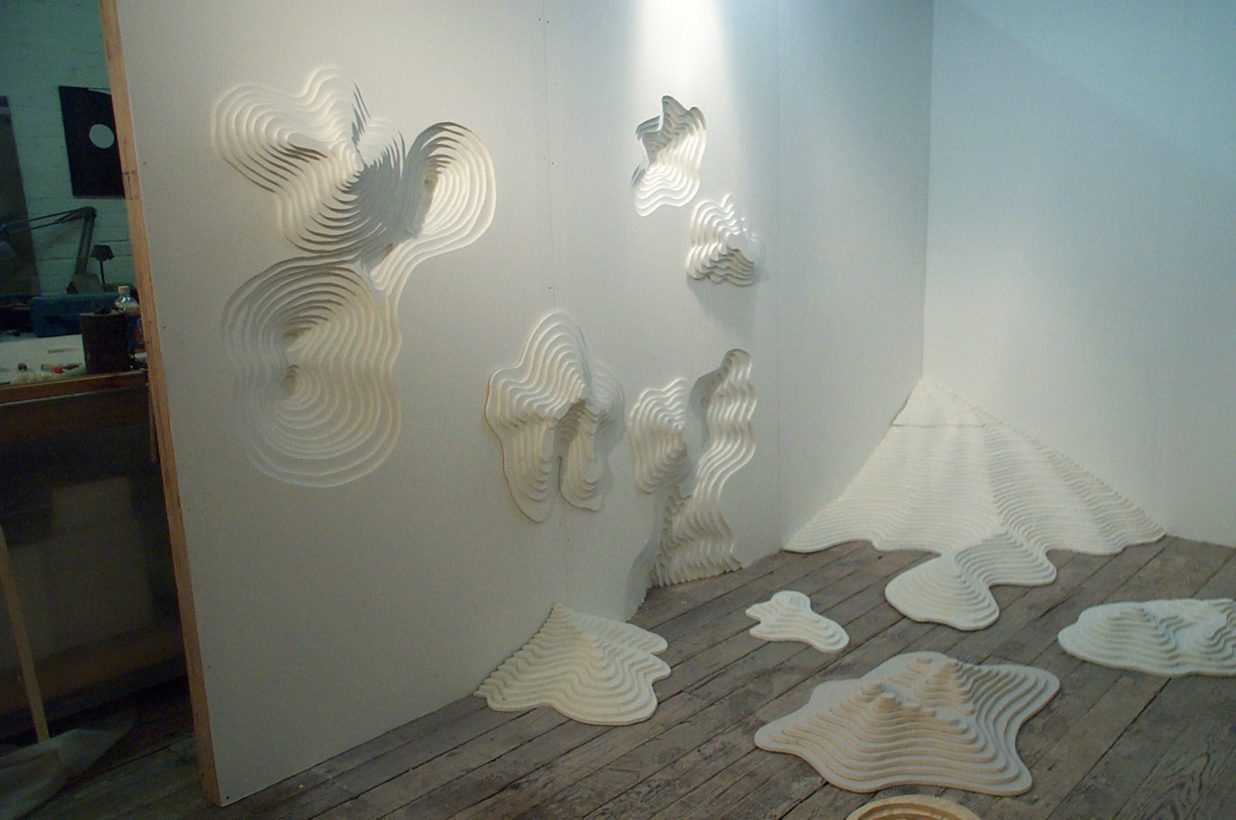 The design of the pieces and the method of construction are derived from a technique commonly used to illustrate topography in architectural models. For me, this and the amorphous forms tie both the work and the theme to the earth and all of nature. The formal connection to architecture ties the work to my unique experience.