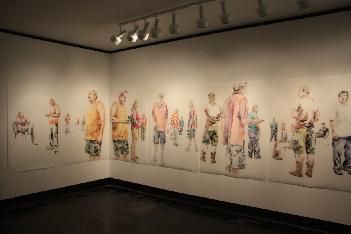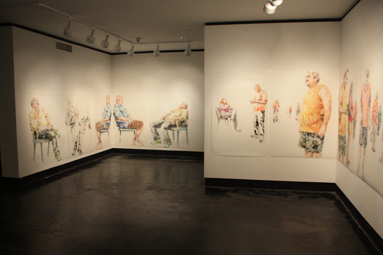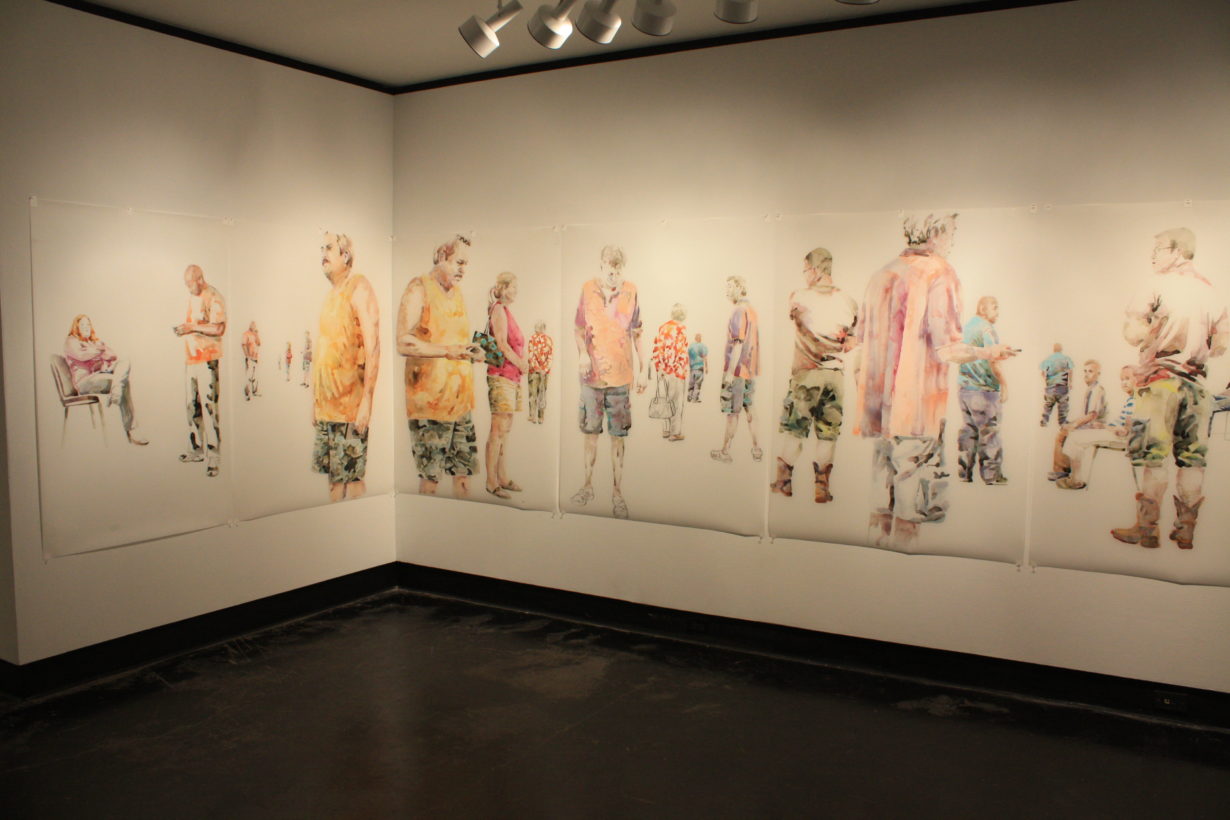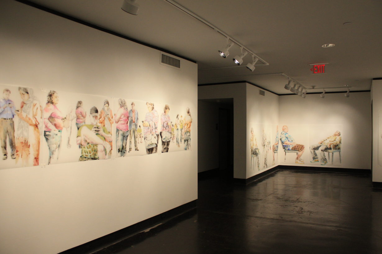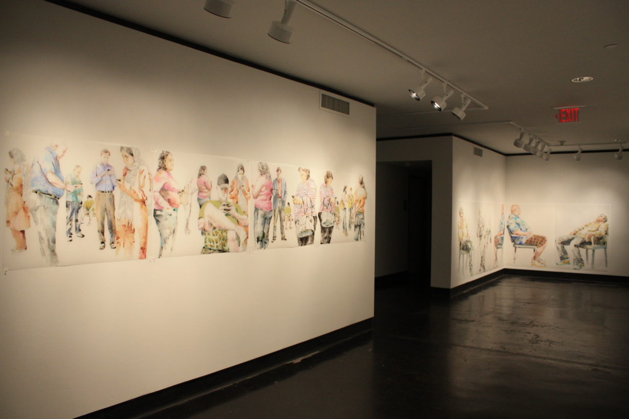 Lillian Warren creates a specific painting installation to cover the walls of the Grace R. Cavnar Gallery with a continuous series of figures. Foreground figures are life-sized or larger and others diminish in scale and recede into empty space. Through the repetition of figures throughout the paintings, Warren implies reflections, the passage of time and a shifting point of view. Each figure seems to have been waiting for a long time, glancing up to see if something has happened, absorbed with some electronic gadget, staring into space, or even sleeping; oblivious to the others, although clearly inhabiting the same space and all waiting…for something. Warren explains, “This series is a continuation of my investigation of liminal spaces, in-between situations and conditions characterized by dislocation, uncertainty and the dissolution of hierarchies. When working on the paintings I find myself thinking of “Waiting for Godot” and how that absurdist play can feel uncomfortably familiar as we spend our lives waiting endlessly for something that we might not recognize when we see it.”