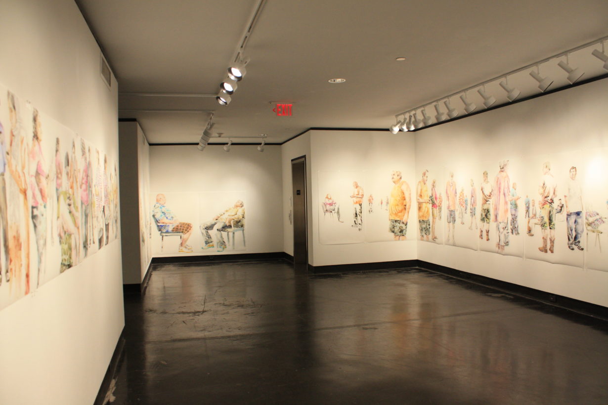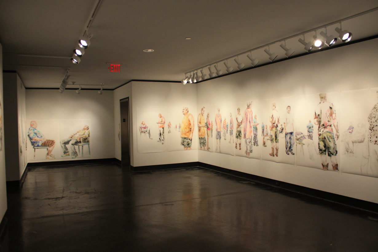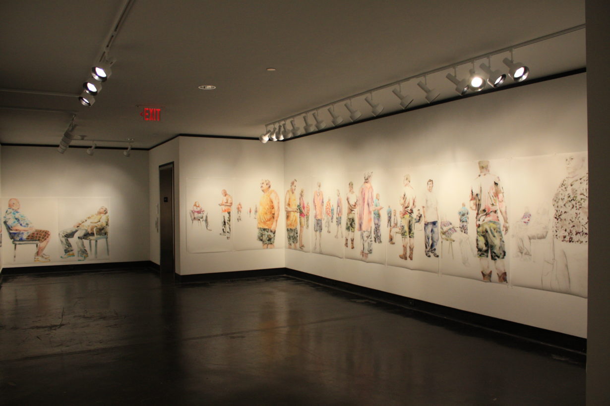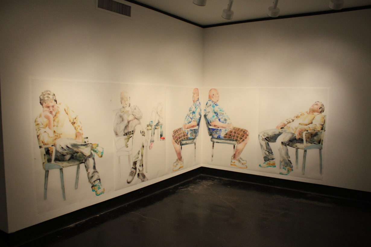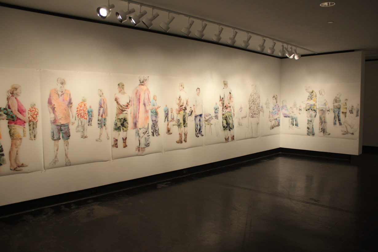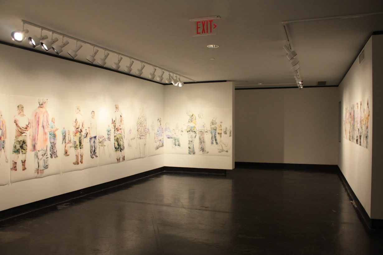 Lillian Warren creates a specific painting installation to cover the walls of the Grace R. Cavnar Gallery with a continuous series of figures. Foreground figures are life-sized or larger and others diminish in scale and recede into empty space. Through the repetition of figures throughout the paintings, Warren implies reflections, the passage of time and a shifting point of view. Each figure seems to have been waiting for a long time, glancing up to see if something has happened, absorbed with some electronic gadget, staring into space, or even sleeping; oblivious to the others, although clearly inhabiting the same space and all waiting…for something. Warren explains, “This series is a continuation of my investigation of liminal spaces, in-between situations and conditions characterized by dislocation, uncertainty and the dissolution of hierarchies. When working on the paintings I find myself thinking of “Waiting for Godot” and how that absurdist play can feel uncomfortably familiar as we spend our lives waiting endlessly for something that we might not recognize when we see it.”