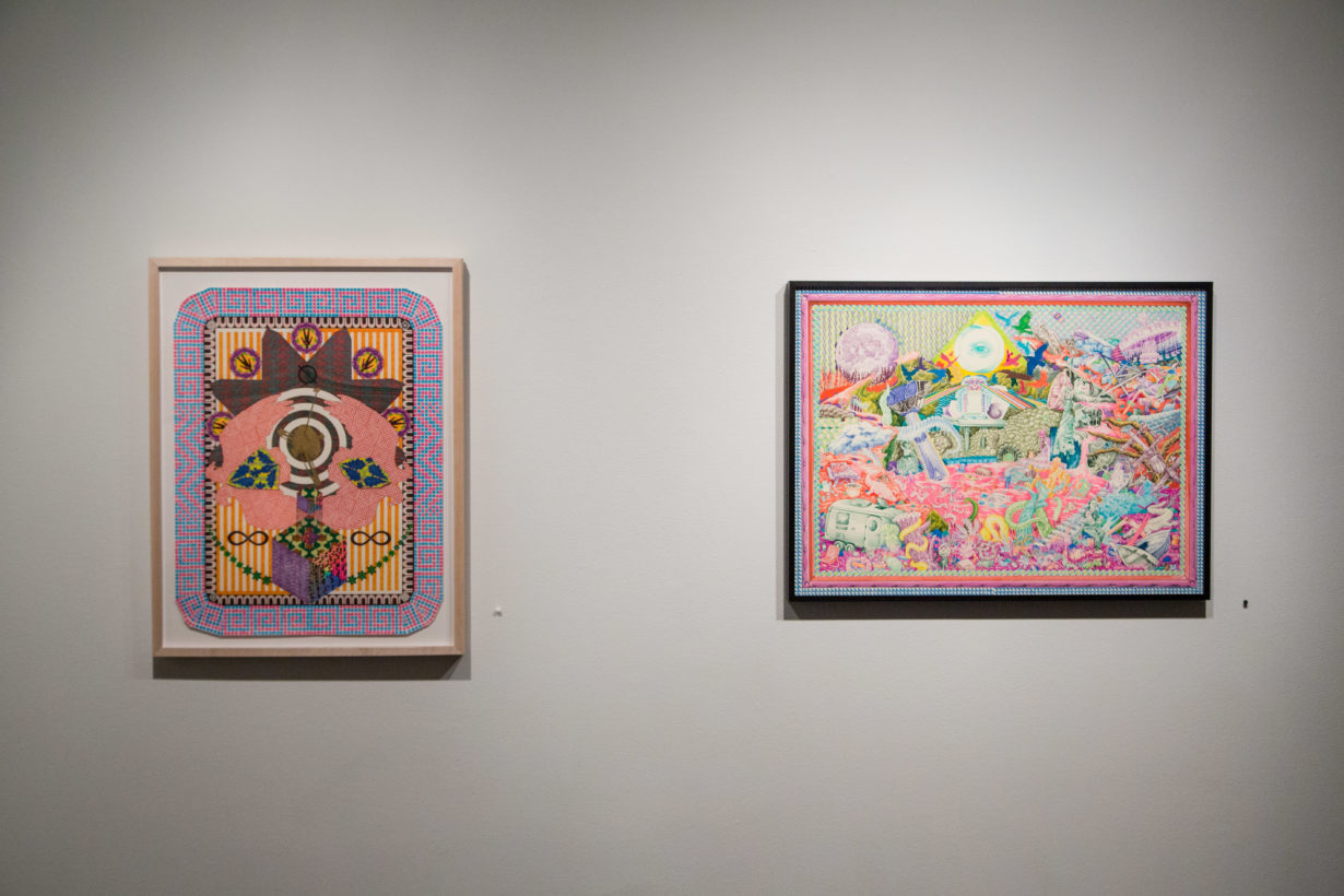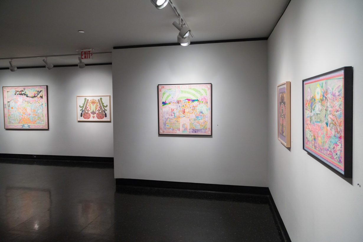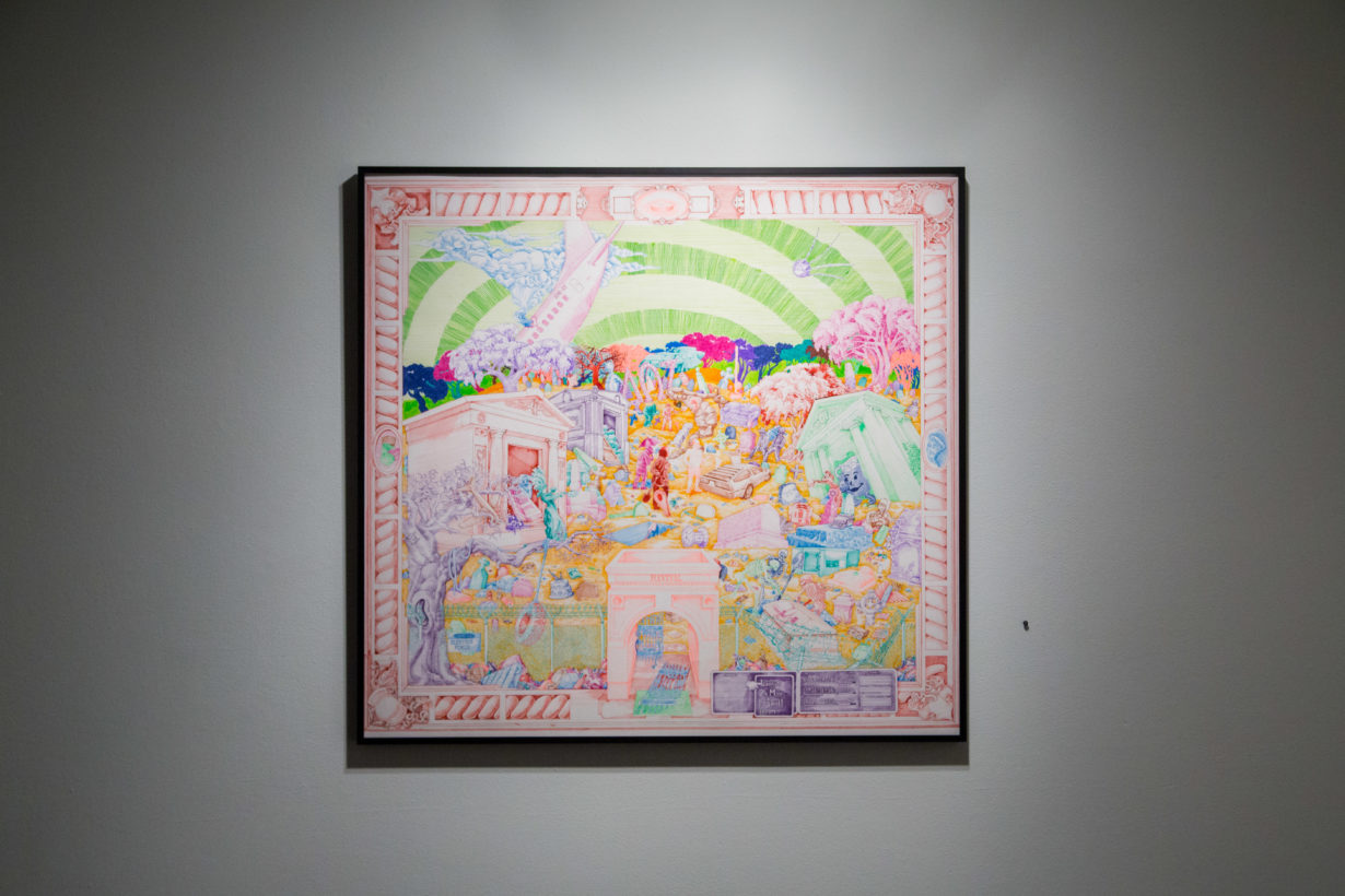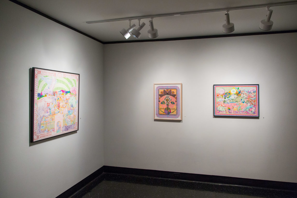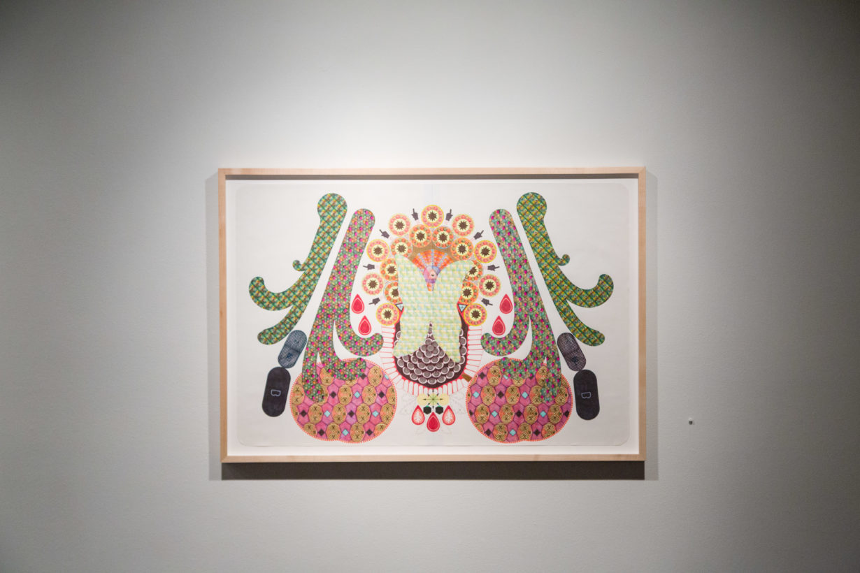 With an arsenal of 0.40-millimeter pens, Christopher Wallace and Samantha Persons tackle notions of narrative, pattern, and obsession. Surface Dwellers consists of drawings, wallpaper, sculpture, and nostalgia, with a dash of science-fiction. Persons and Wallace create non-hierarchical drawings using color as a means of collage and differentiation. The eye becomes visual saturated from the artists’ kenophobia. Looking to the history of printmaking—particularly Dürer, Goya and Schirmer—Wallace narrates such themes as nostalgia, technology, myth and Internet culture. Using hand-drawn pattern and symmetry Persons creates the illusion of mechanical production, highlighting topics of feminism, textiles and gender/queering. Embracing the empirical flatness of paper, Persons and Wallace question what it means to be terrestrial beings trapped in a self-contained starship traveling 1.3 million miles an hour through space.