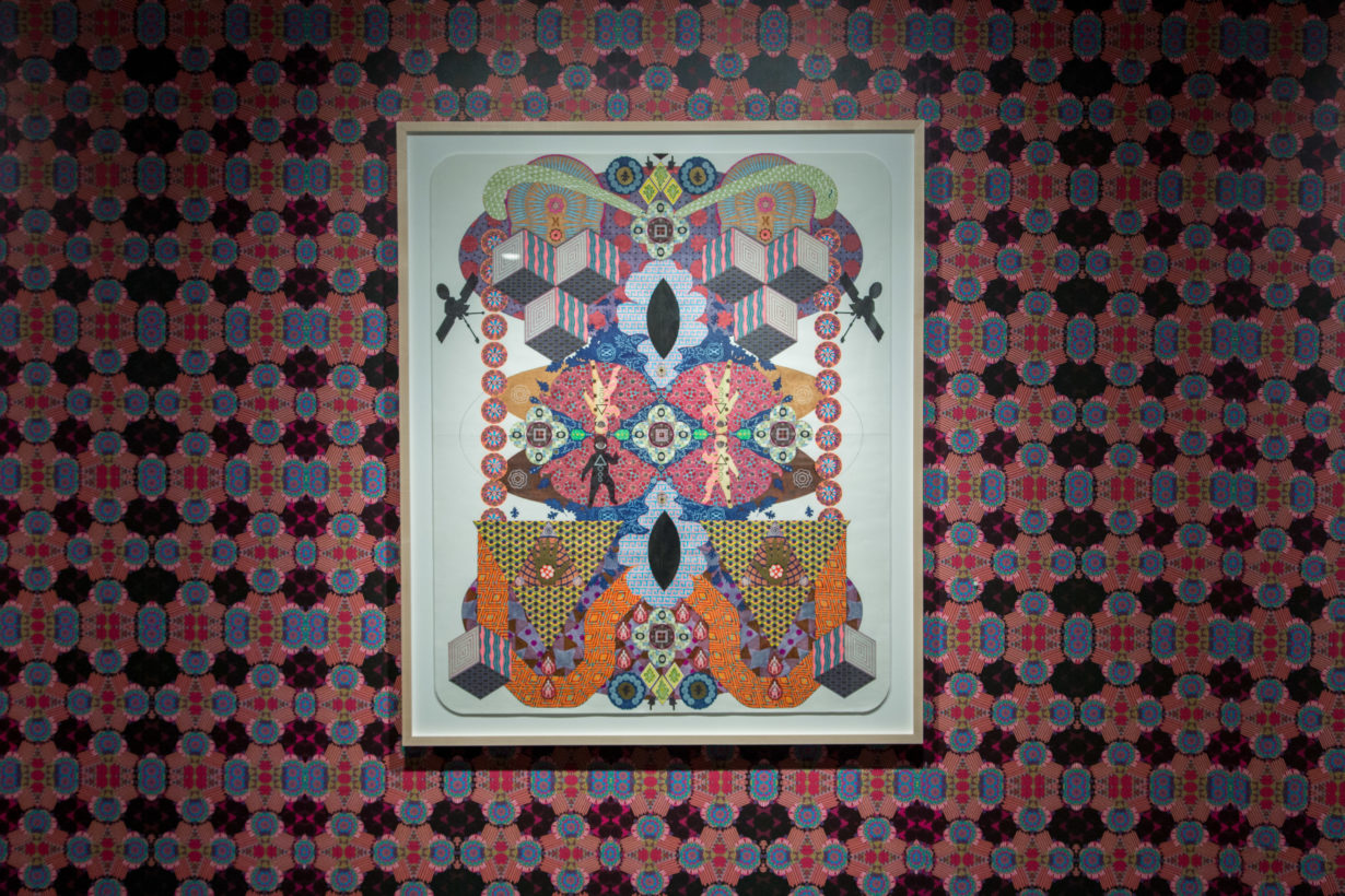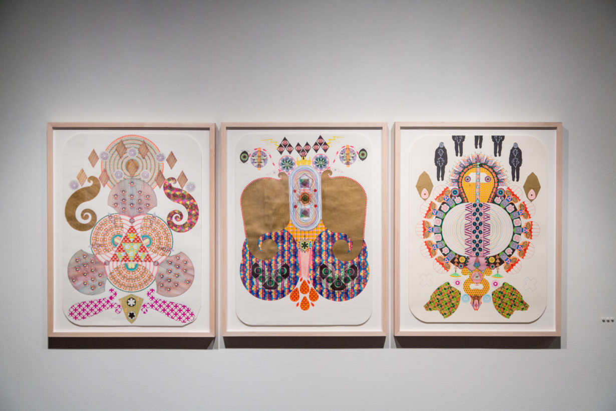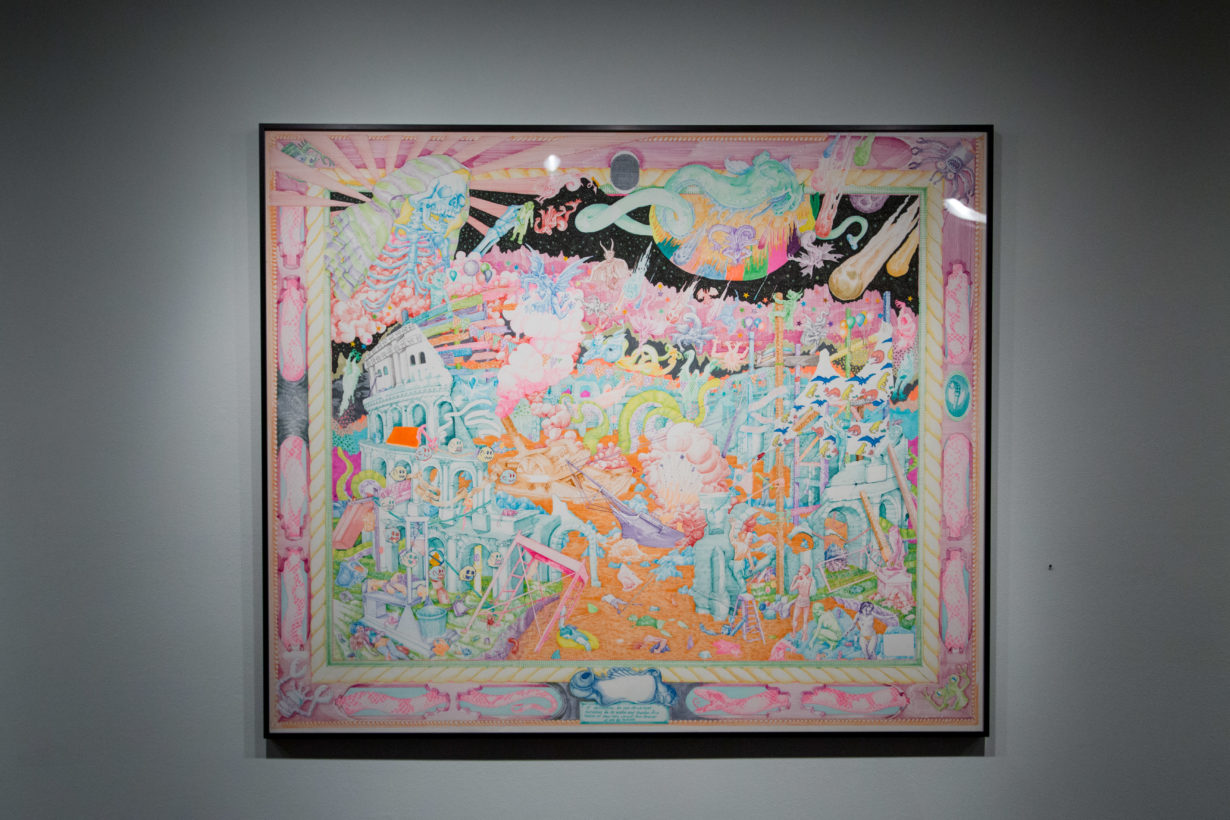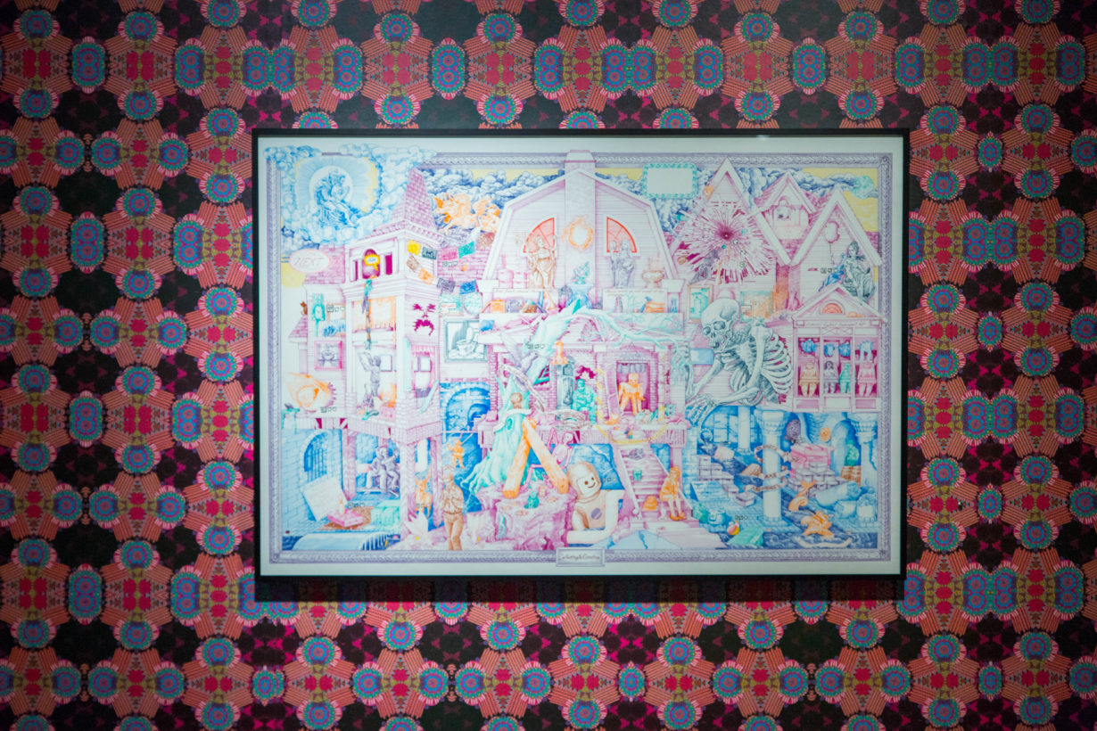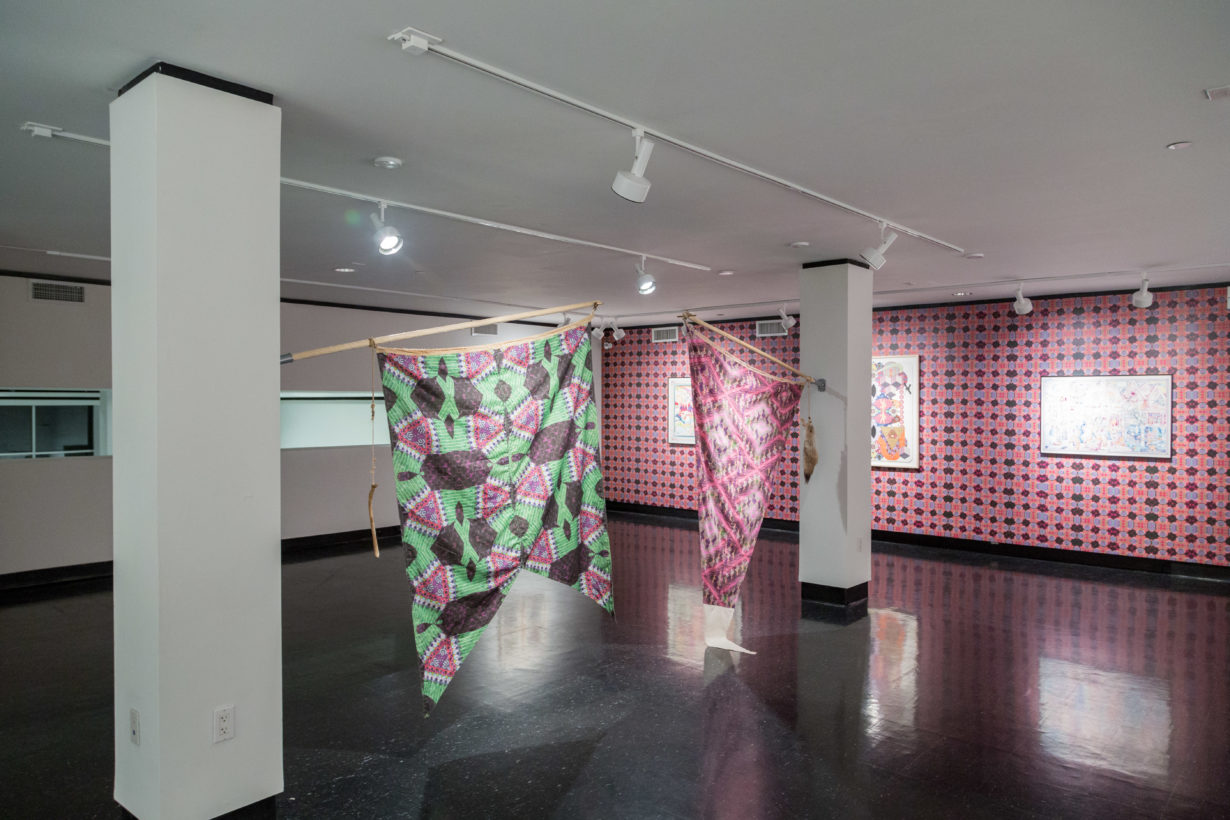 With an arsenal of 0.40-millimeter pens, Christopher Wallace and Samantha Persons tackle notions of narrative, pattern, and obsession. Surface Dwellers consists of drawings, wallpaper, sculpture, and nostalgia, with a dash of science-fiction. Persons and Wallace create non-hierarchical drawings using color as a means of collage and differentiation. The eye becomes visual saturated from the artists’ kenophobia. Looking to the history of printmaking—particularly Dürer, Goya and Schirmer—Wallace narrates such themes as nostalgia, technology, myth and Internet culture. Using hand-drawn pattern and symmetry Persons creates the illusion of mechanical production, highlighting topics of feminism, textiles and gender/queering. Embracing the empirical flatness of paper, Persons and Wallace question what it means to be terrestrial beings trapped in a self-contained starship traveling 1.3 million miles an hour through space.