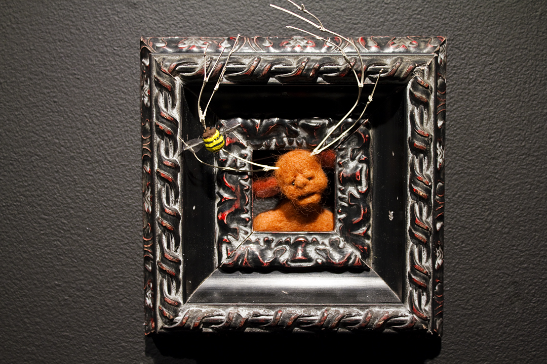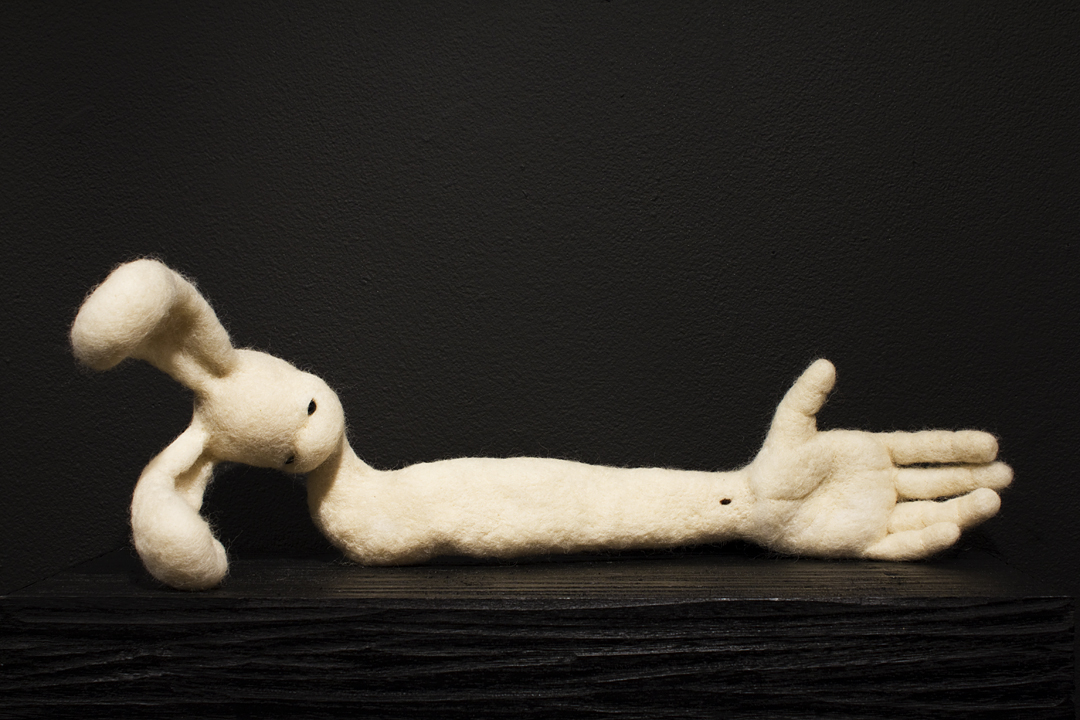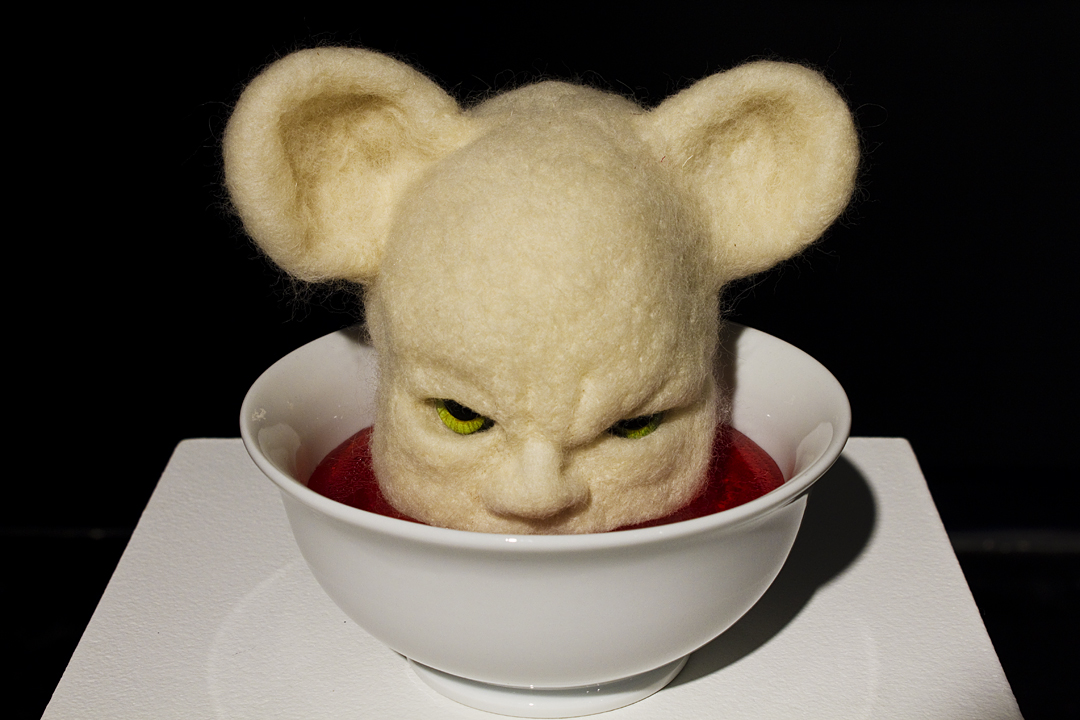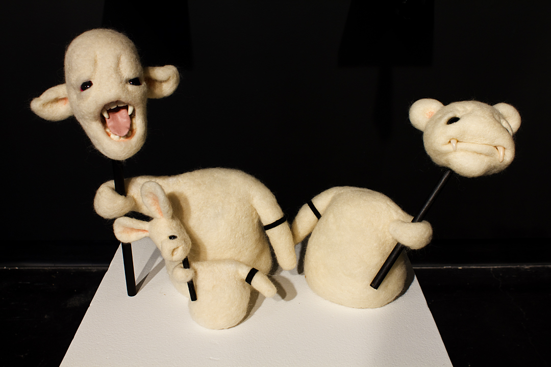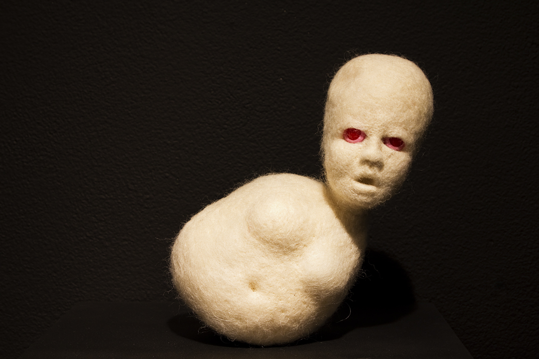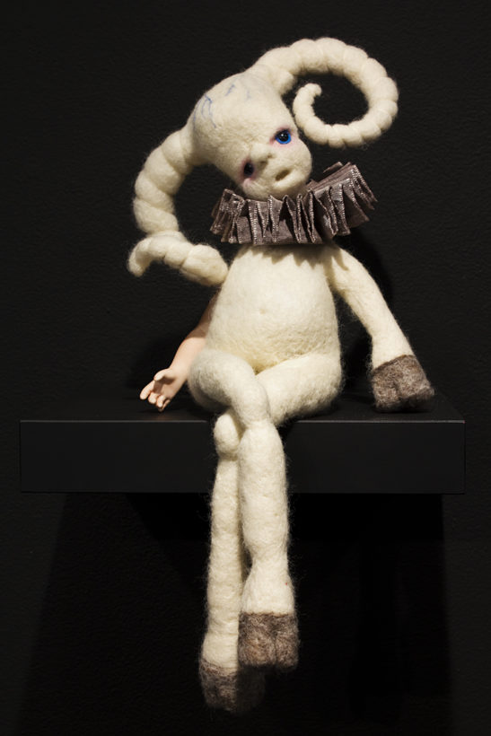 BEING is an exhibit of fantastical creatures realized through sculpted wool and fabric. These works by artist Tobiah Mundt interpret and explore how we read and react to human emotion through anthropomorphic and zoomorphic forms, rendering feelings through facial expression, color, shape, and physicality. Her works are created with a process called sculptural needle felting by which raw wool is shaped into three-dimensional form using barbed needles.