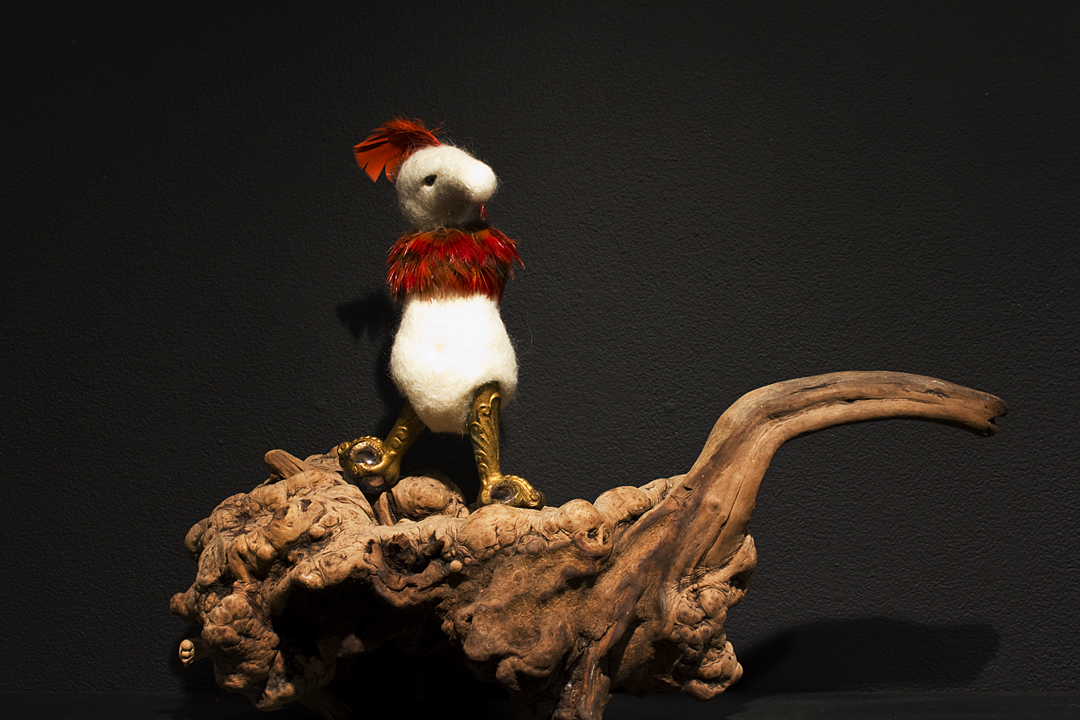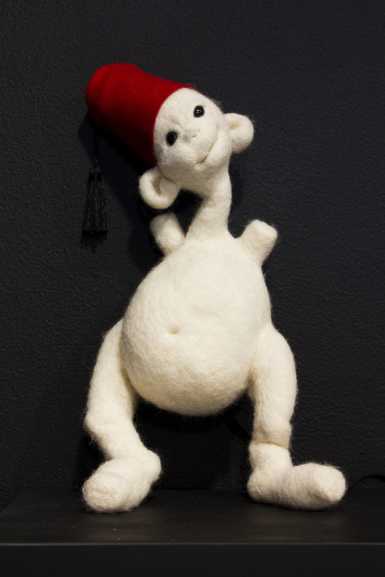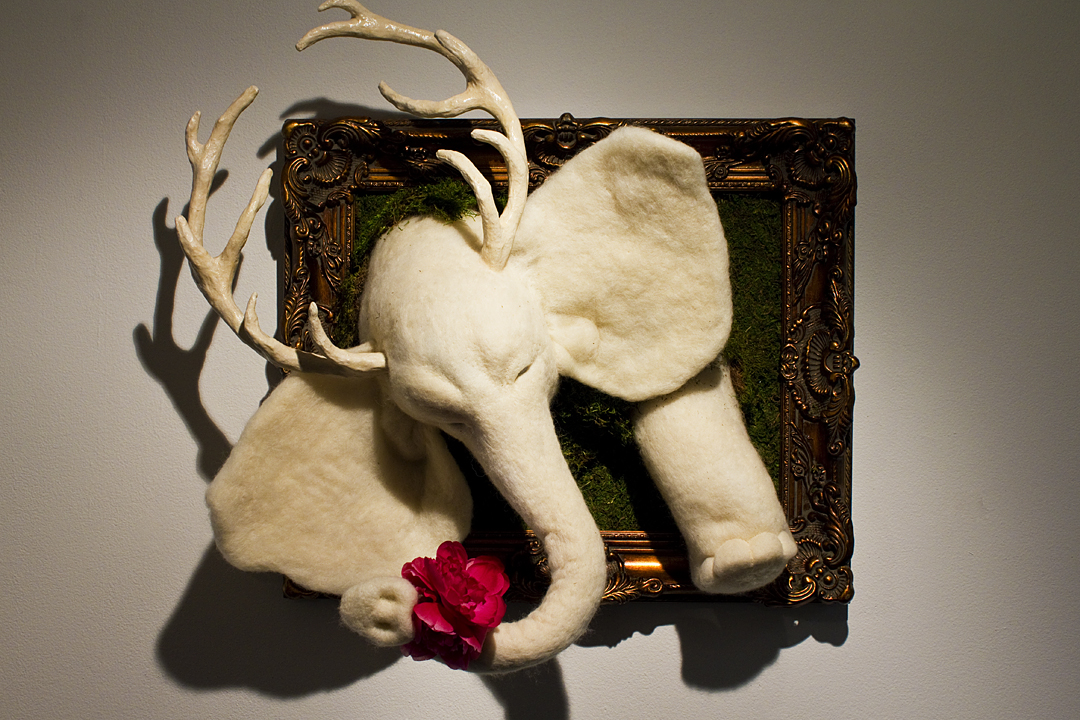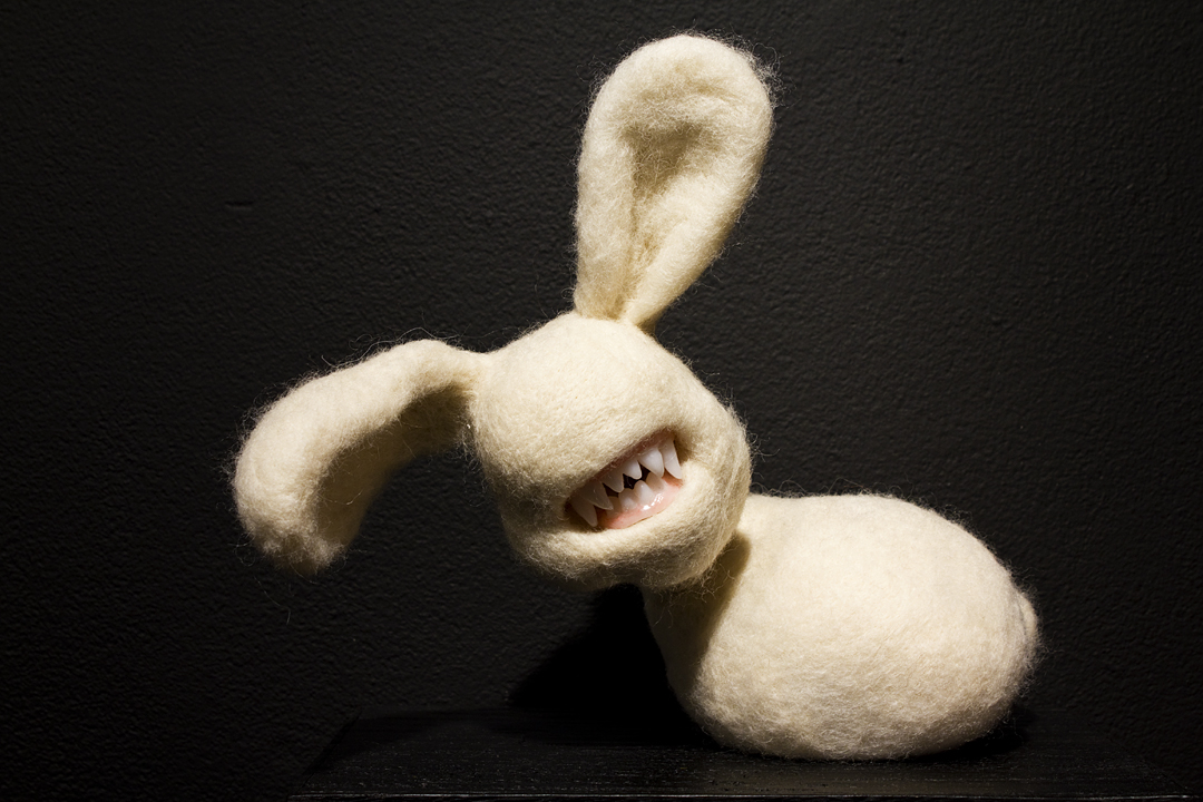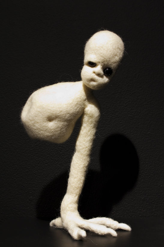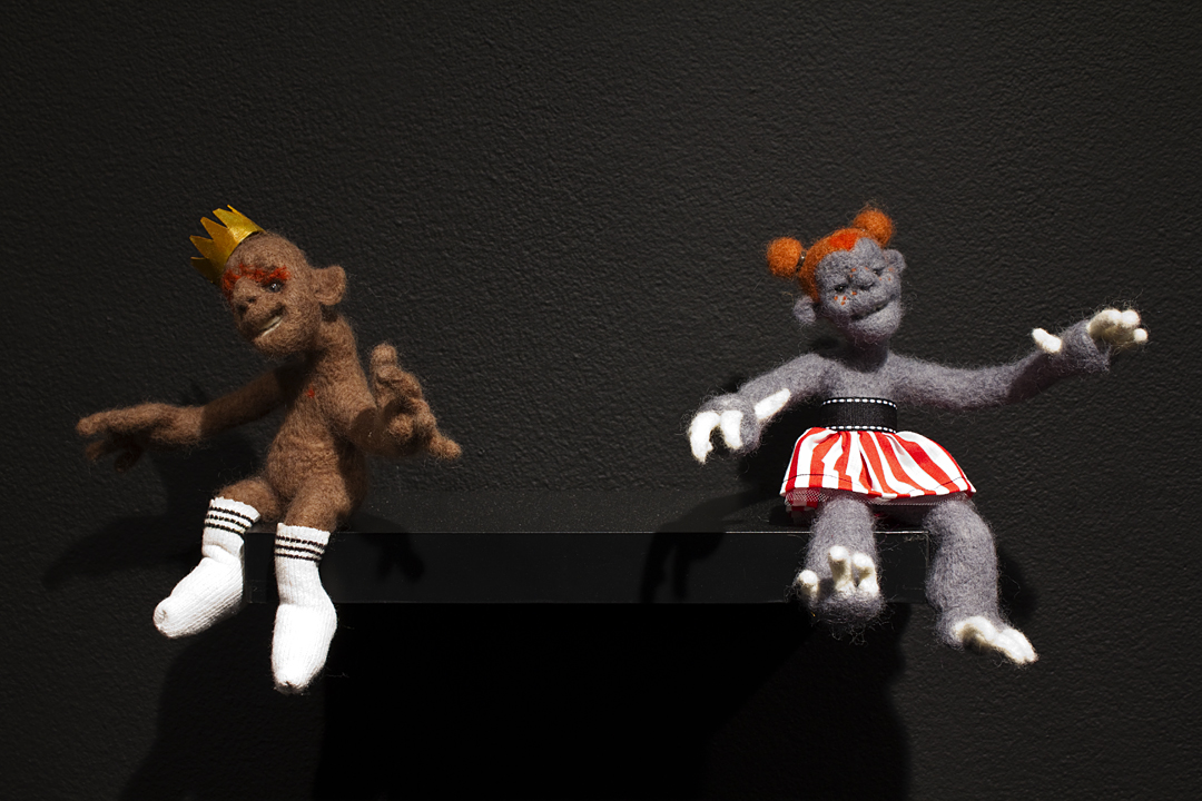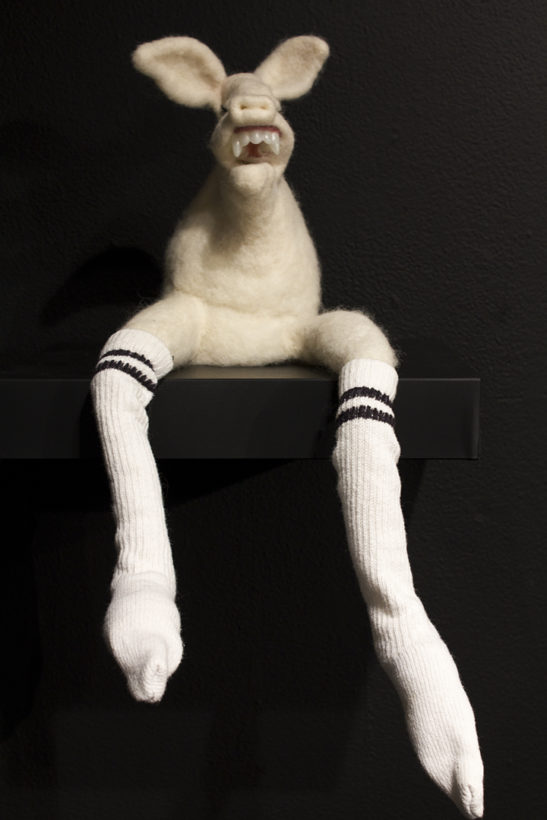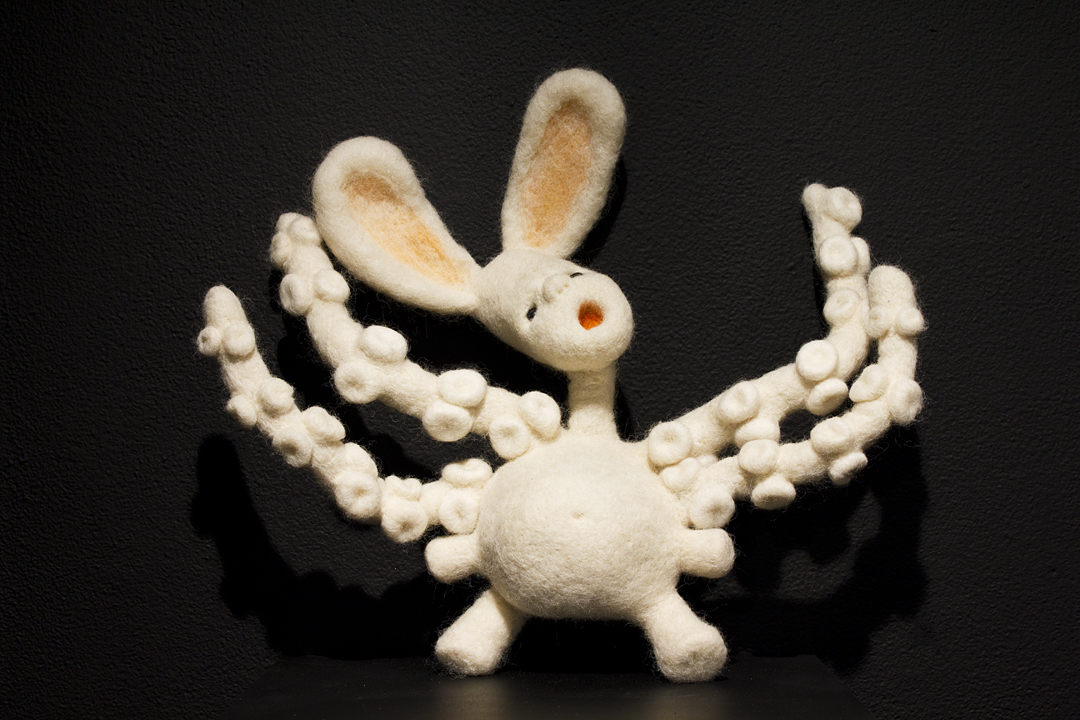 BEING is an exhibit of fantastical creatures realized through sculpted wool and fabric. These works by artist Tobiah Mundt interpret and explore how we read and react to human emotion through anthropomorphic and zoomorphic forms, rendering feelings through facial expression, color, shape, and physicality. Her works are created with a process called sculptural needle felting by which raw wool is shaped into three-dimensional form using barbed needles.