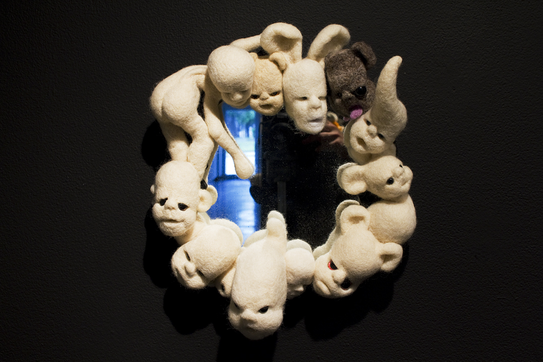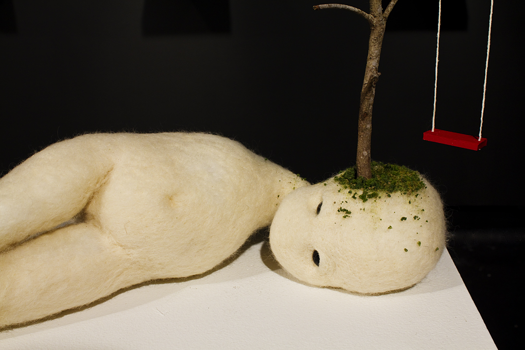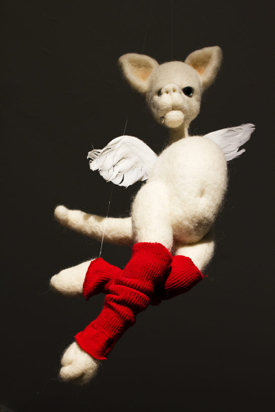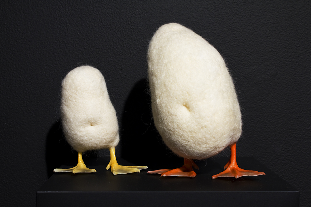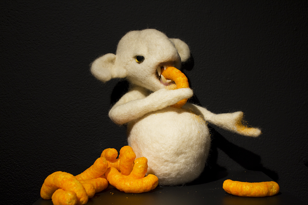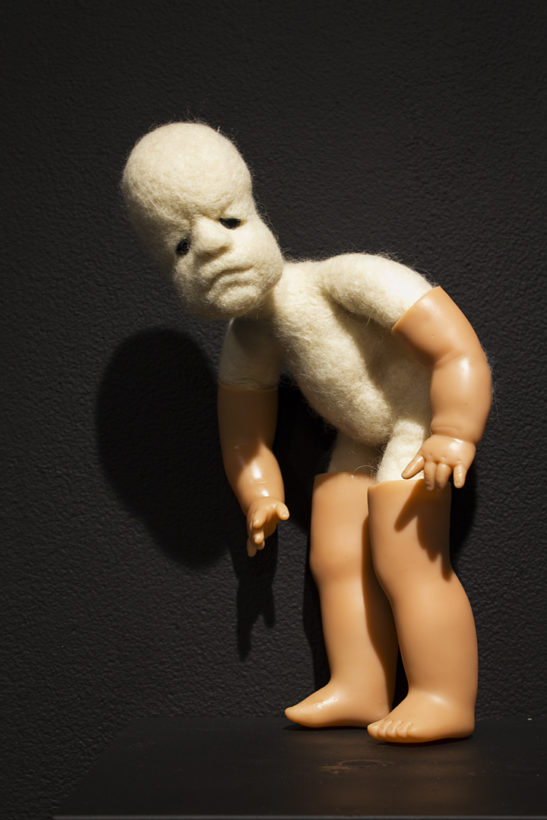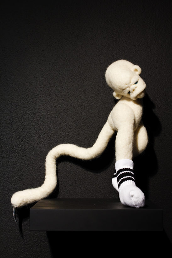 BEING is an exhibit of fantastical creatures realized through sculpted wool and fabric. These works by artist Tobiah Mundt interpret and explore how we read and react to human emotion through anthropomorphic and zoomorphic forms, rendering feelings through facial expression, color, shape, and physicality. Her works are created with a process called sculptural needle felting by which raw wool is shaped into three-dimensional form using barbed needles.
