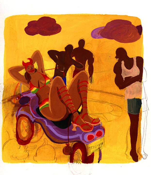 “The Elusive Quest of Freedom consists of 30 gouache paintings on paper that were completed during 2002 and 2003. The series is inspired by Black BikeWeek, an annual festival held in Atlantic Beach, South Carolina. In its salacious voyeurism and exhibitionism, the event has been compared to other sexually charged explosions of black youth culture such as Atlanta’s”Freaknik” and Daytona’s Black College Reunion.